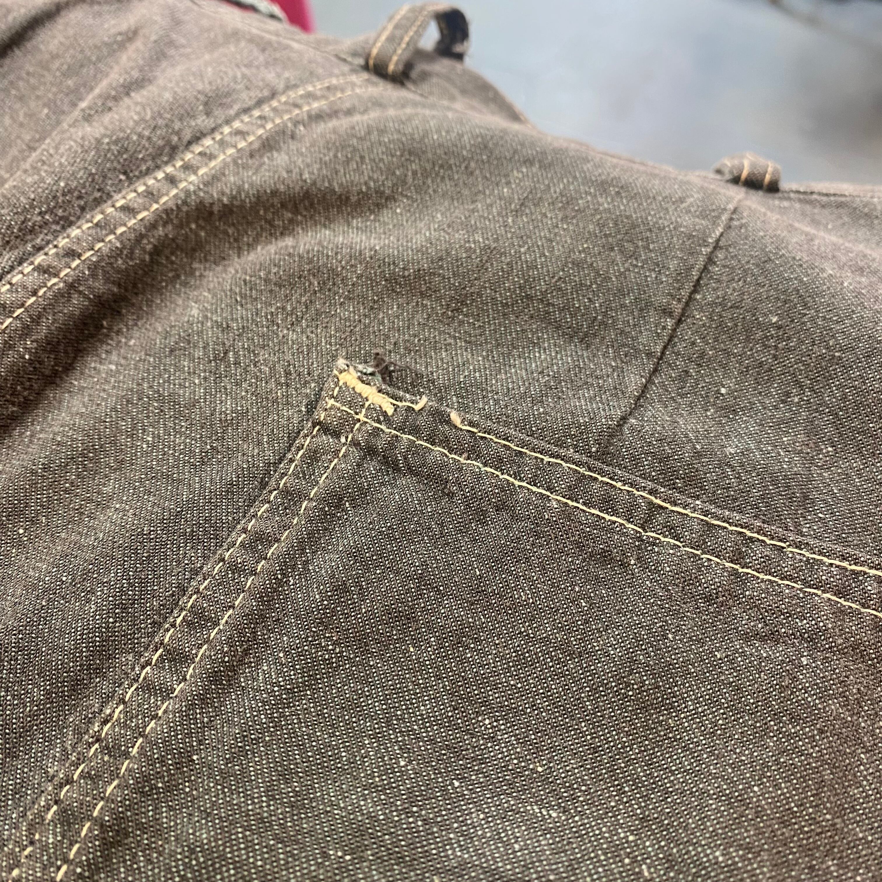 また軽度の糸飛びやポケットにはうっすらとした丸い跡が見受けられますが、こちらもあまり気にならない程度かと思われます。