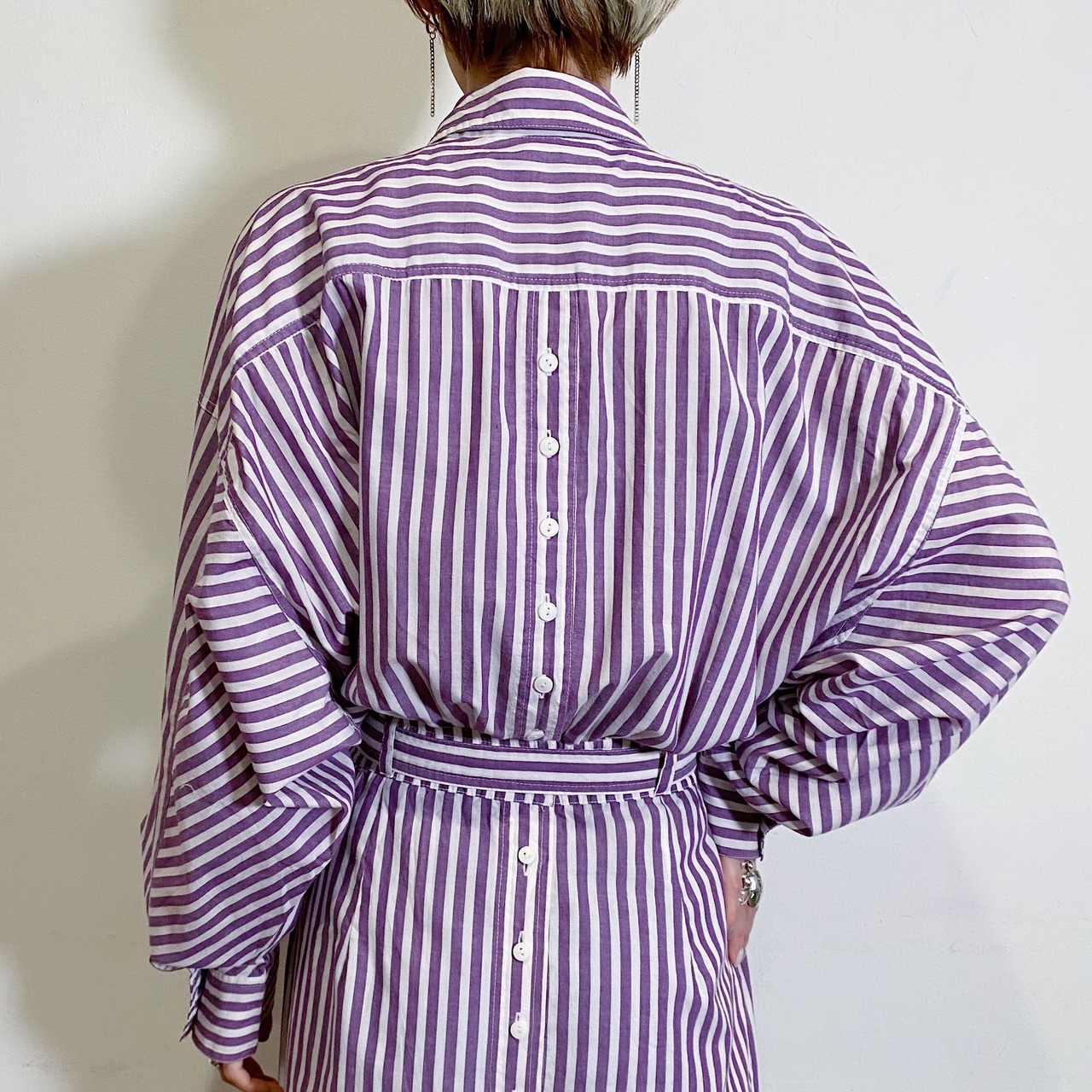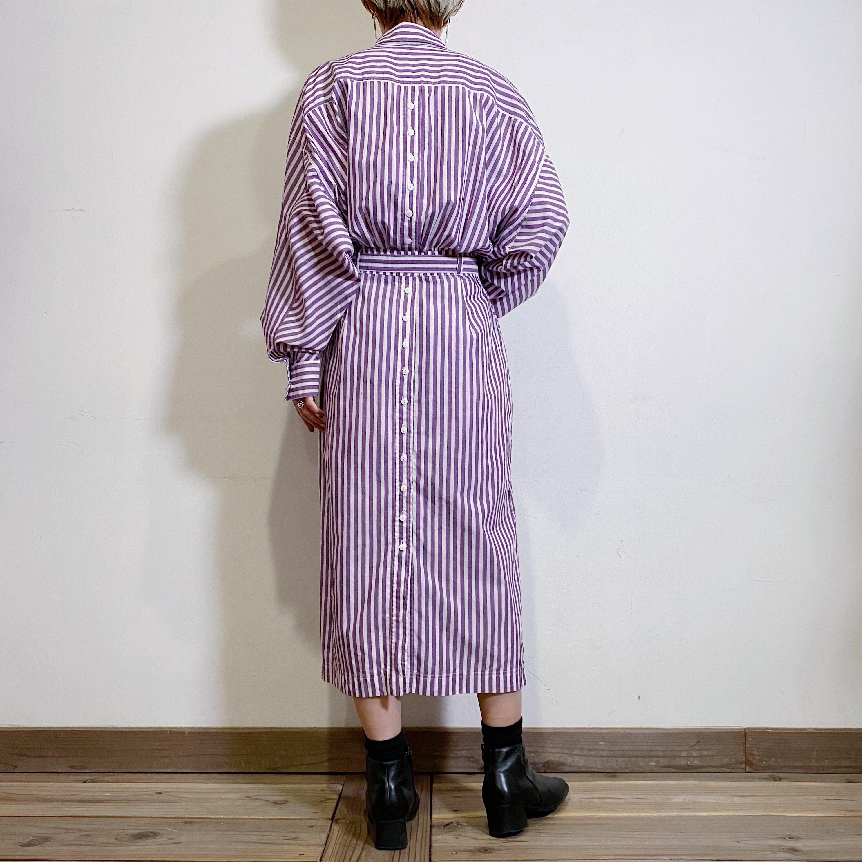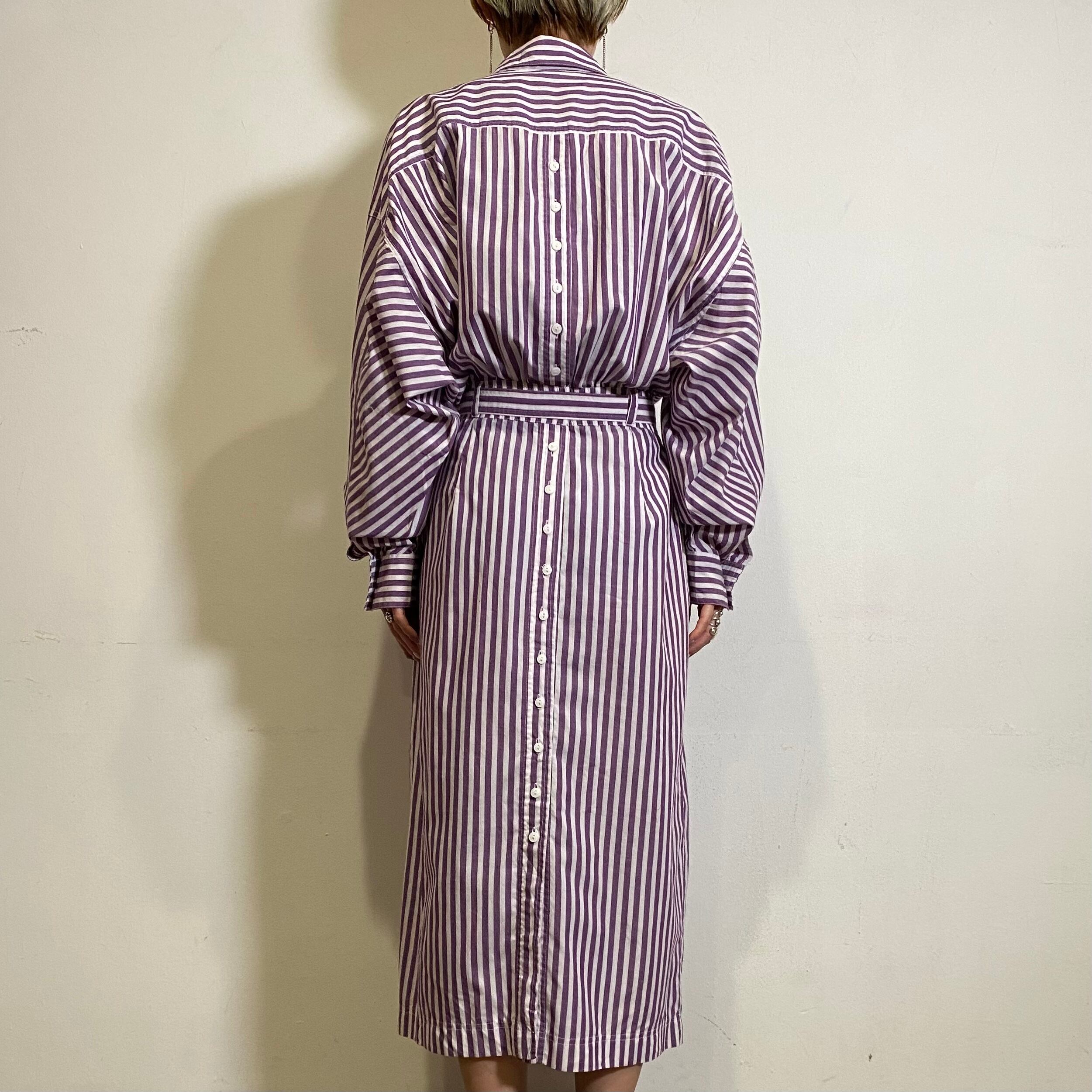 パープルとホワイトのストライプが可愛い、80年代のシャツワンピースです。
