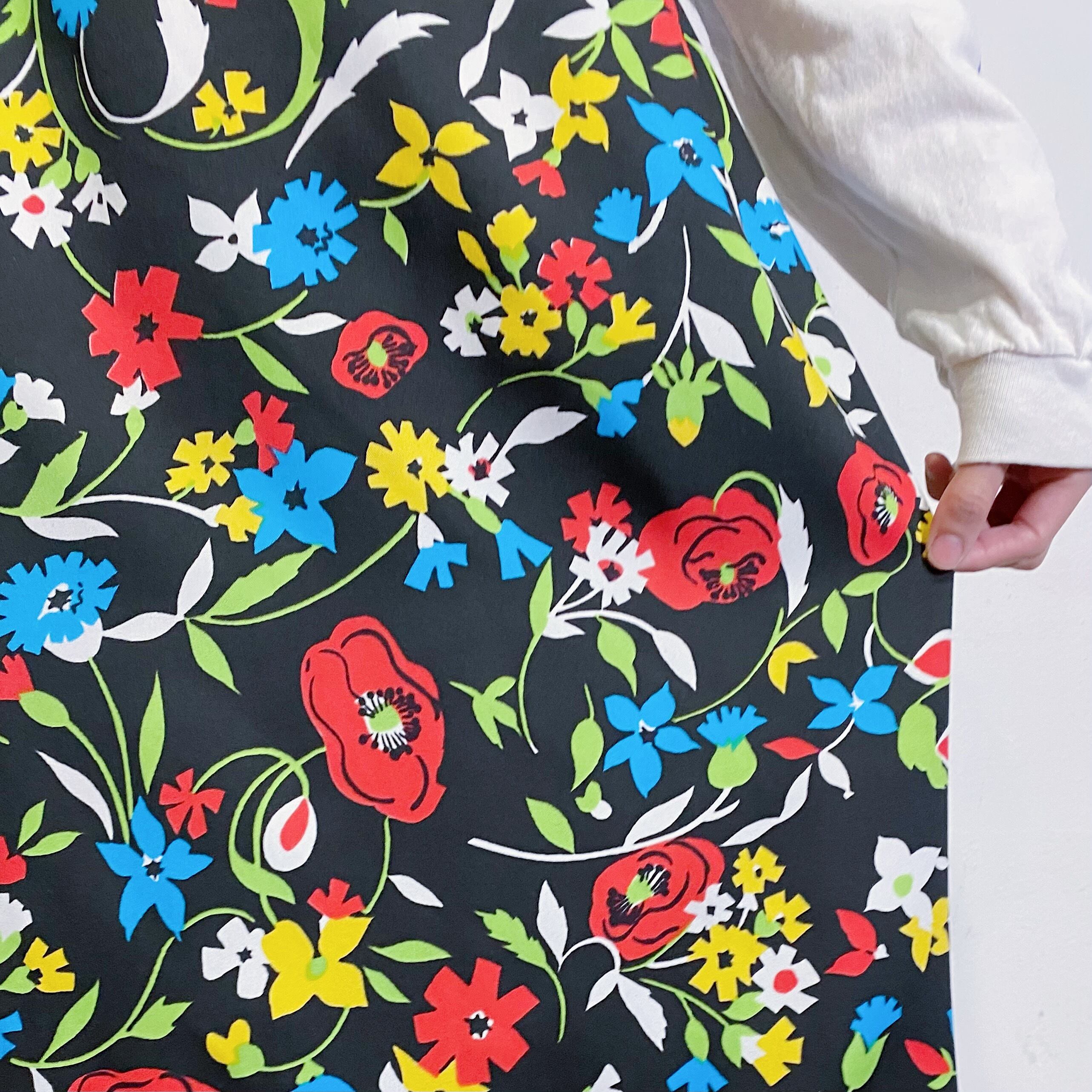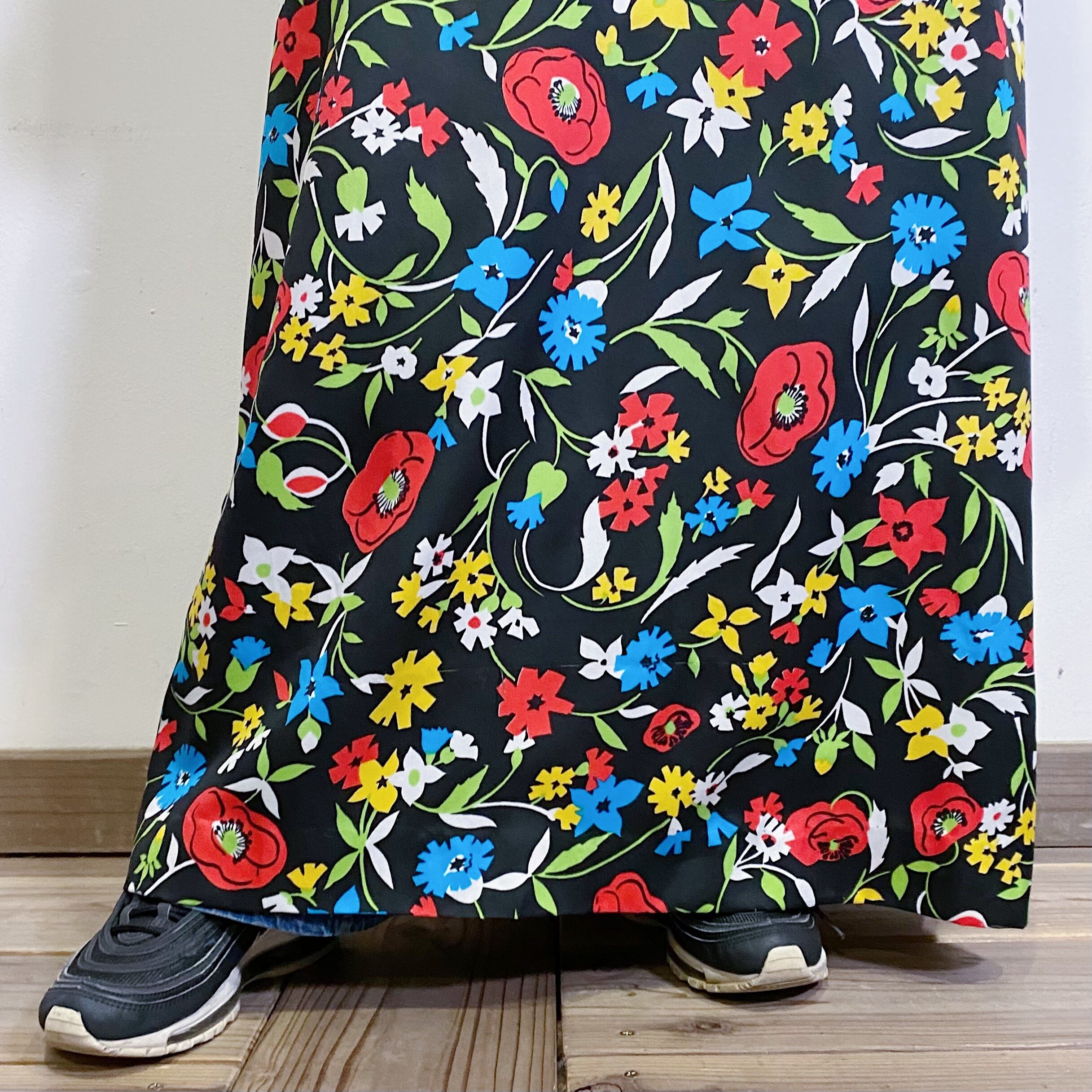 ブラックベースにカラフルな花柄が映える、70年代のワンピースです。