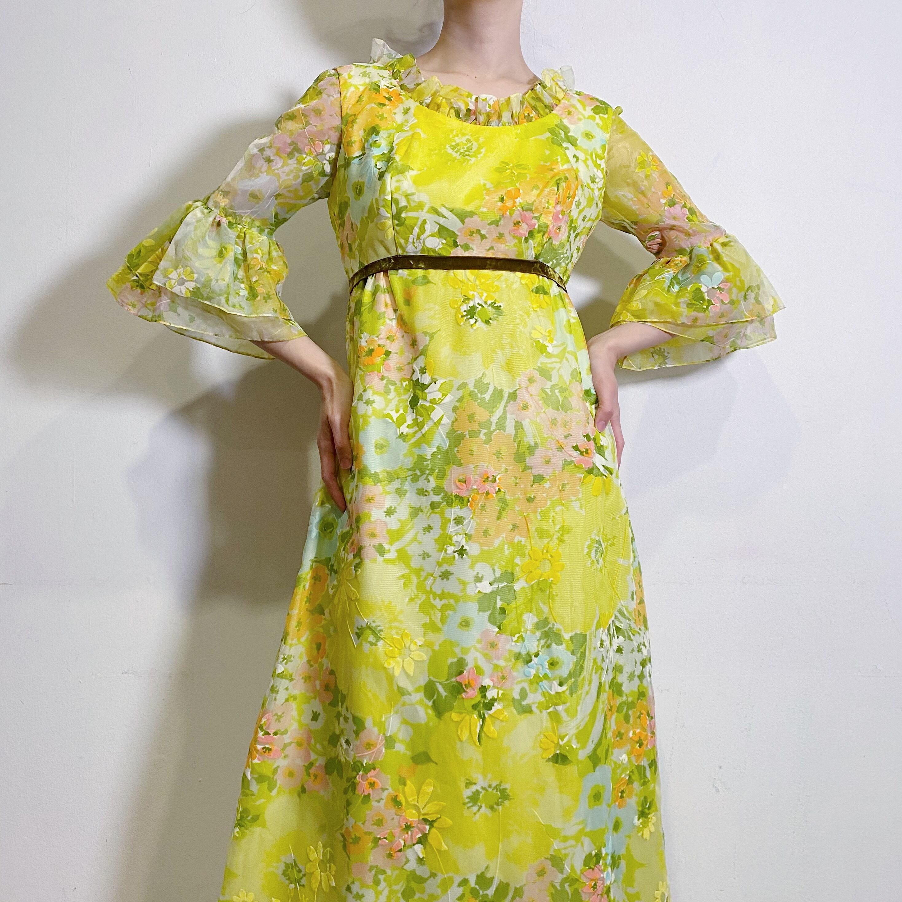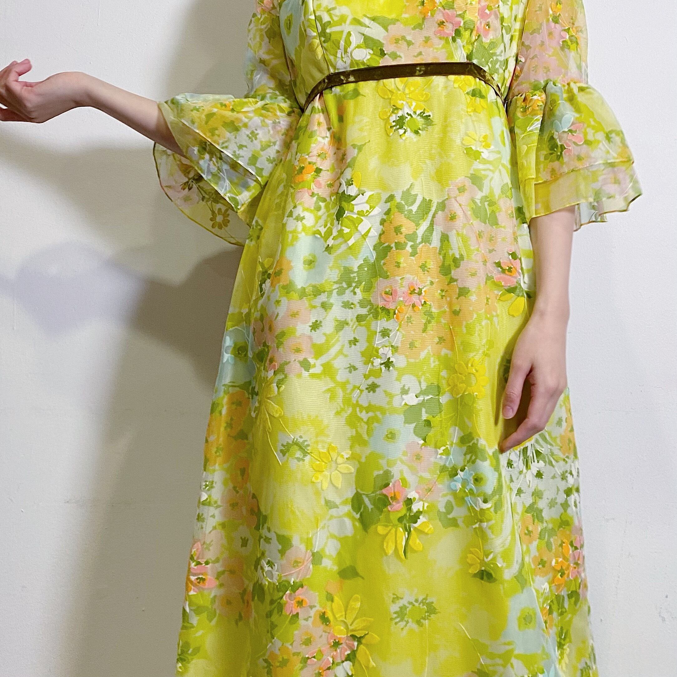 ハッピーなイエローカラーにフロッキーでプリントされた花柄が可愛い、60年代のワンピースです。