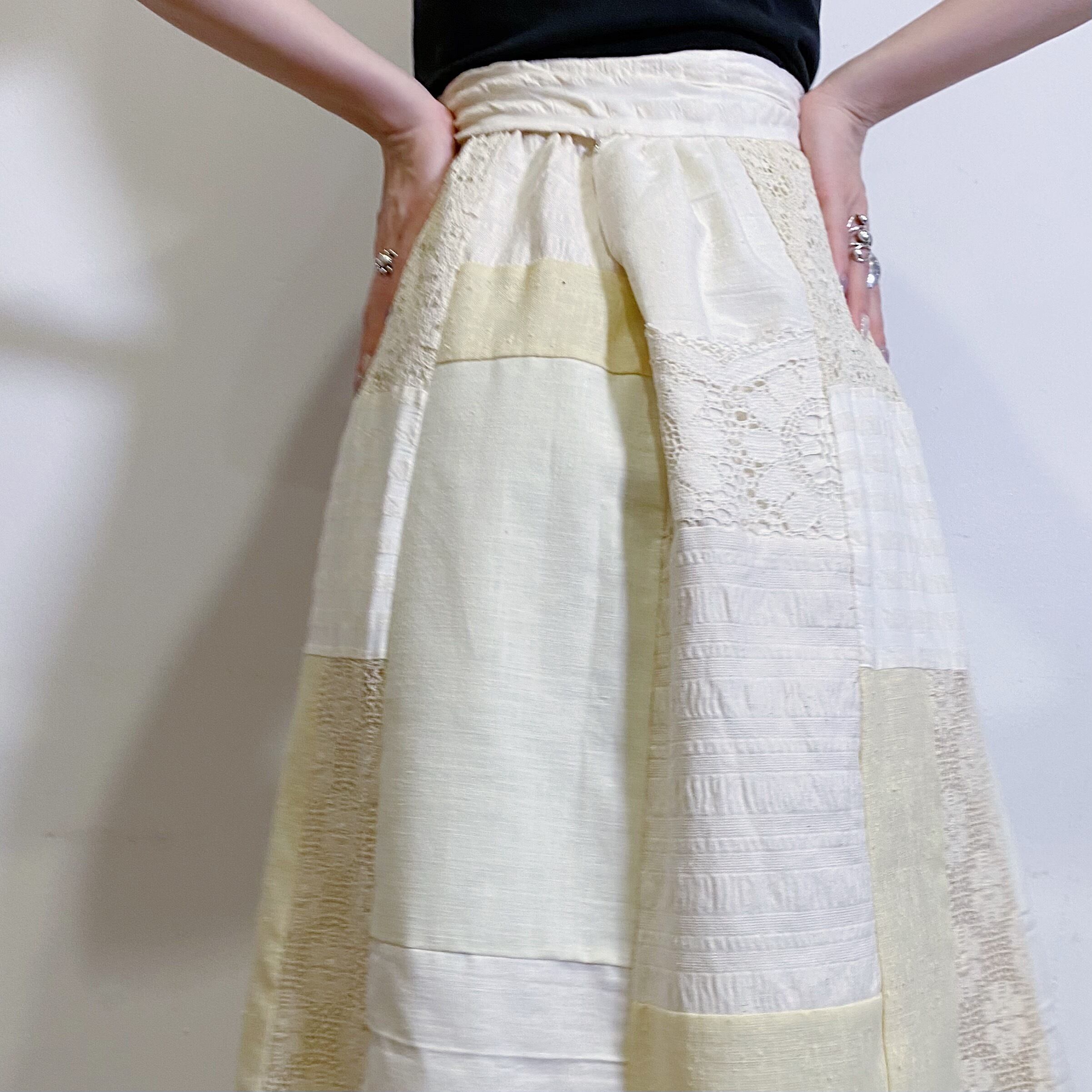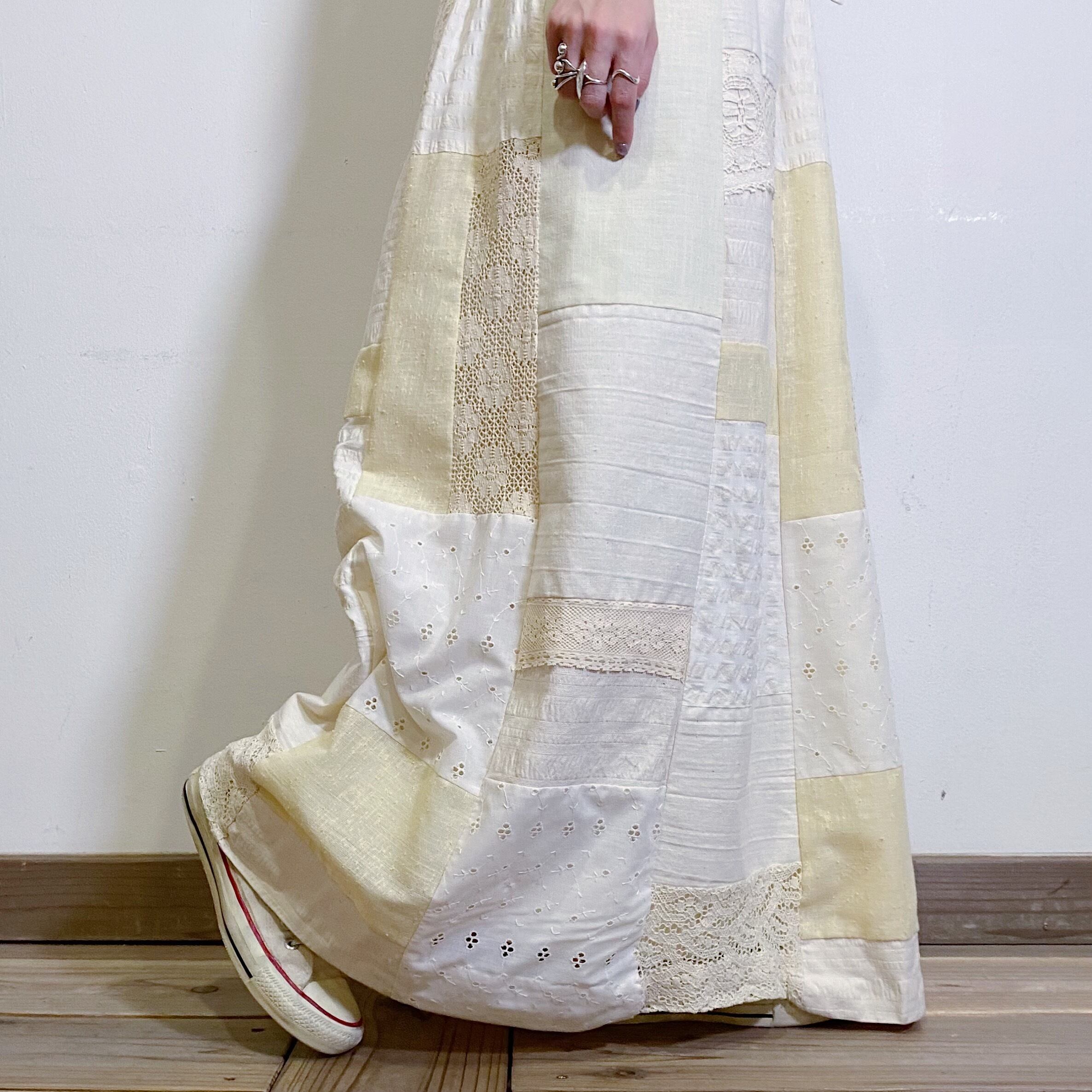 様々なレース生地などのリアルパッチワークがとても素敵な、70年代のロングスカートです。