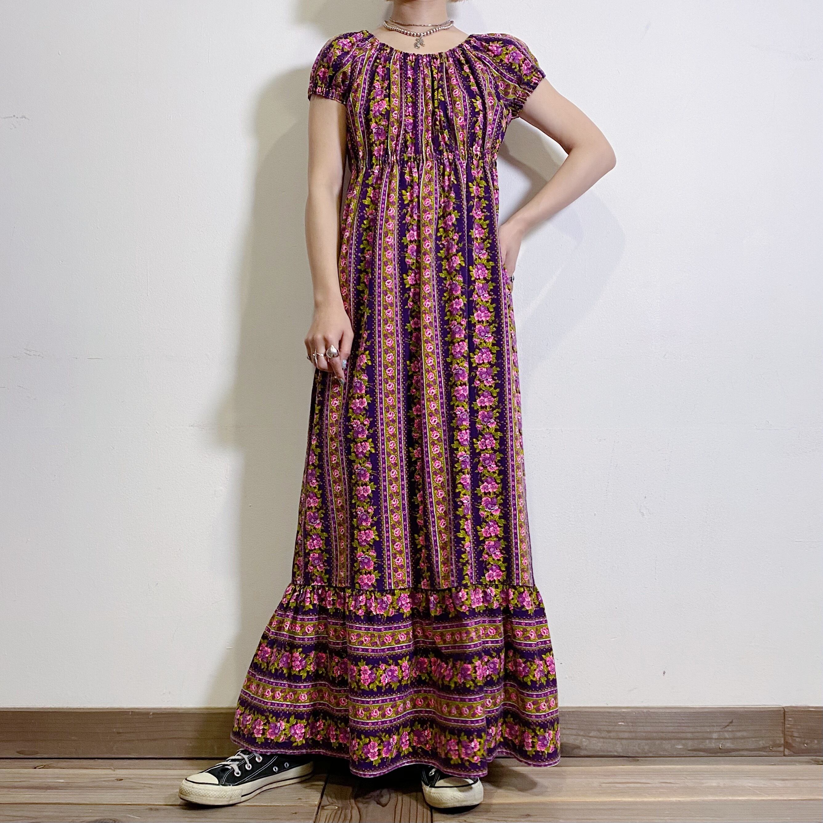 パープルベースの花柄が可愛い、70年代の半袖ワンピースです。