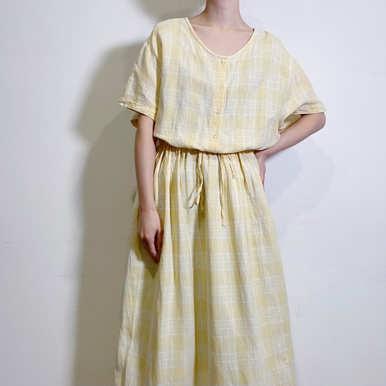 淡いイエローのチェック柄が可愛い、90年代のロングワンピースです。