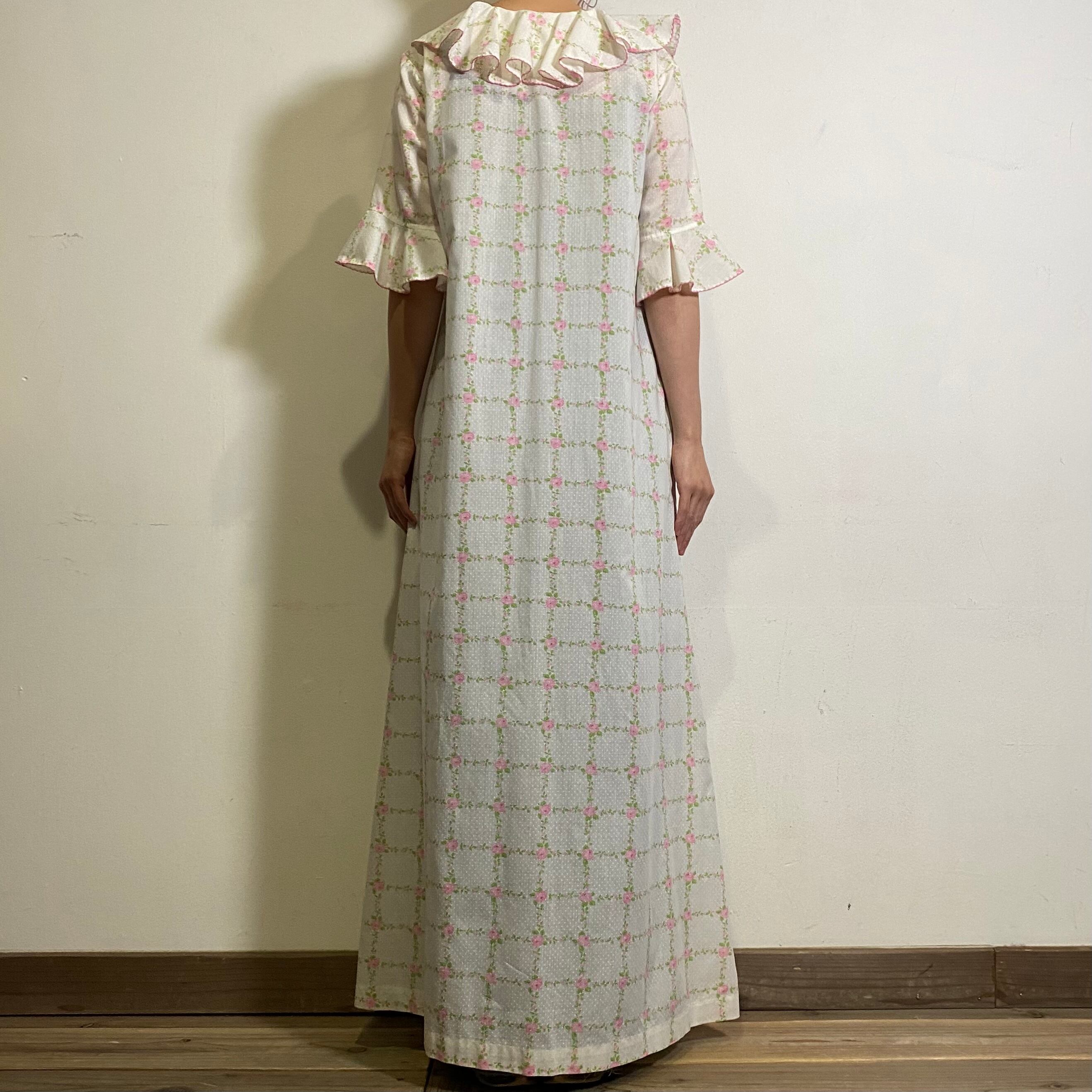 薔薇のようなお花で出来たチェック柄が可愛い、70年年代のロングワンピースです。