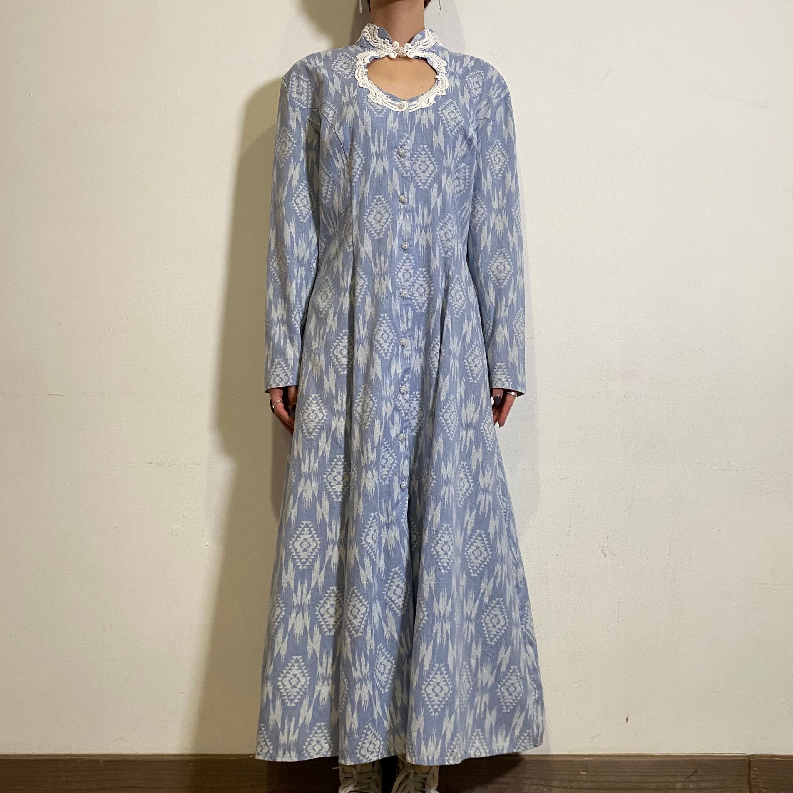 サックスブルーベースにネイティブ柄が可愛い、80年代のワンピースです。