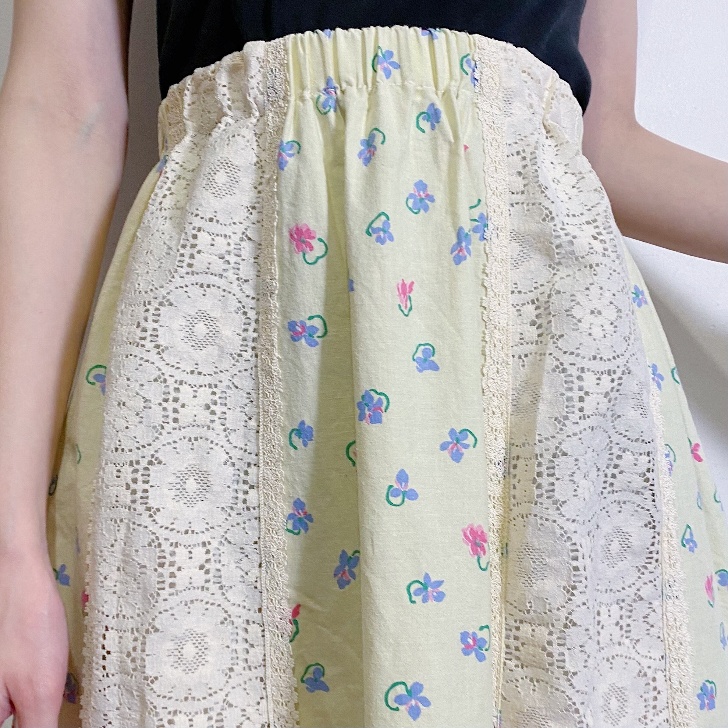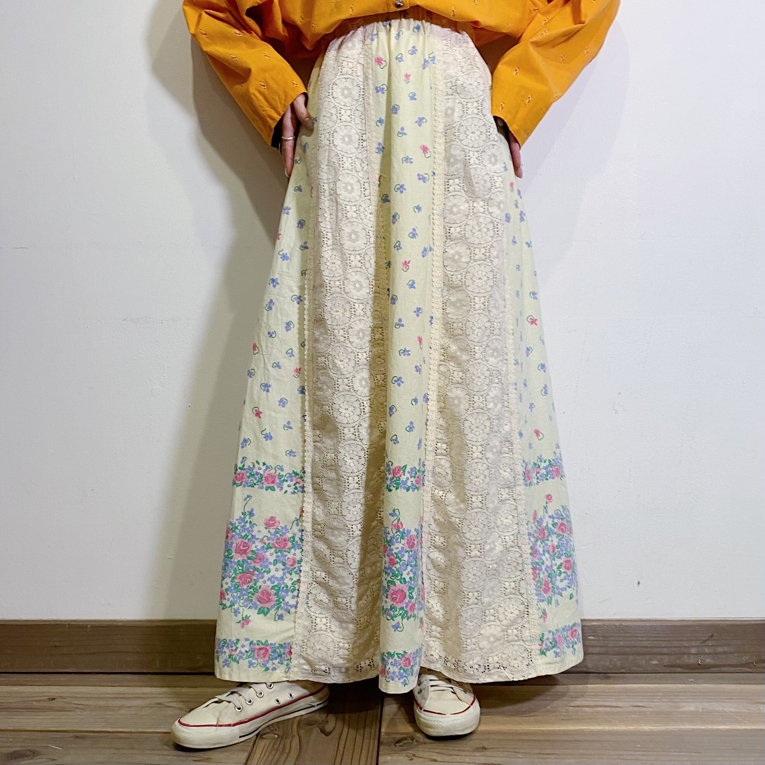 水色とピンクの花柄が可愛い、70年代のロングスカートです。