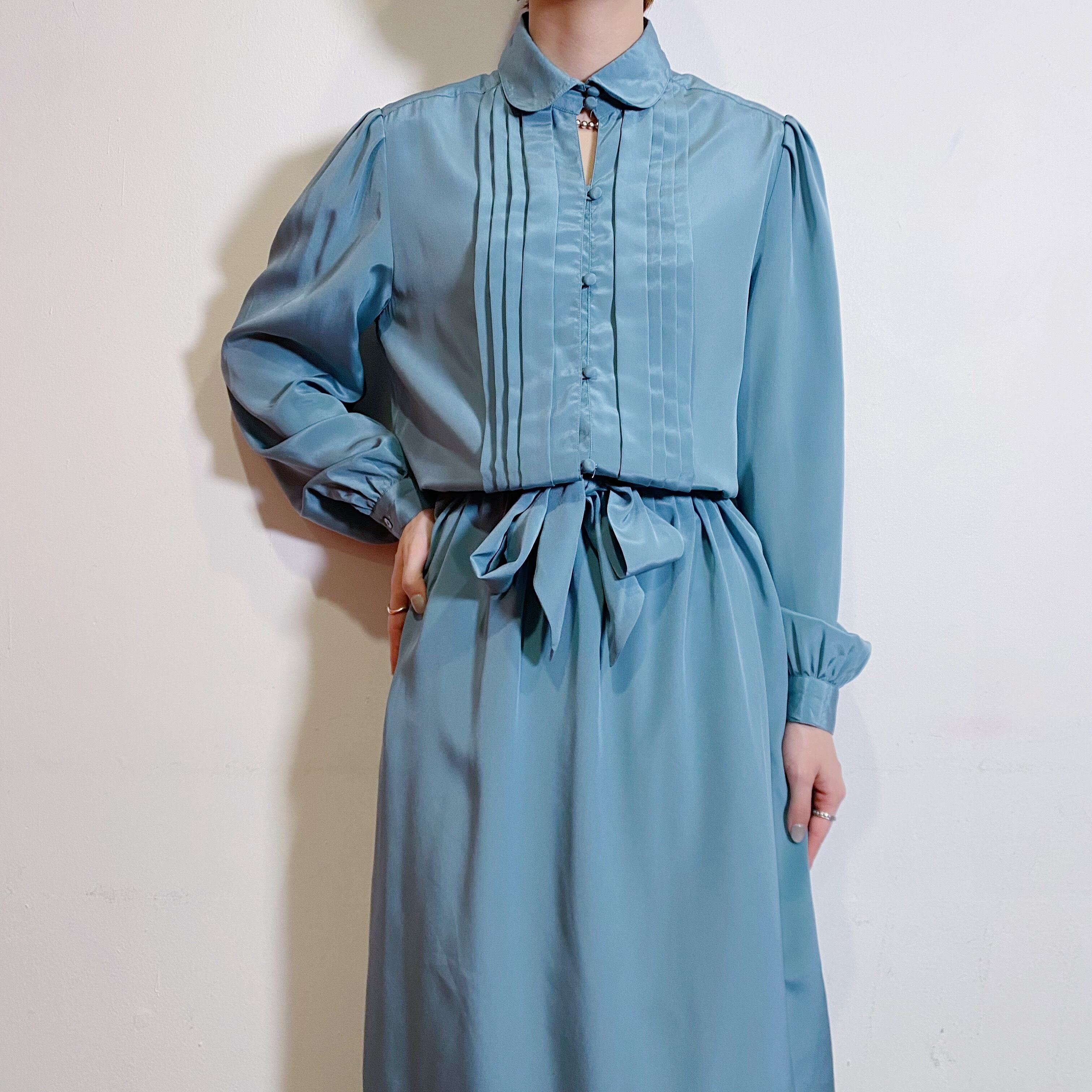 ブルーとグリーンの中間のような絶妙なくすみカラーが可愛い、シャツワンピースです。