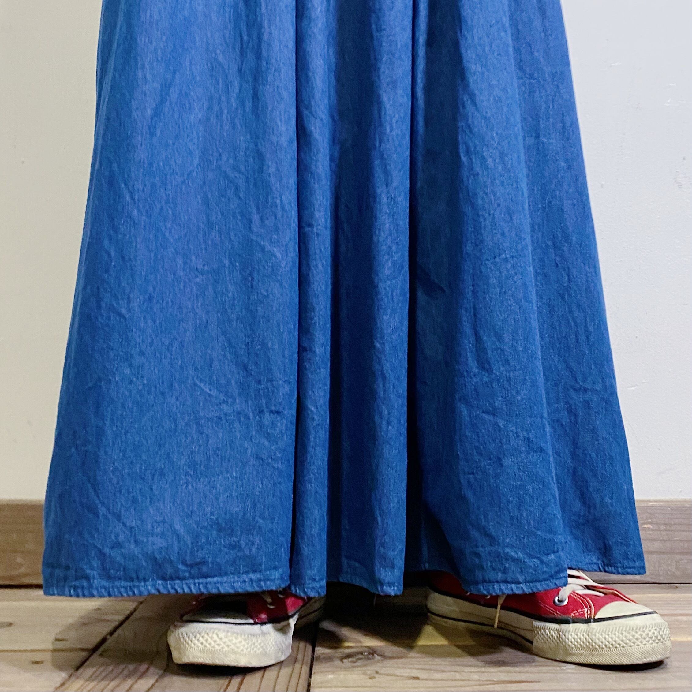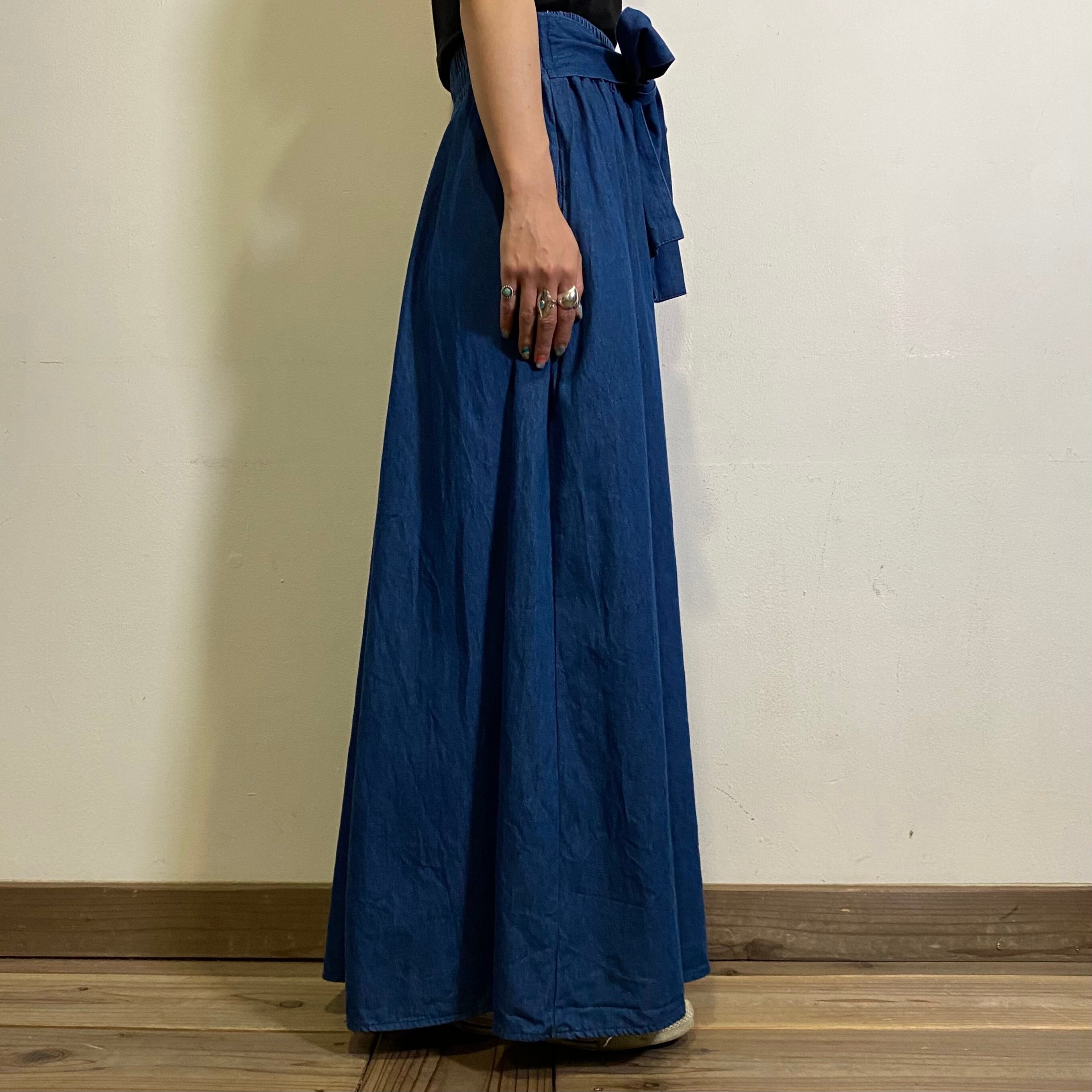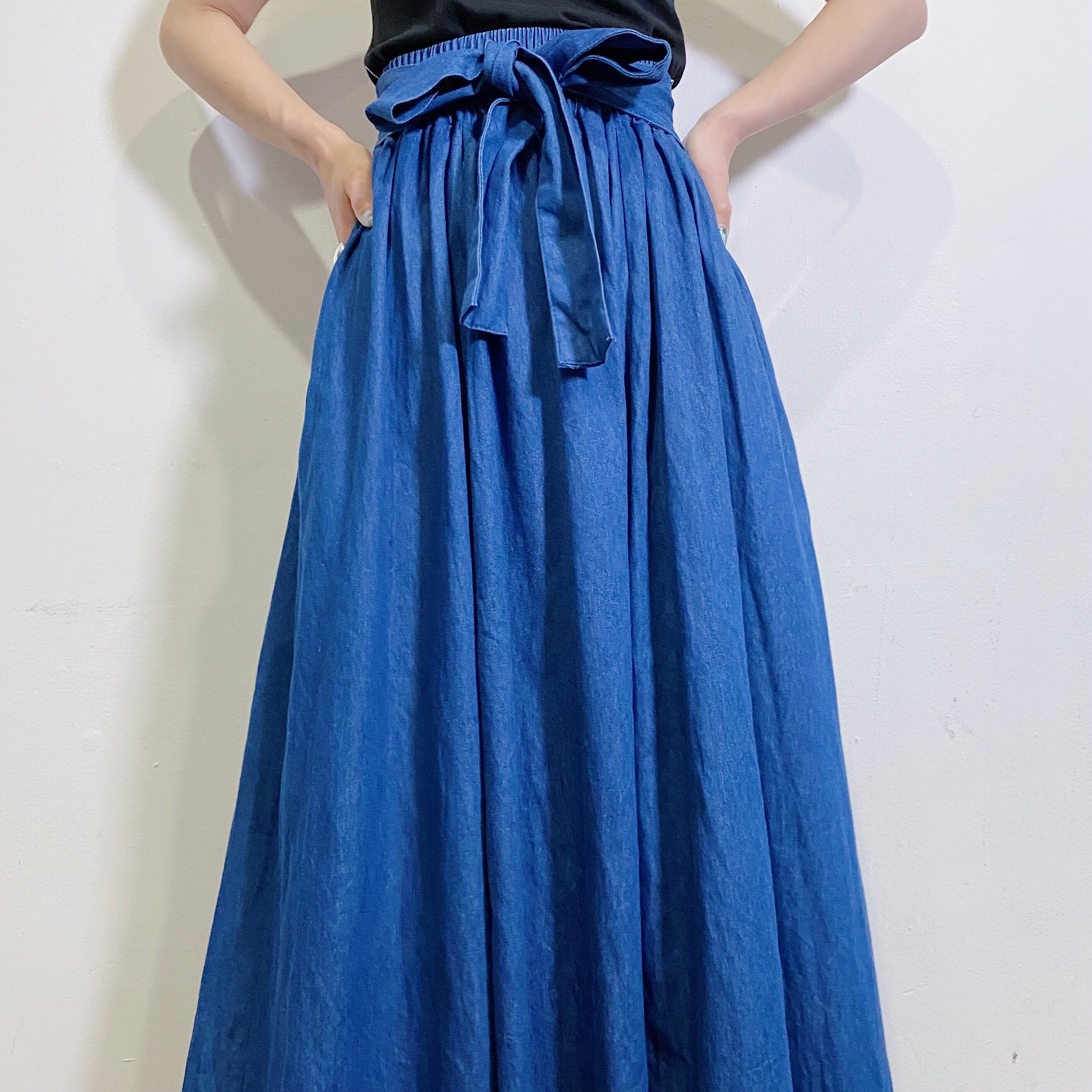 big ribbon denim long flare skirt
