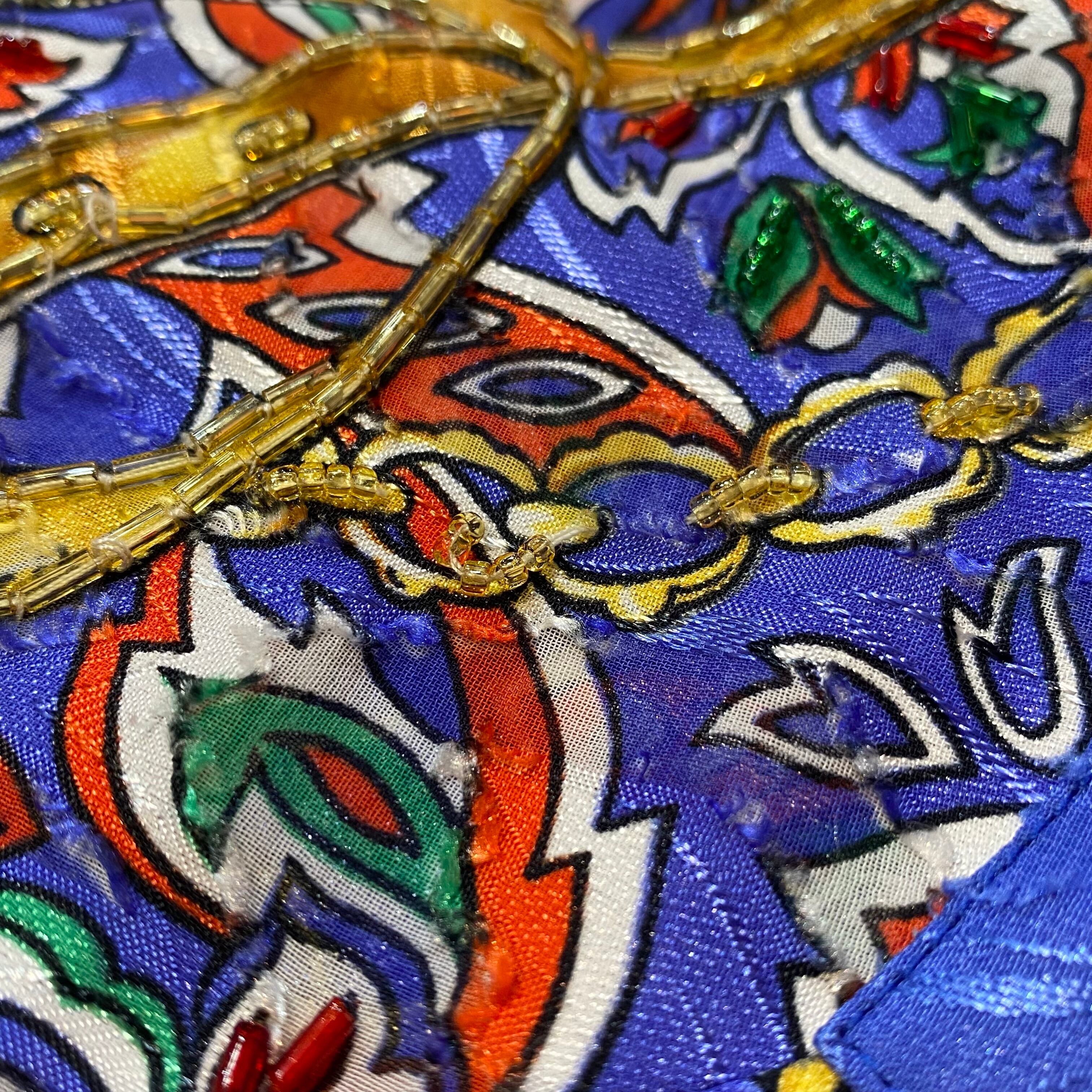 チェーンやベルト・葉っぱモチーフなどの柄の上に、贅沢にあしらわれたビーズがとても凝ったデザインで素敵。