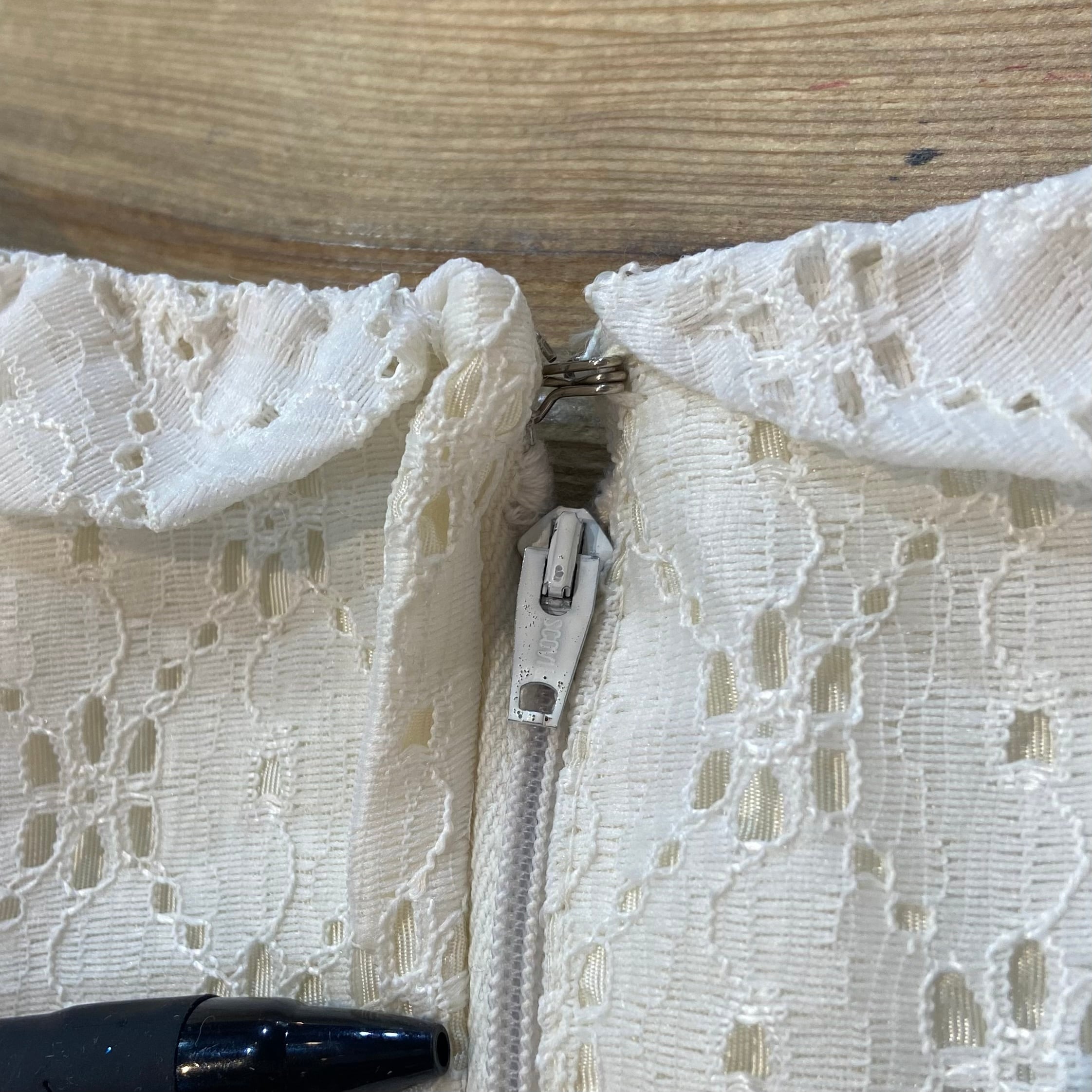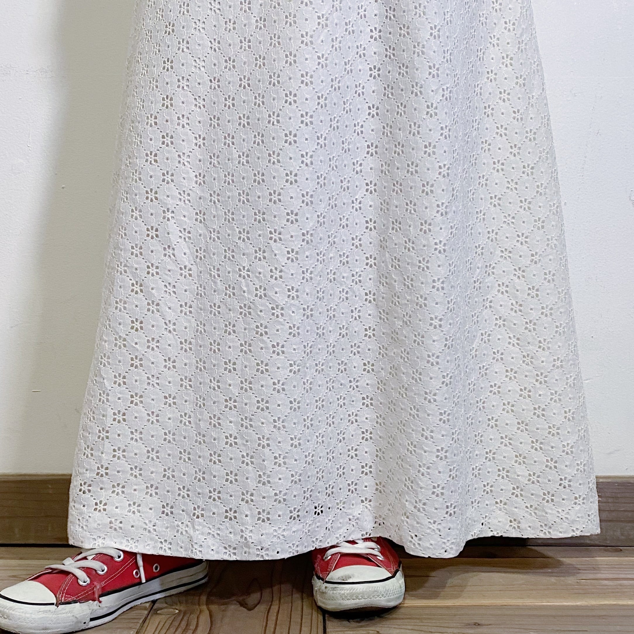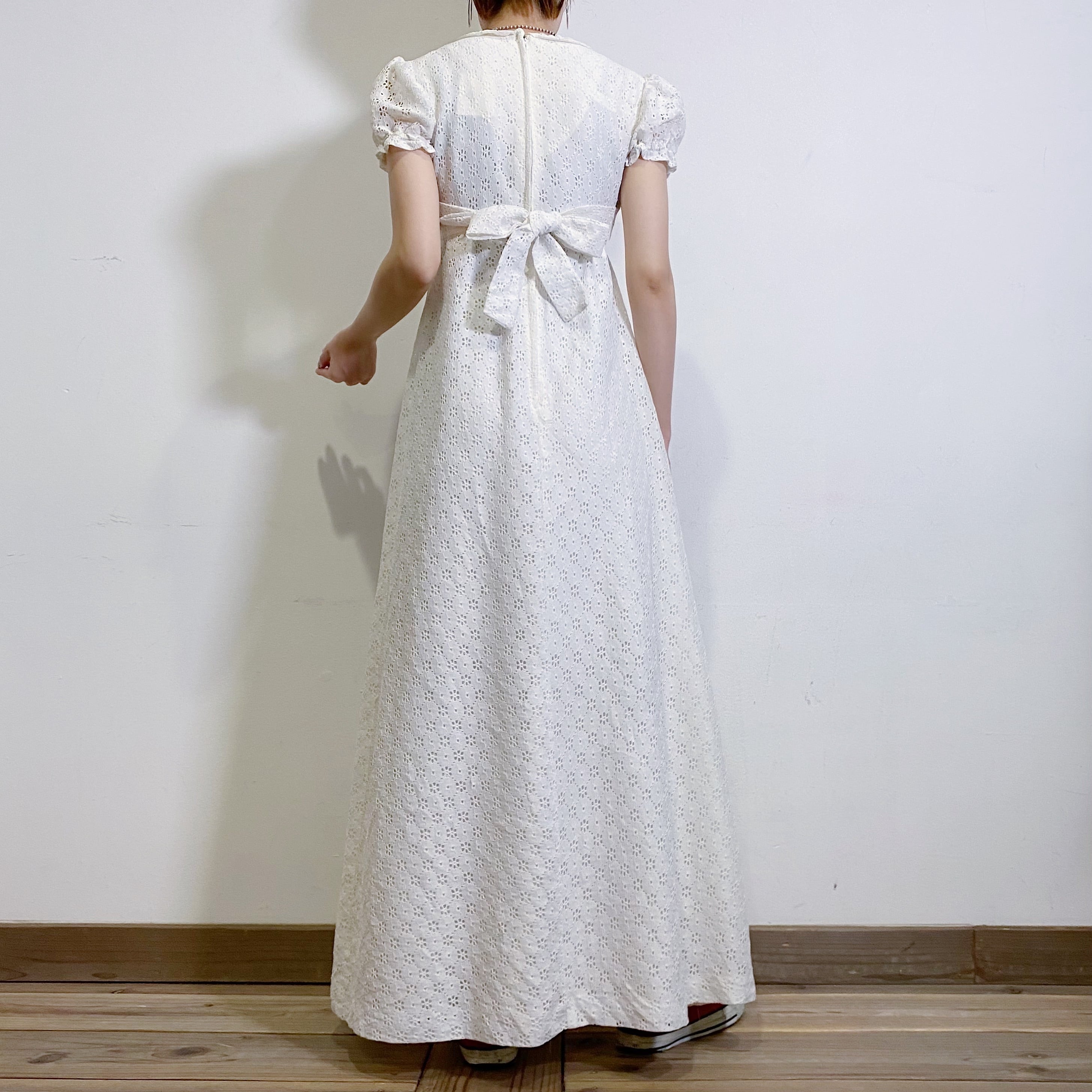 ホワイトカラーの総レースが可愛い、70年代の半袖ワンピースです。