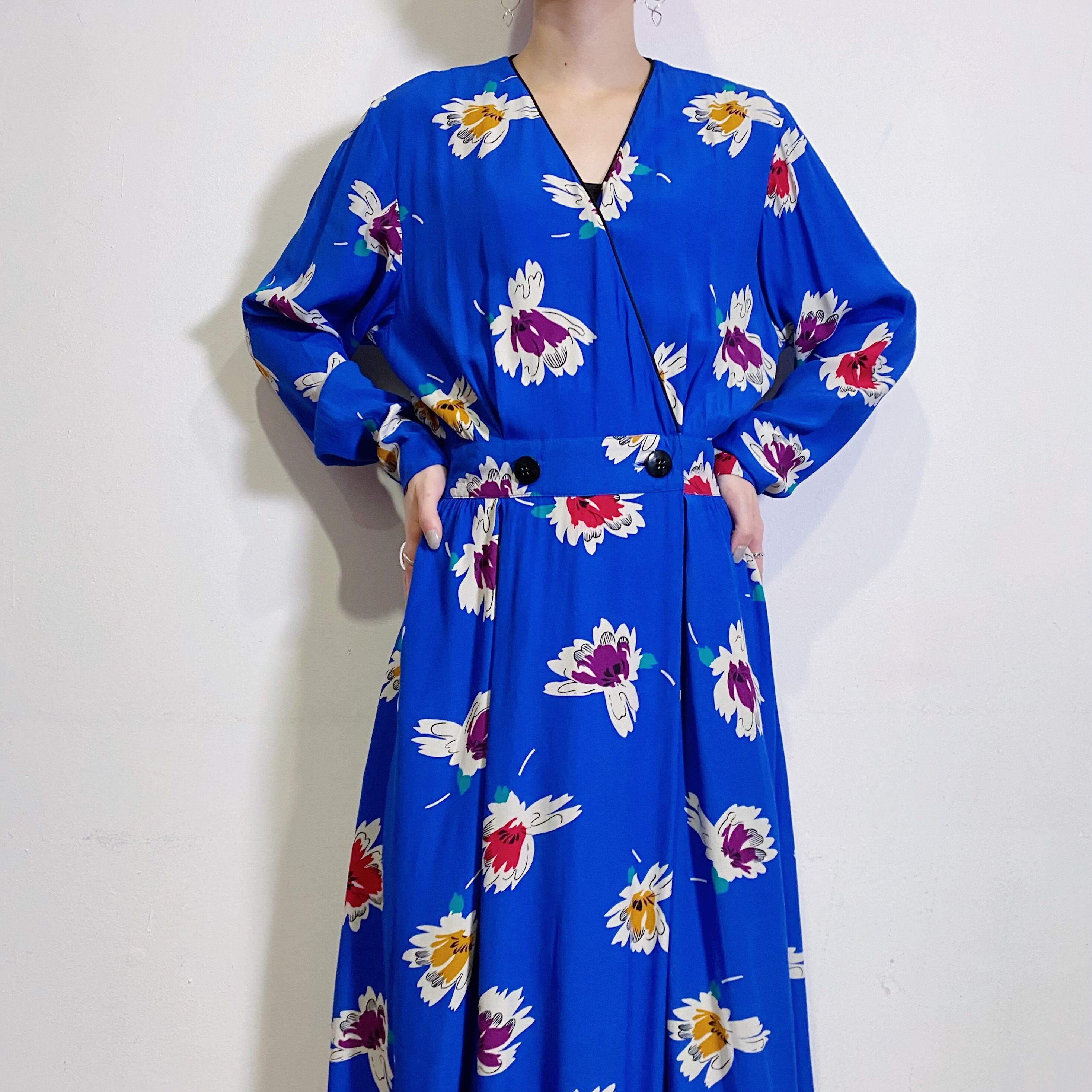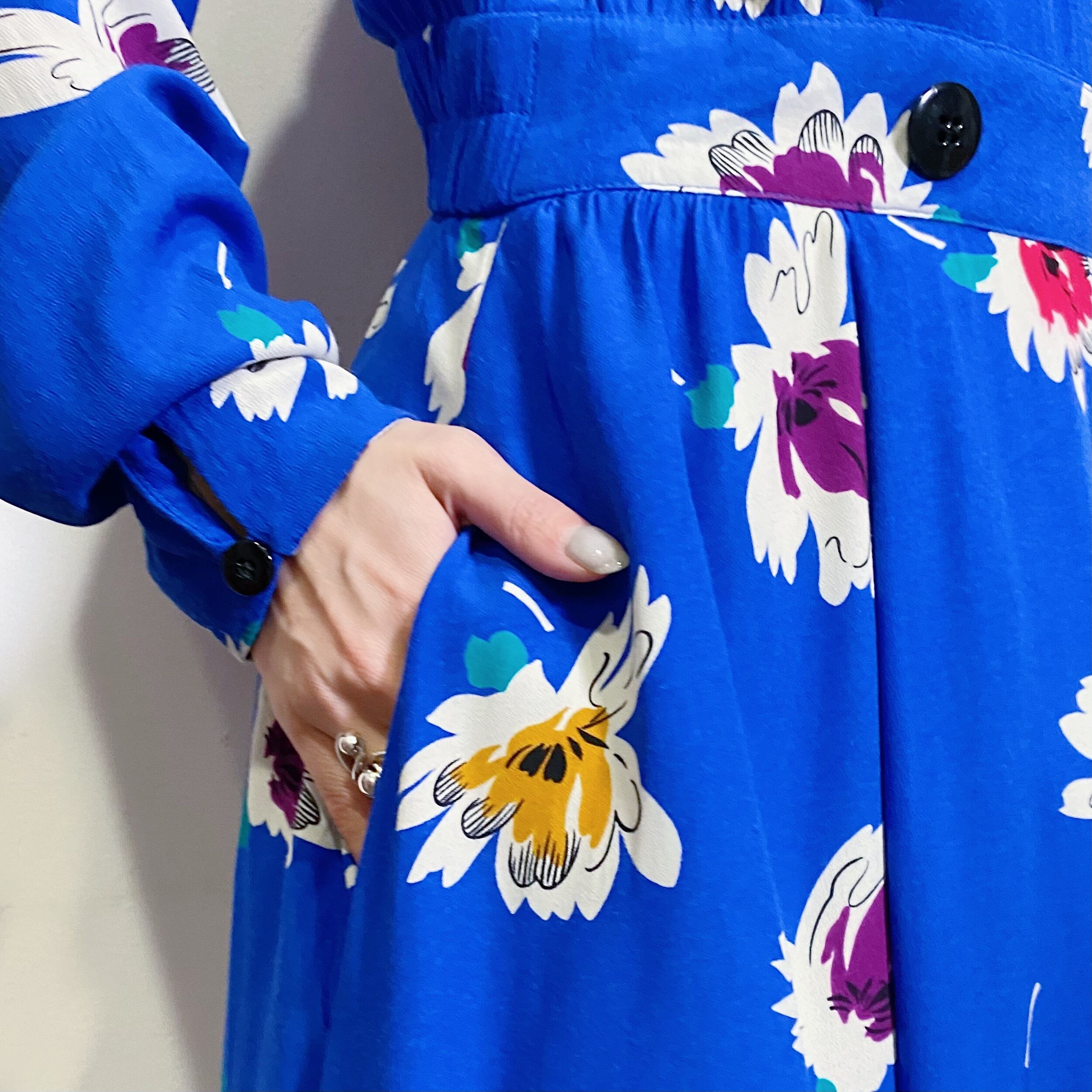 鮮やかなブルーベースに花柄が可愛い、80年代のワンピースです。