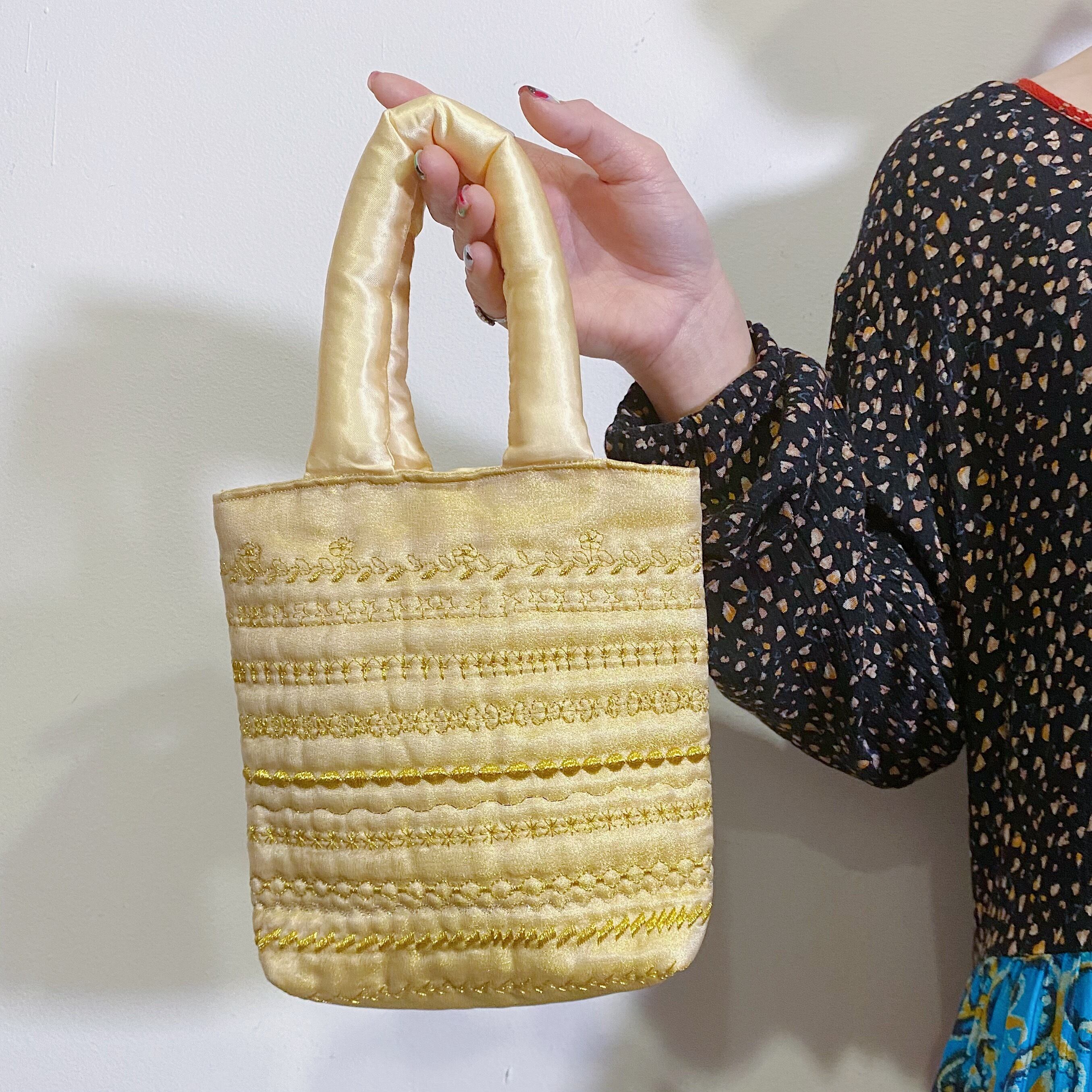 よく見るとお花や星など様々な模様が刺繍された、ゴールドのハンドバッグです。