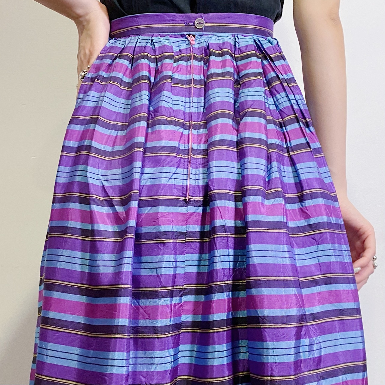 紫や水色のストライプが可愛い、60年代のロングスカートです。