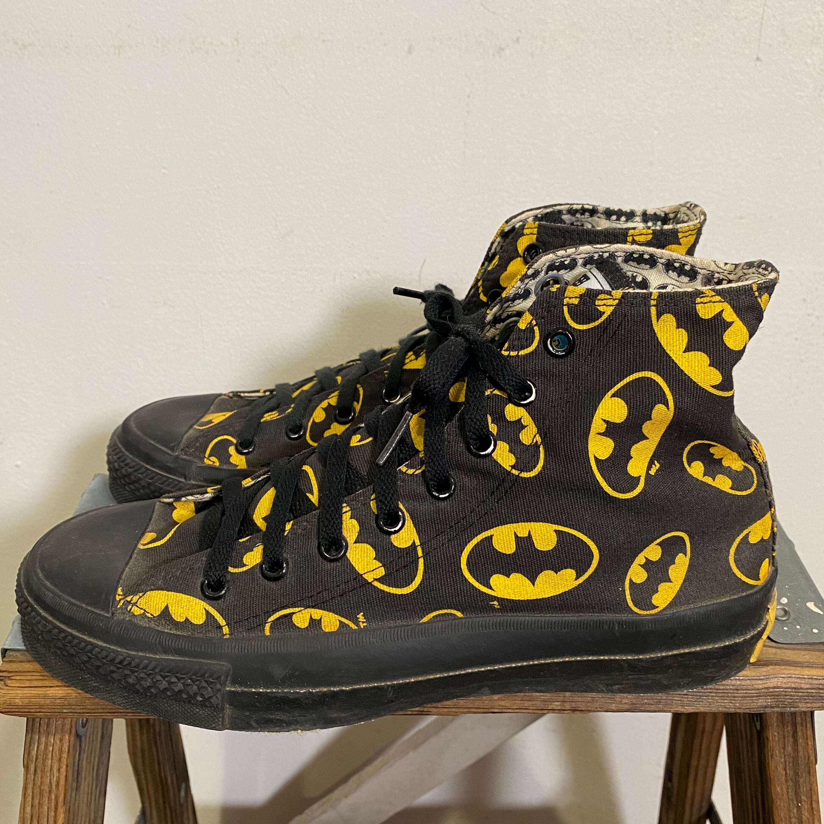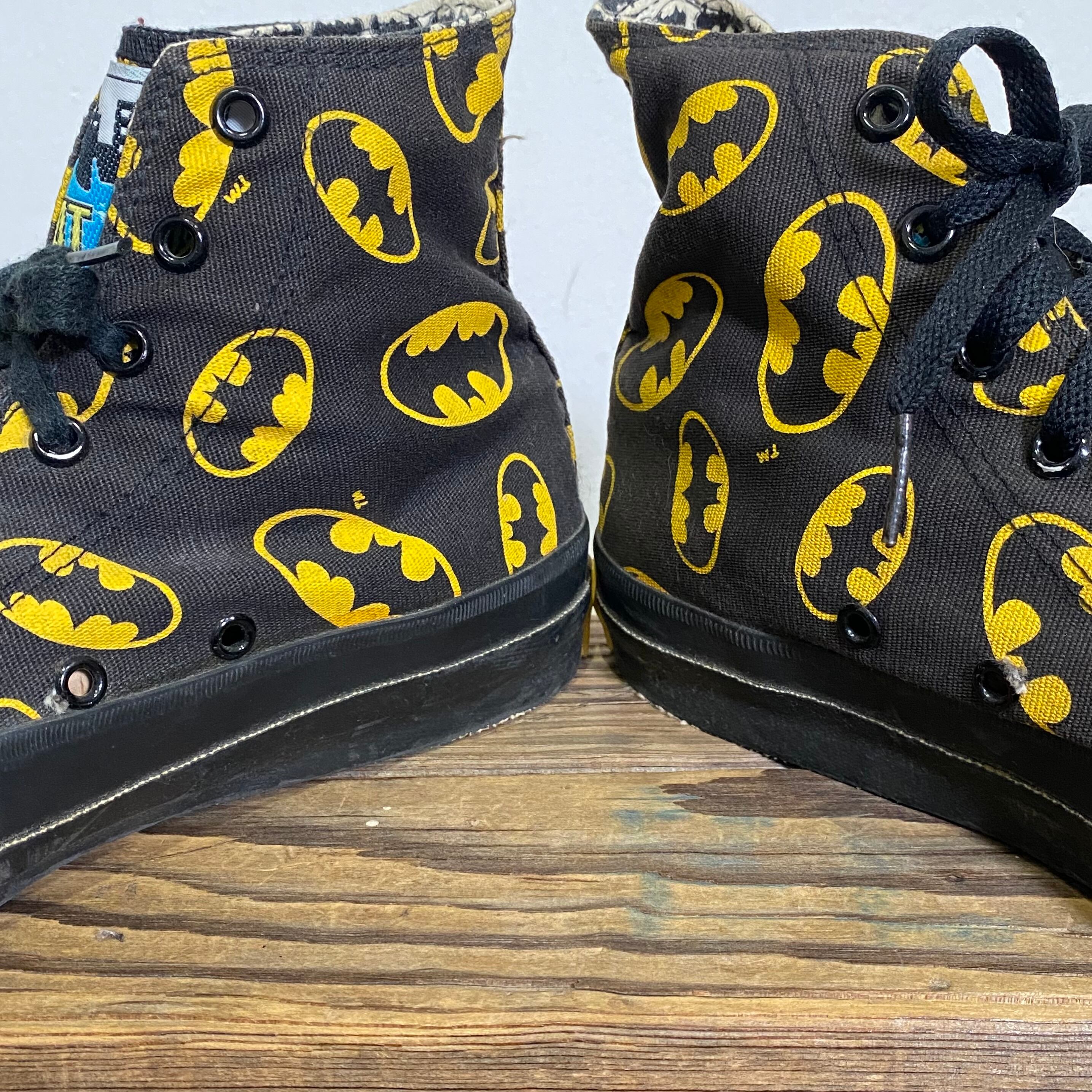 こちらはバットマンとのコラボアイテムで、総柄やベロのロゴがポップでキュートな一足。