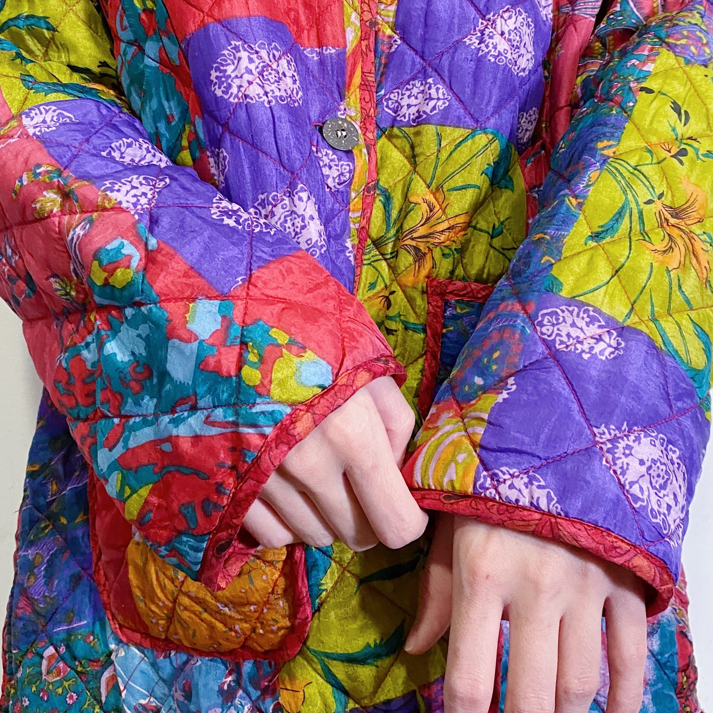 カラフルなパッチワークプリントが可愛い、キルティングジャケットです。