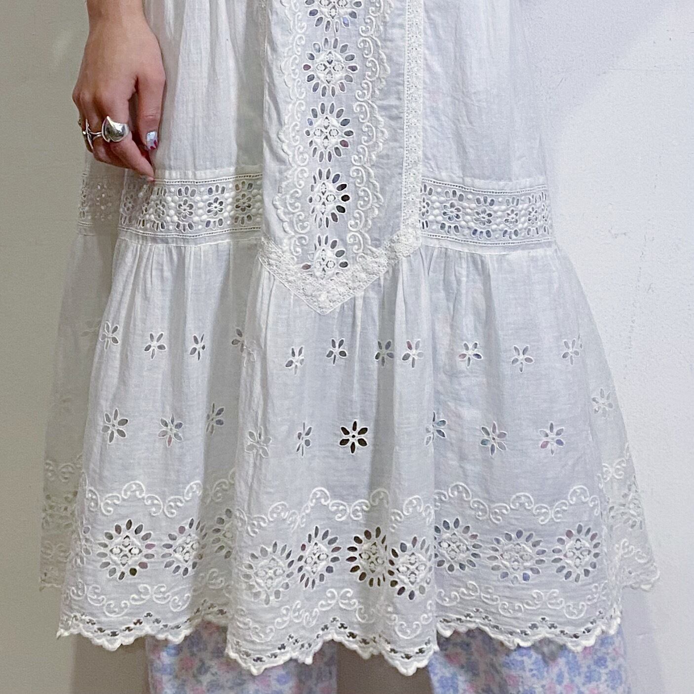 刺繍やカットワークなどの繊細なハンドワークが美しい、大変貴重な1900年代のアンティークワンピースです。