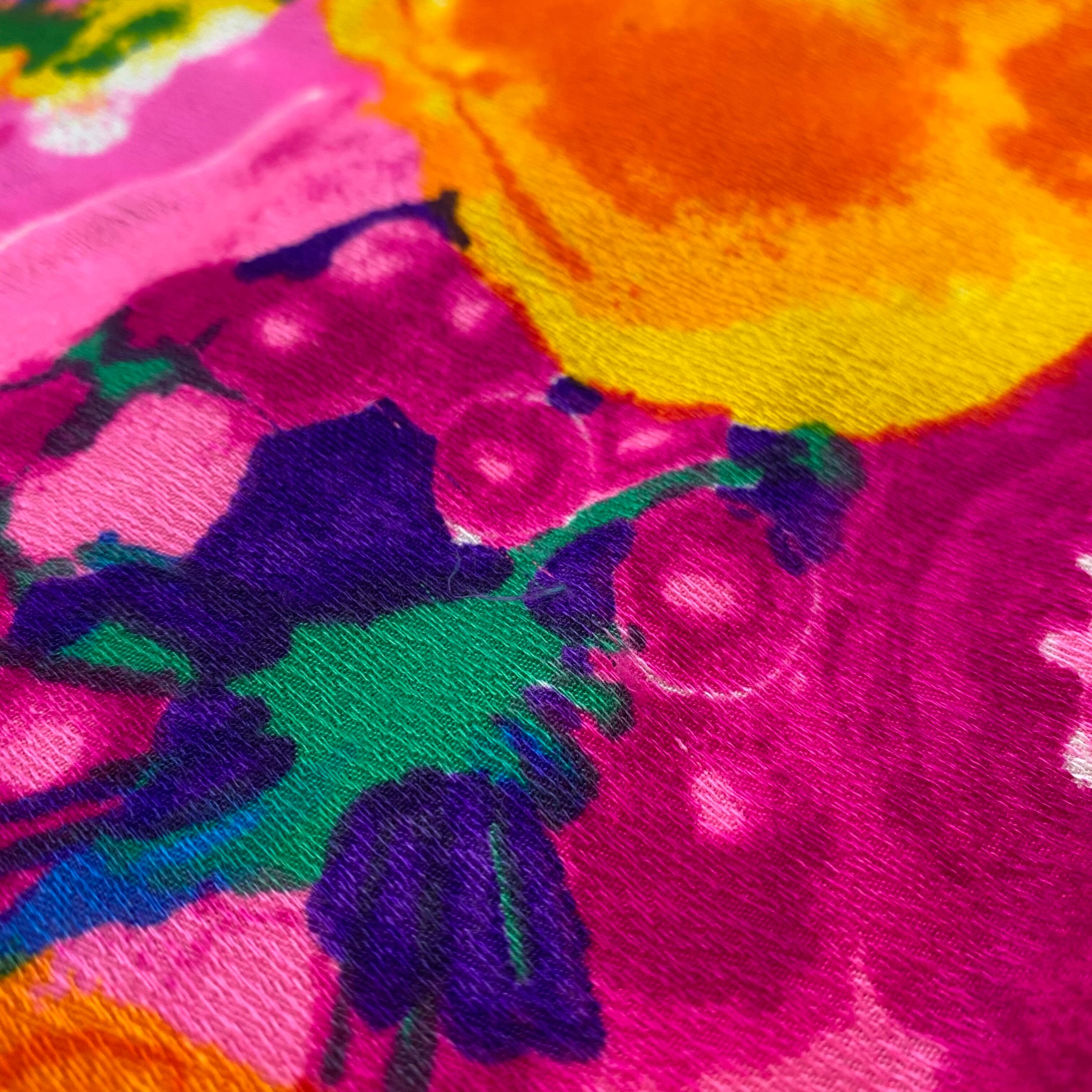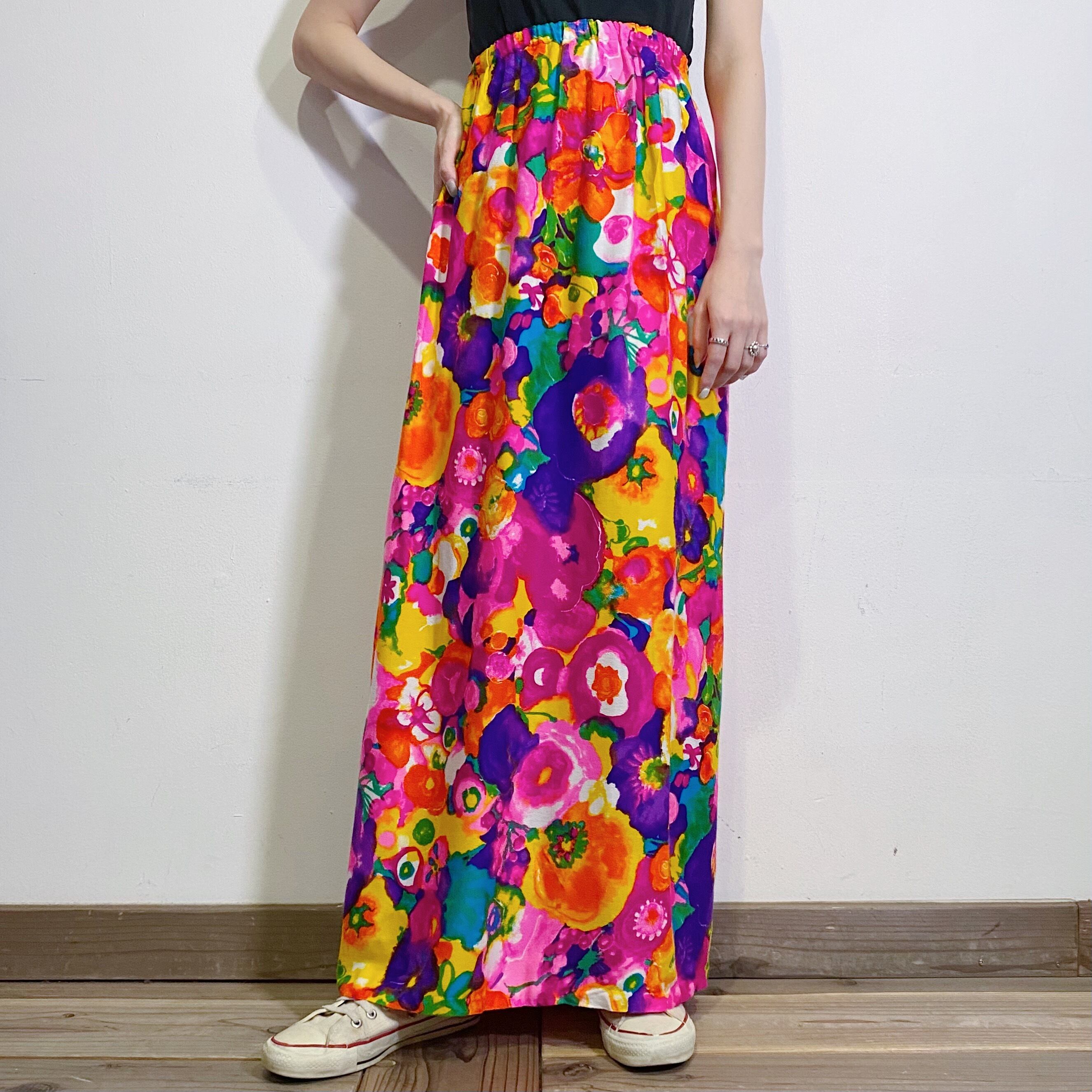 ピンクやオレンジなどのカラフルでハッピーな色合いが可愛い、70年代のロングスカートです。