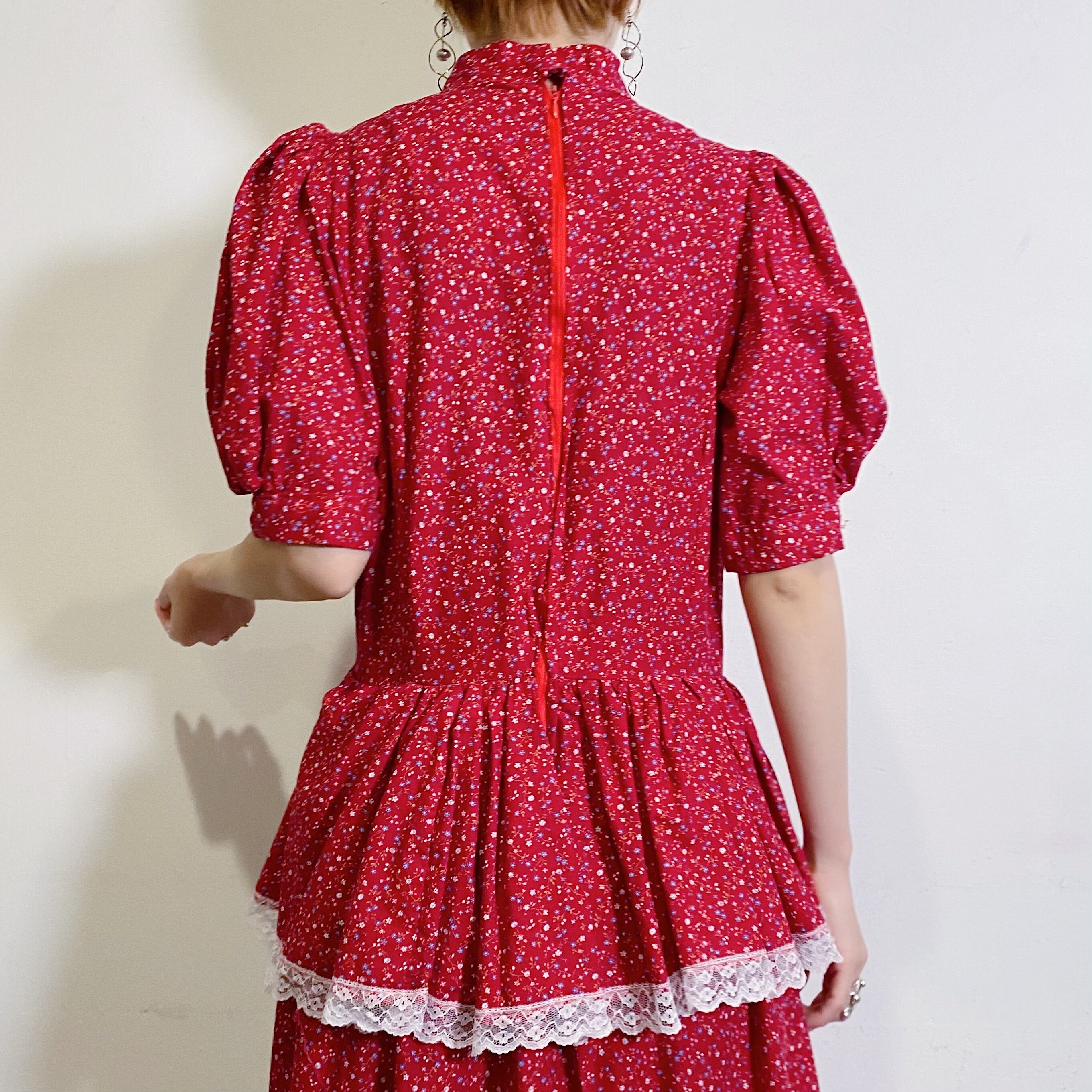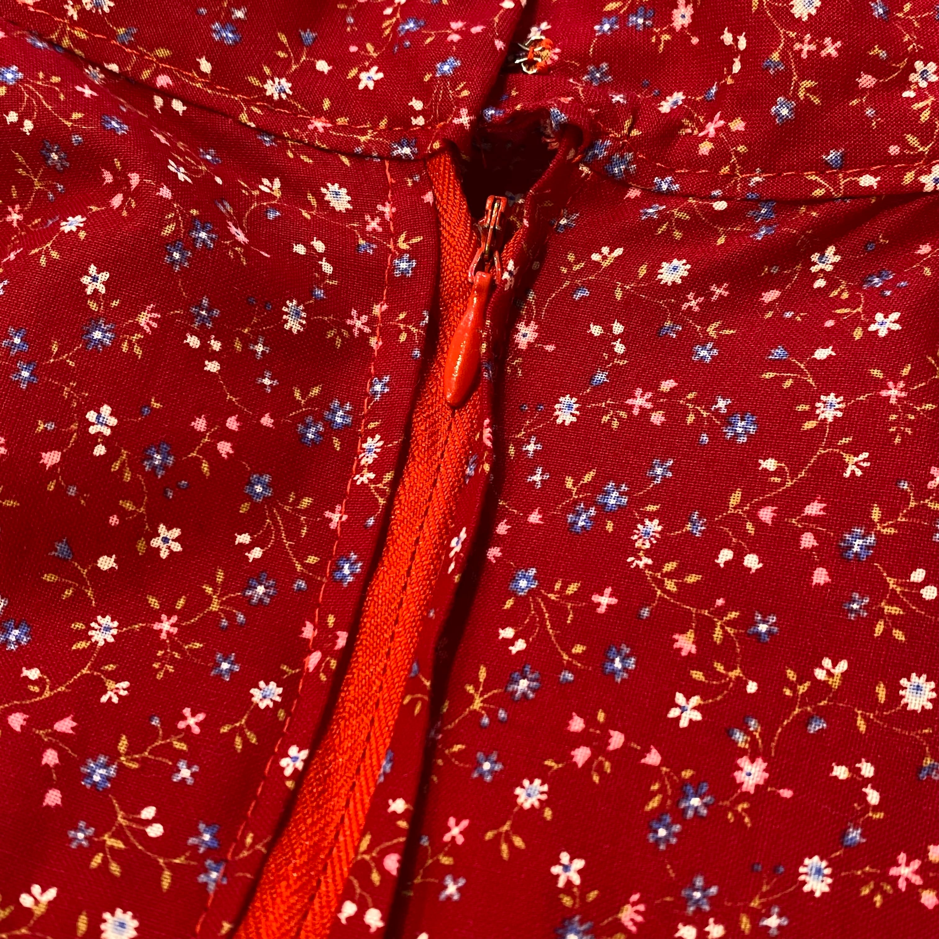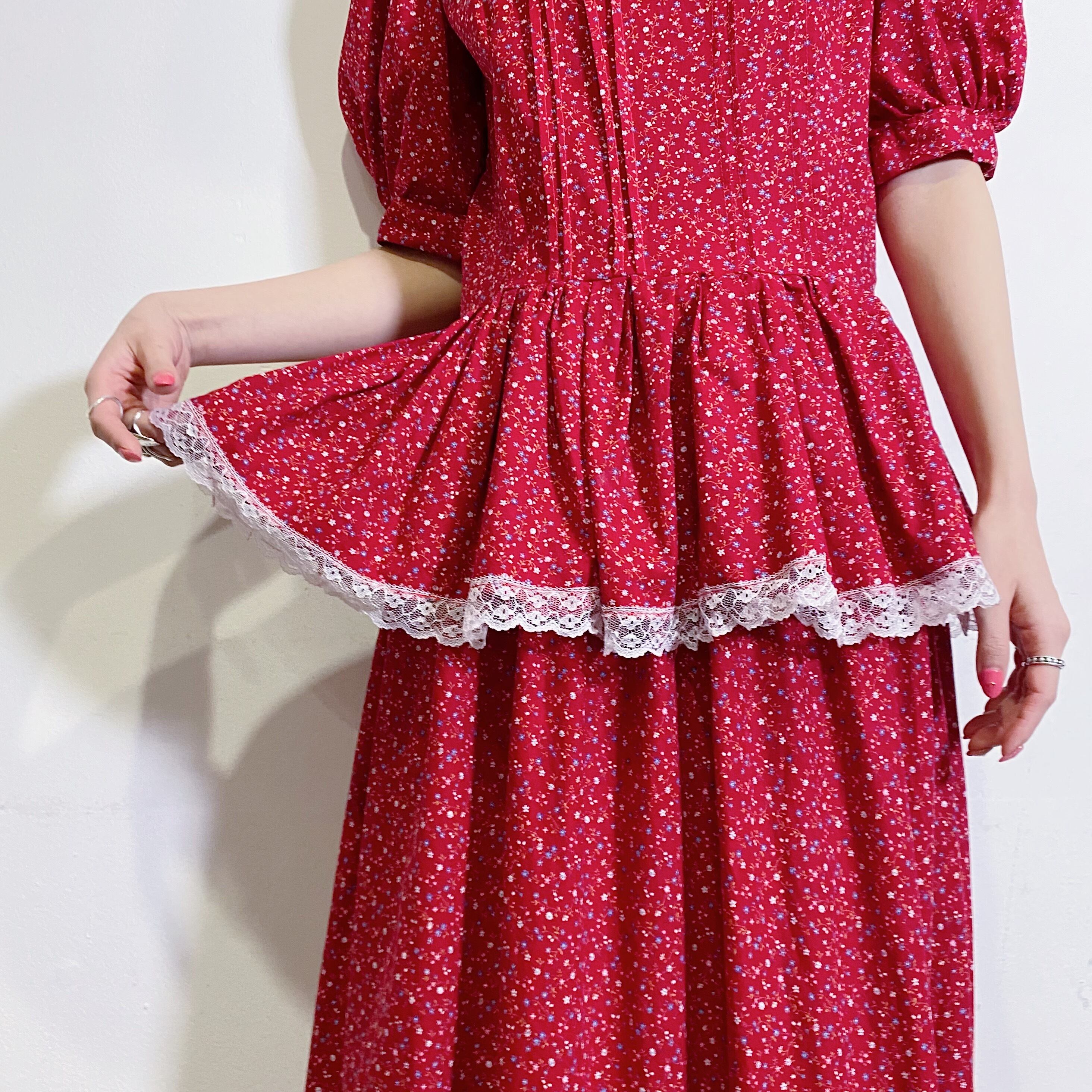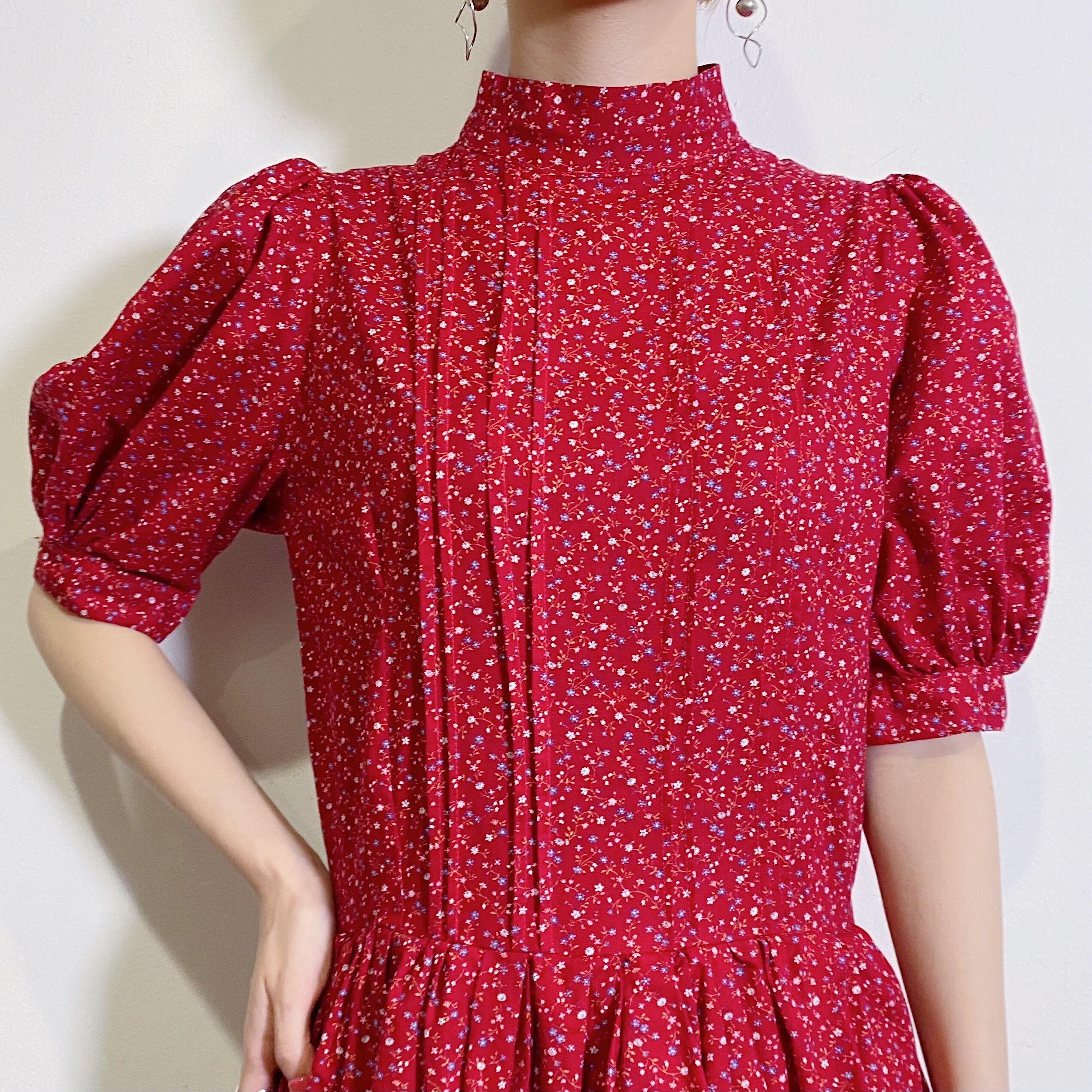 レッドベースに小花柄が可愛い、70年代のワンピースです。