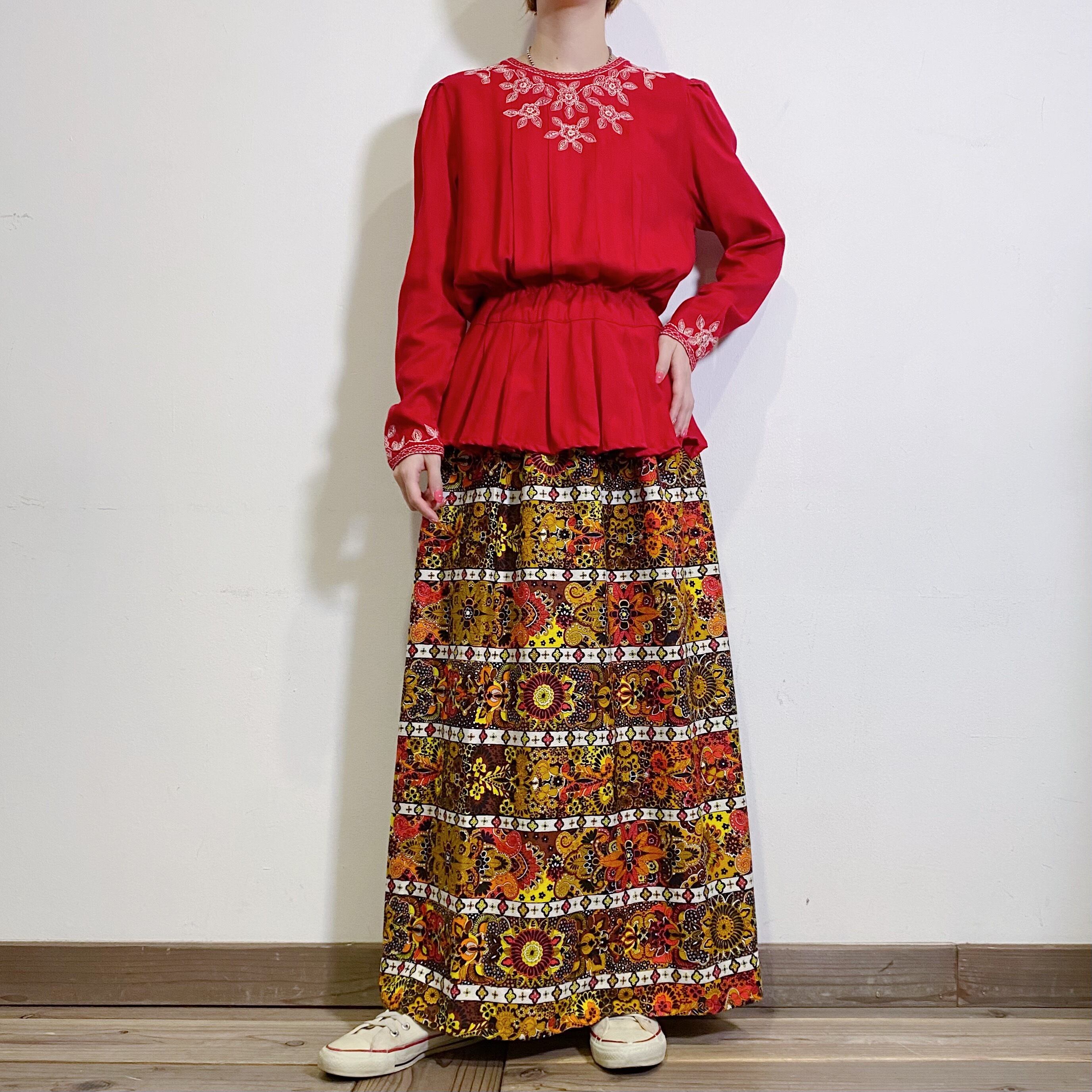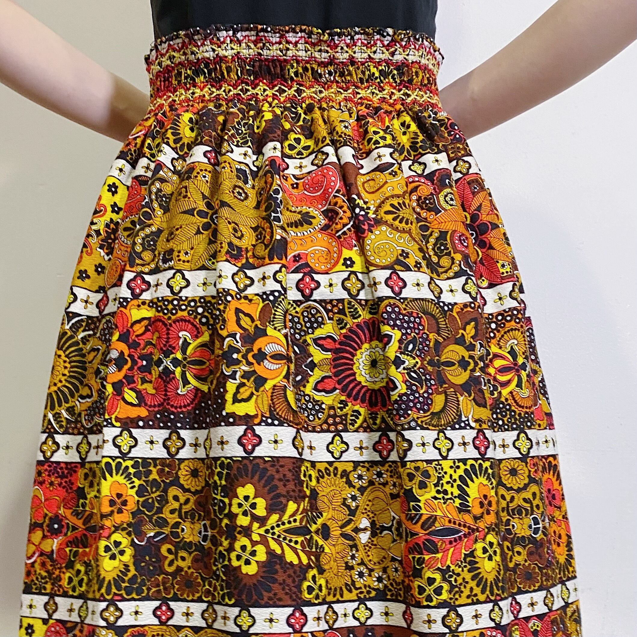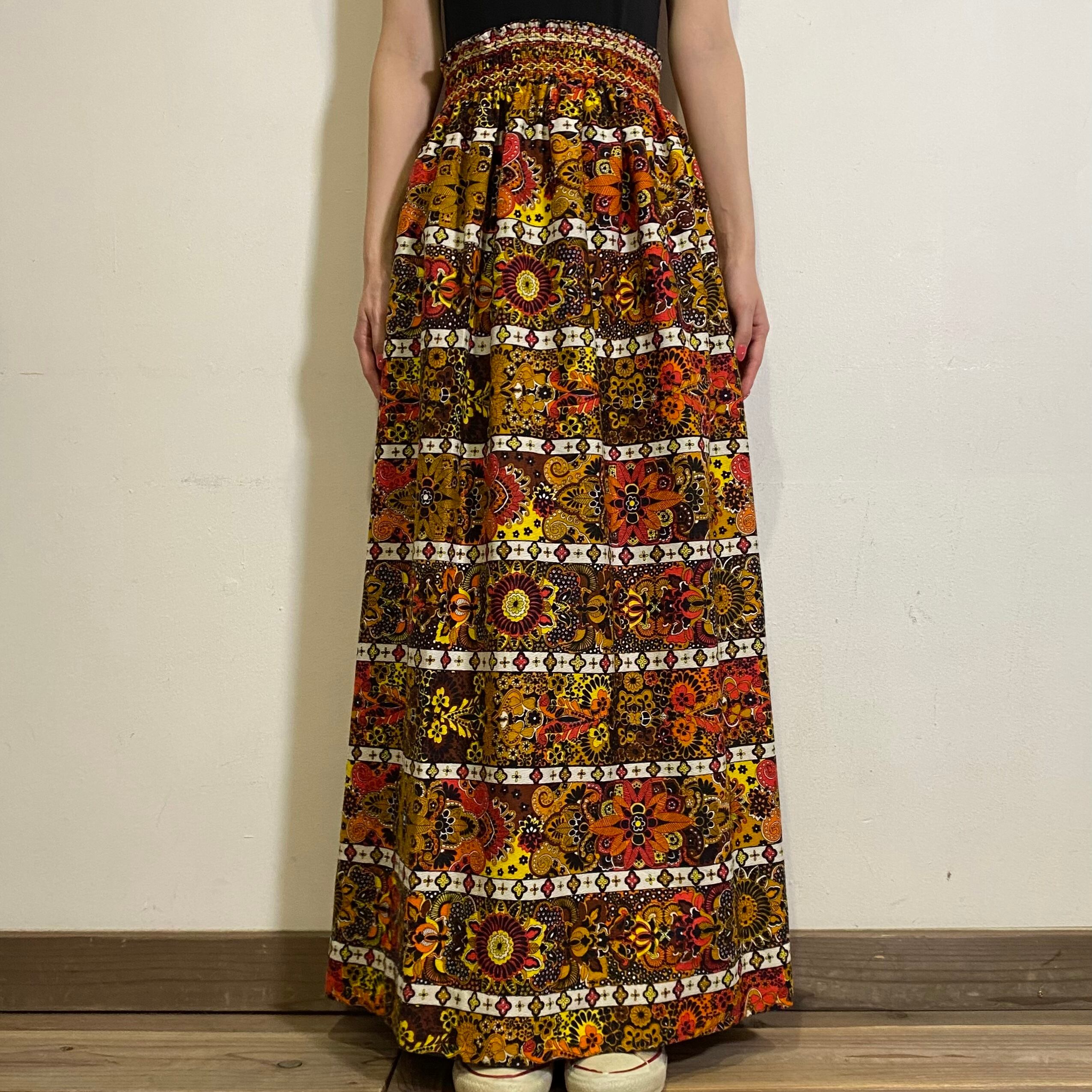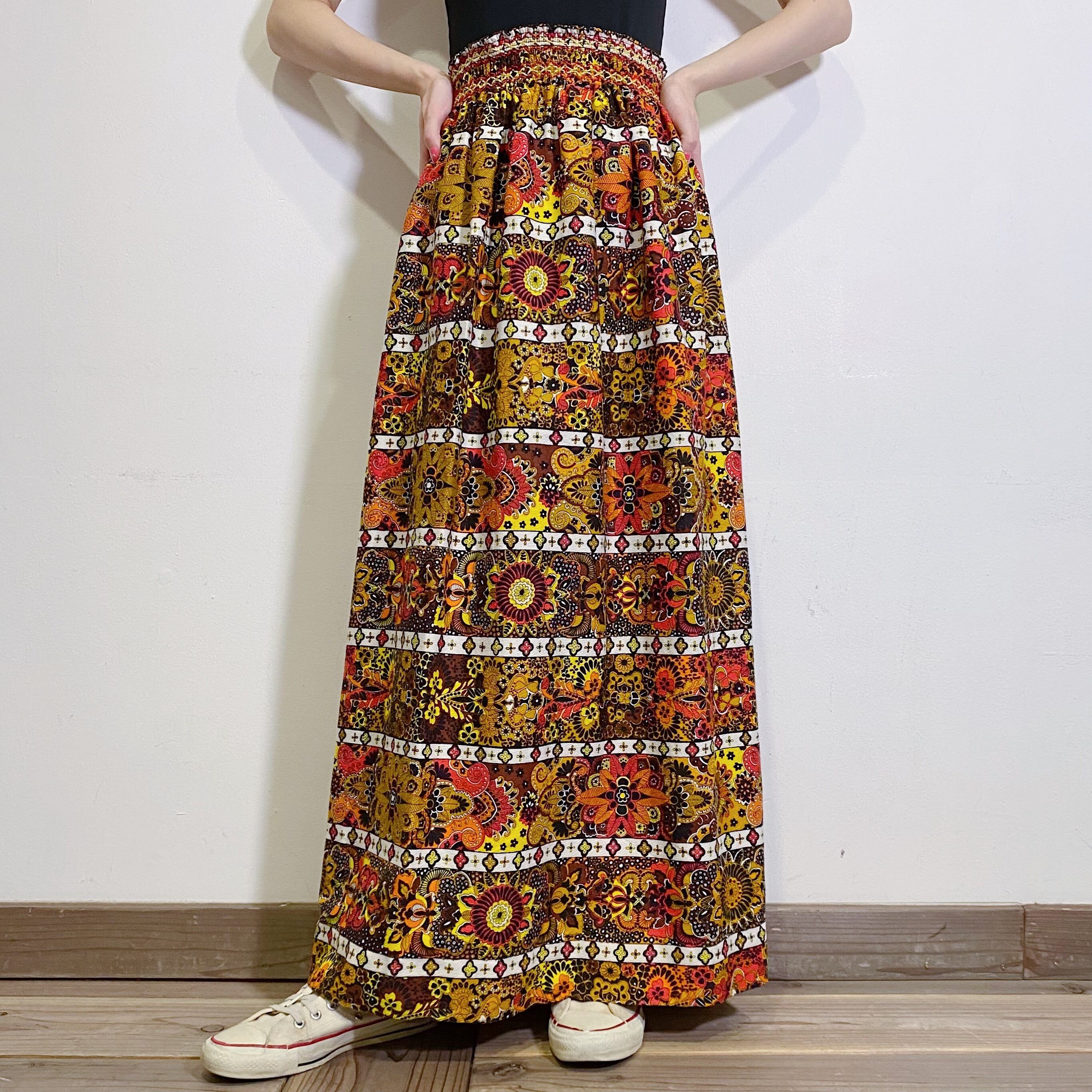 イエローやオレンジの色合いが可愛い、70年代のロングスカートです。