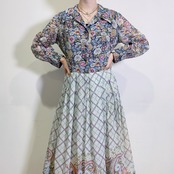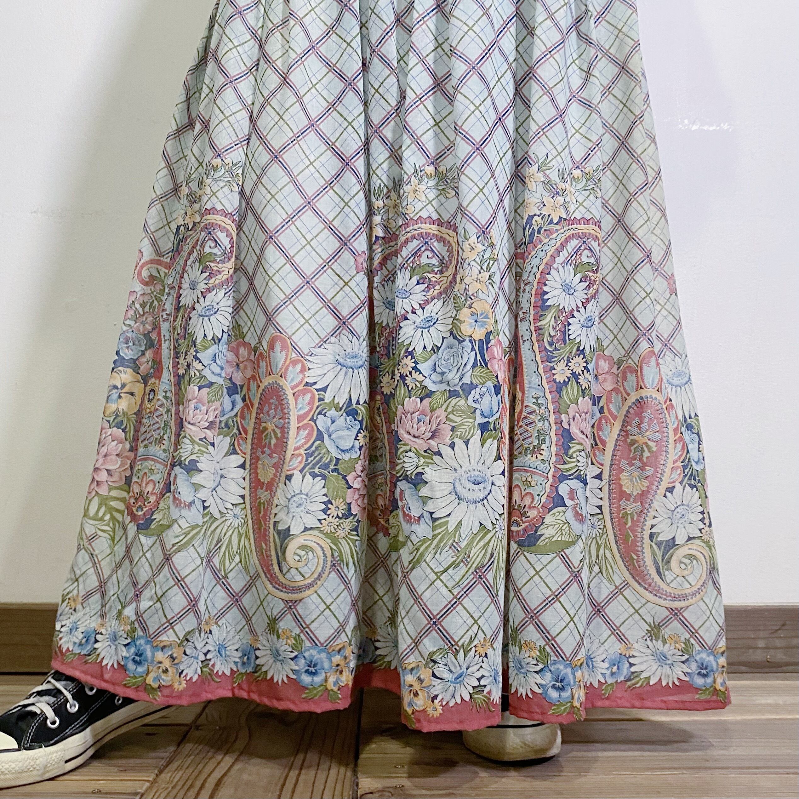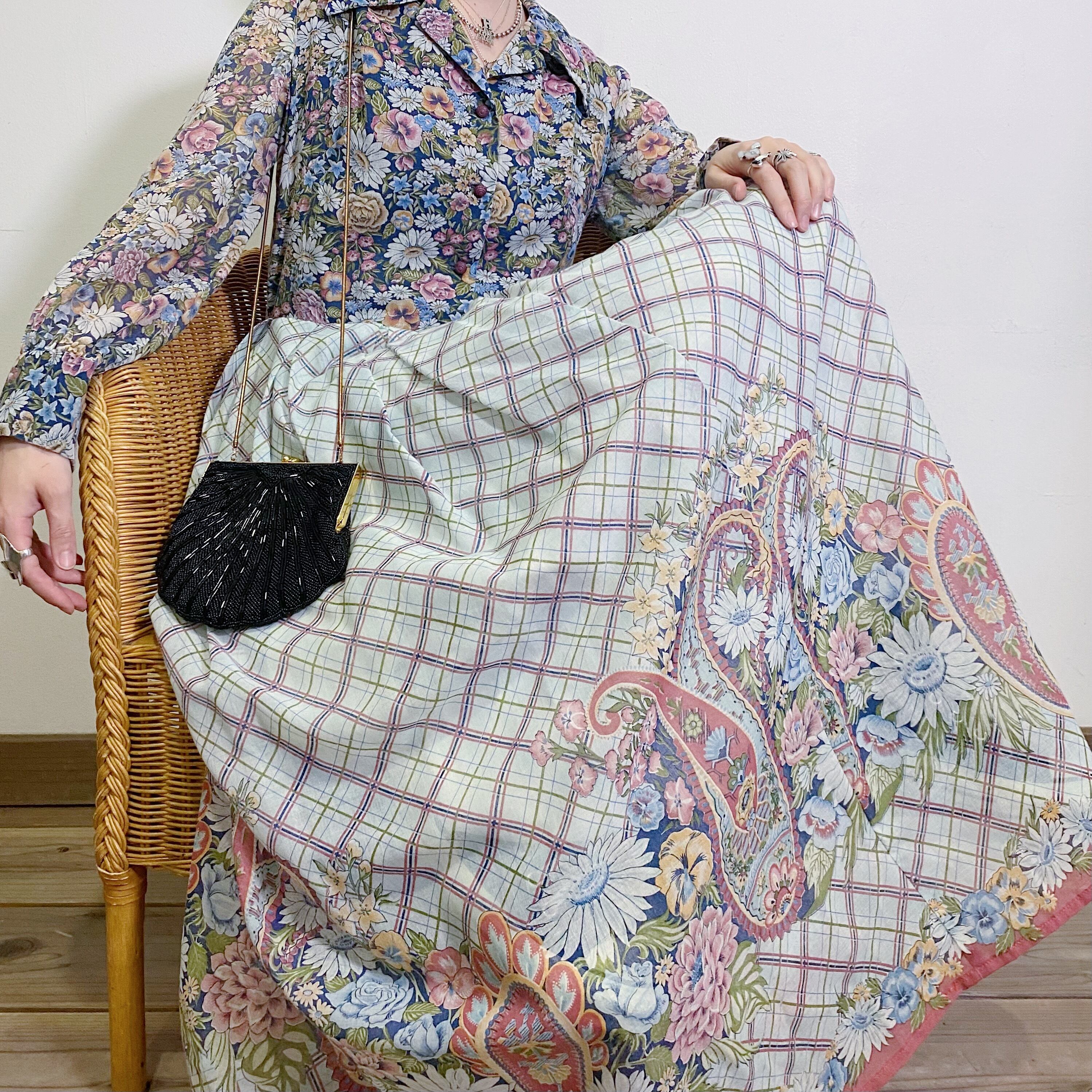 ブルーベース花柄にチェックの切り替えデザインが可愛い、70年代のロングワンピースです。