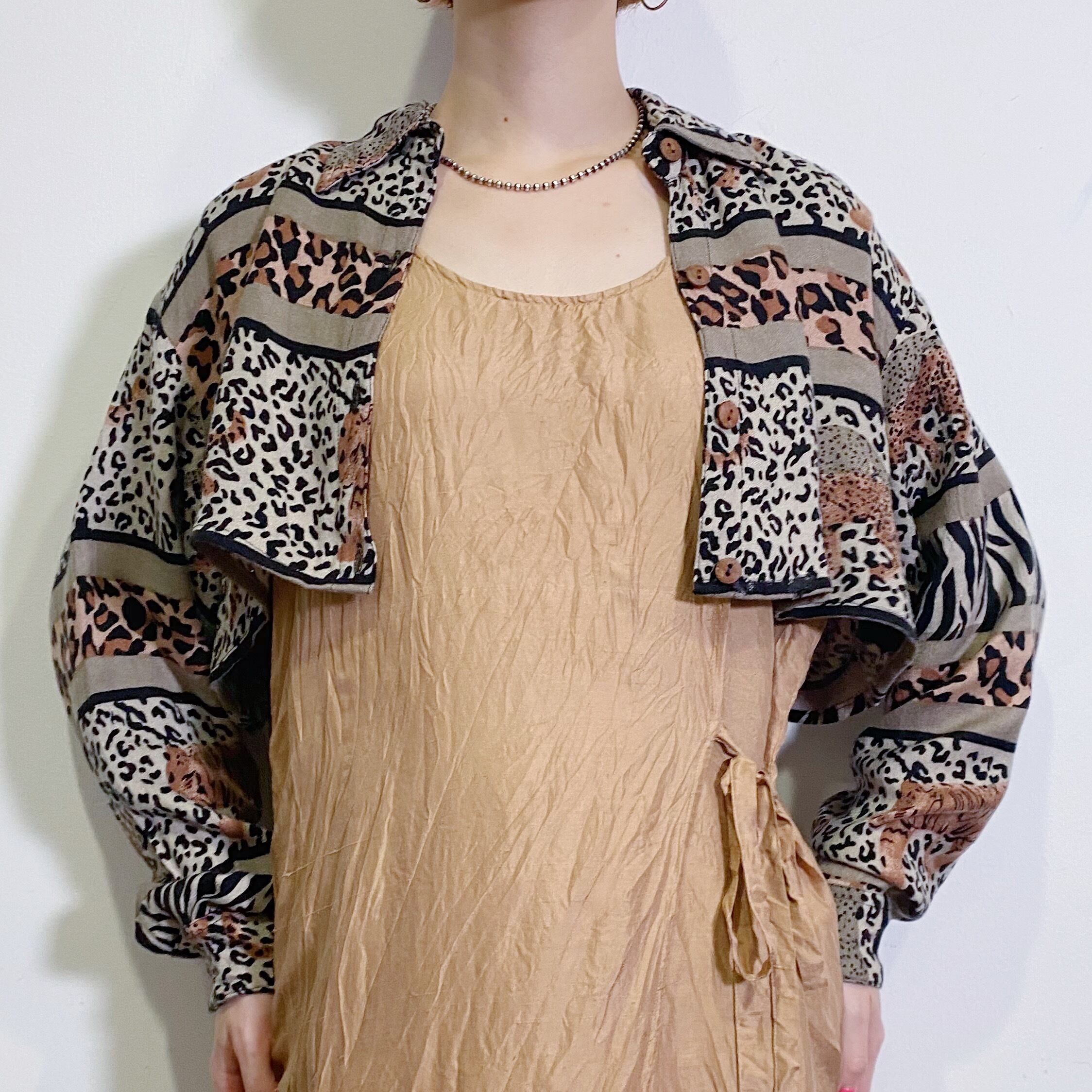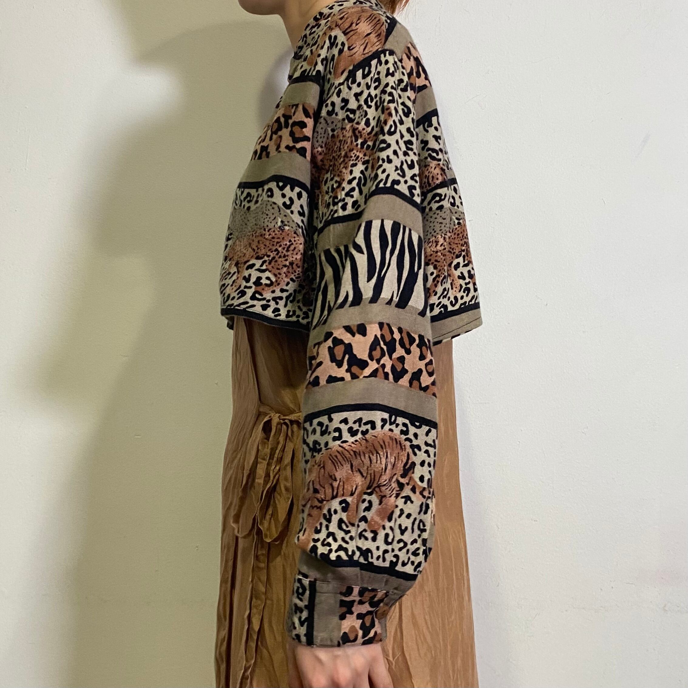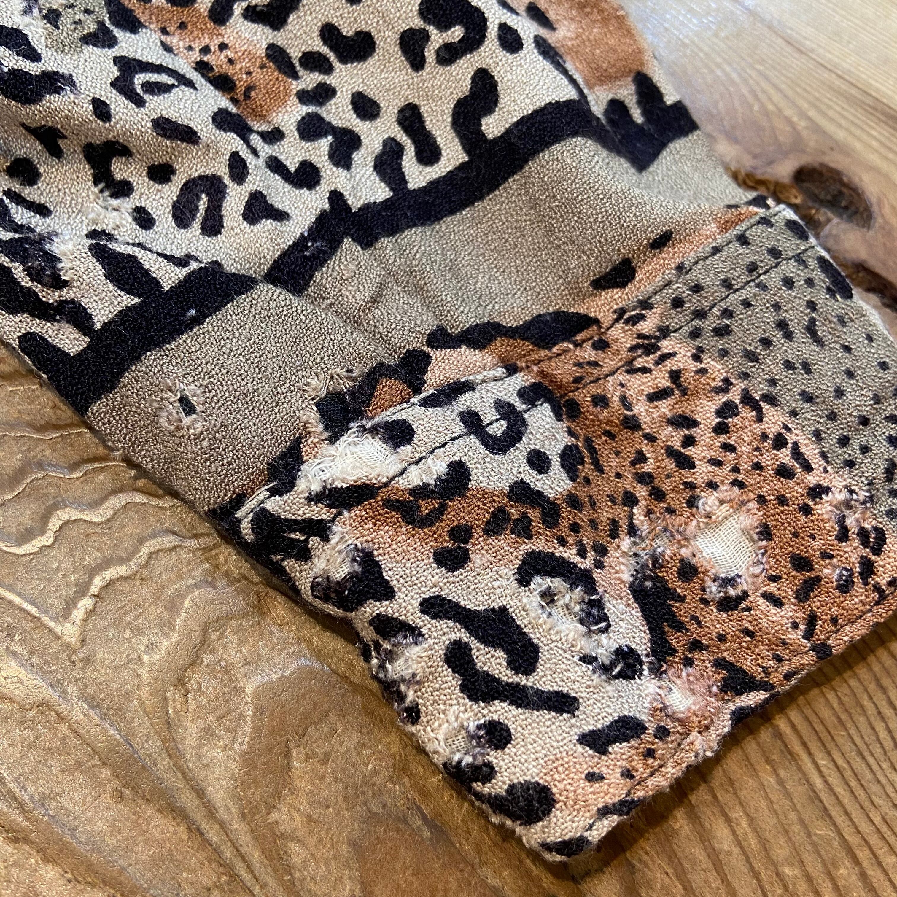 色んなレオパードやゼブラ柄にヒョウやチーターがいる、ユニークな柄のシャツです。