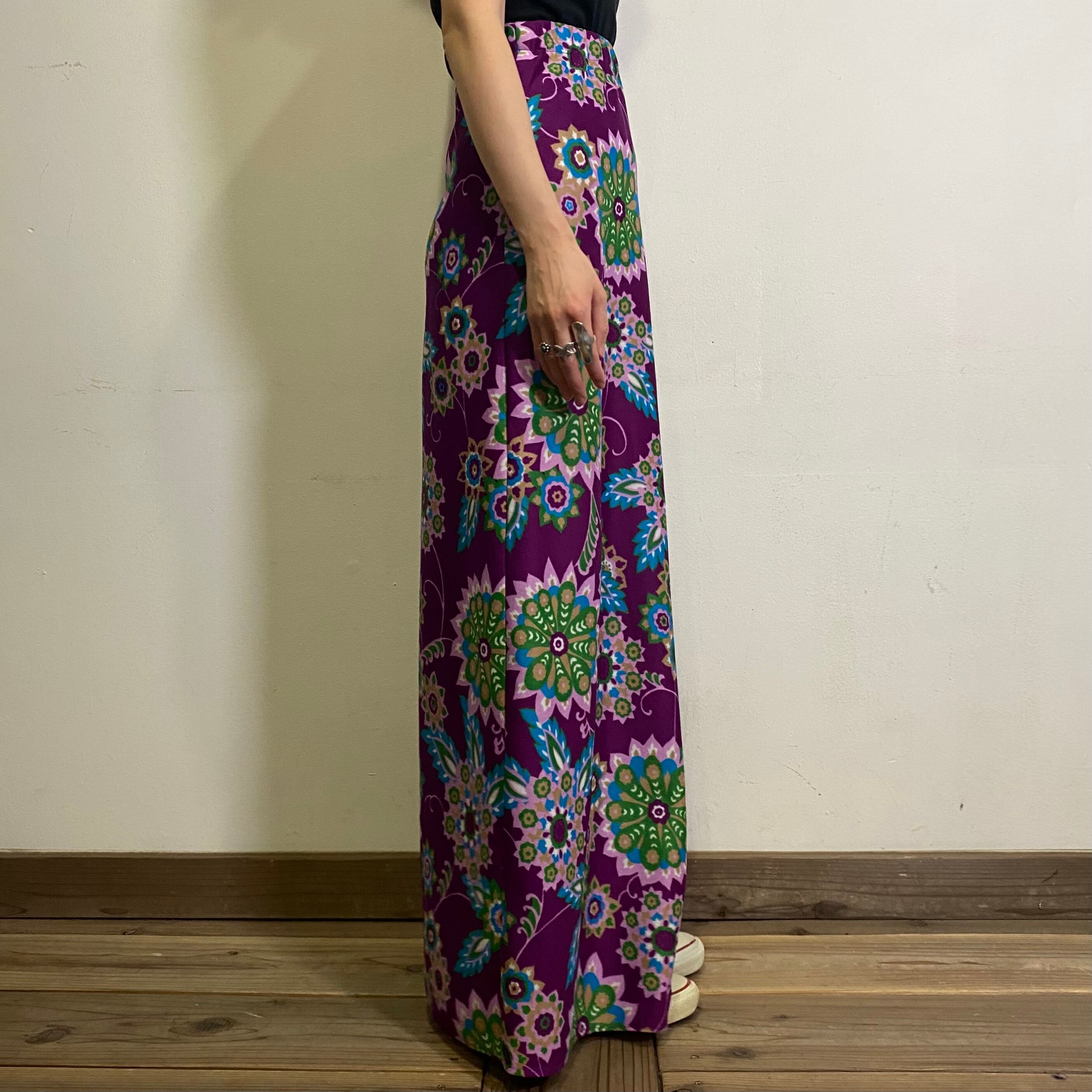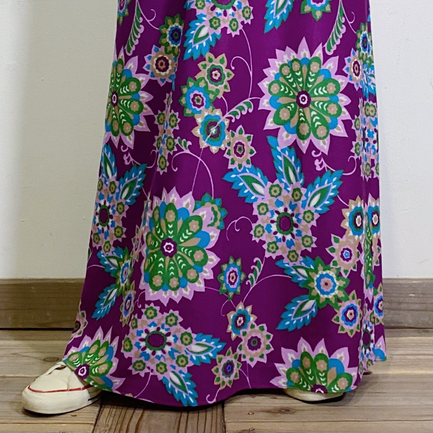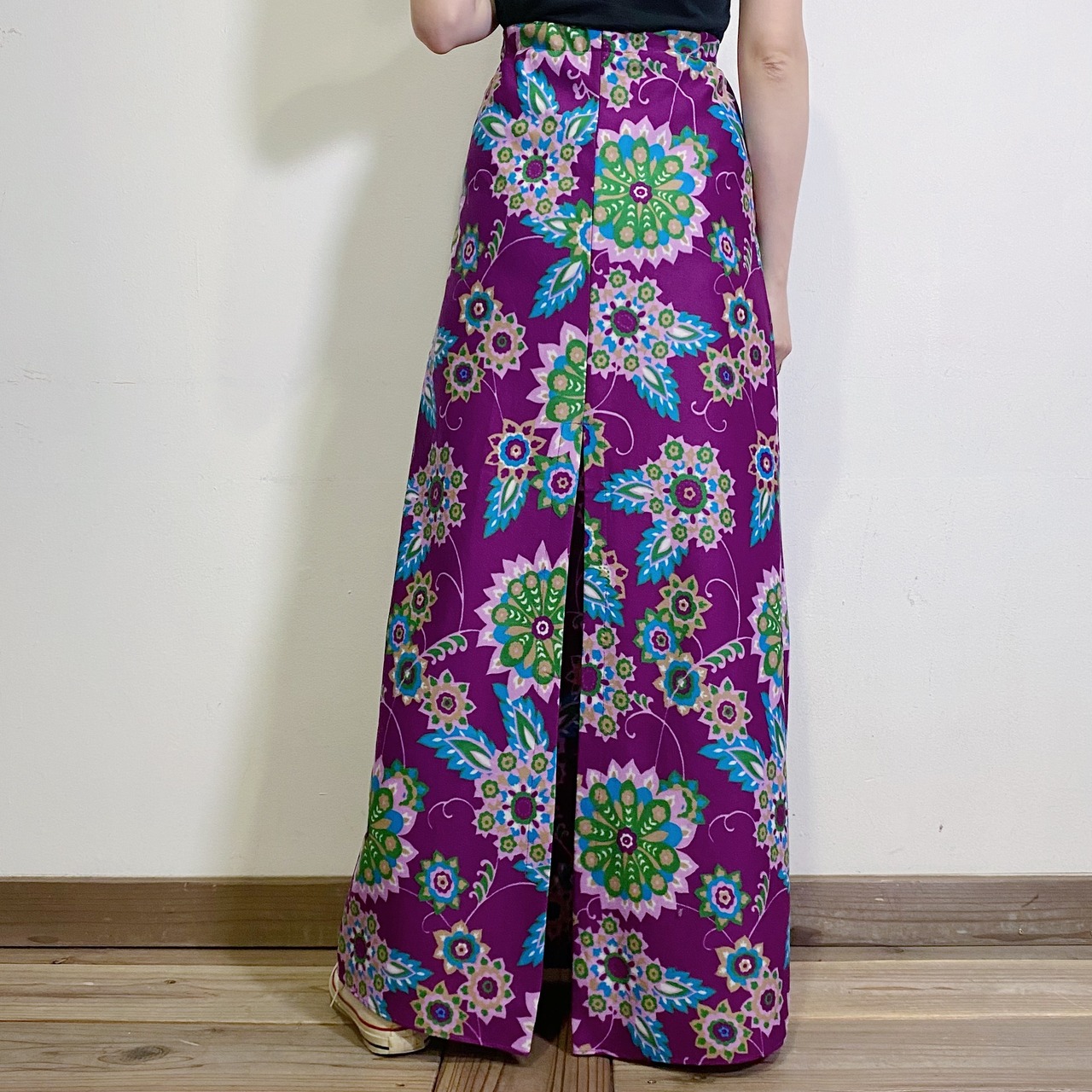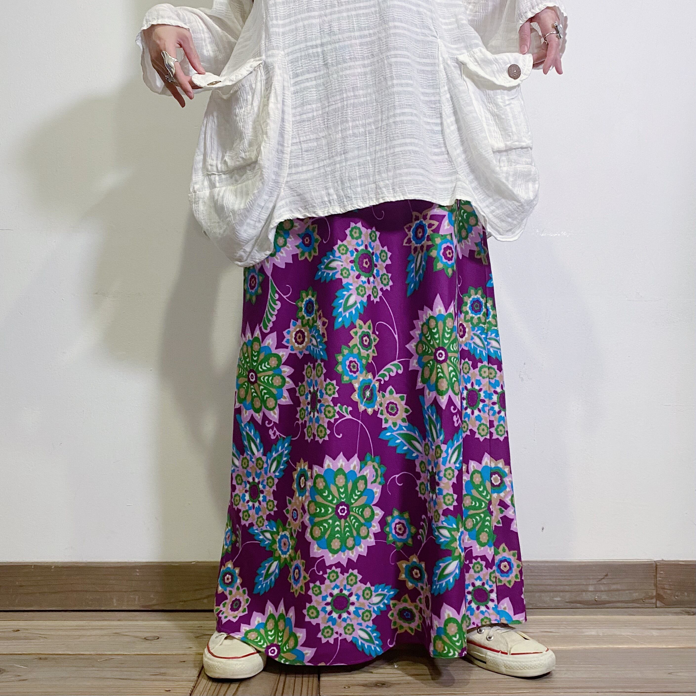 パープルベースのサイケな花柄が可愛い、70年代のロングスカートです。