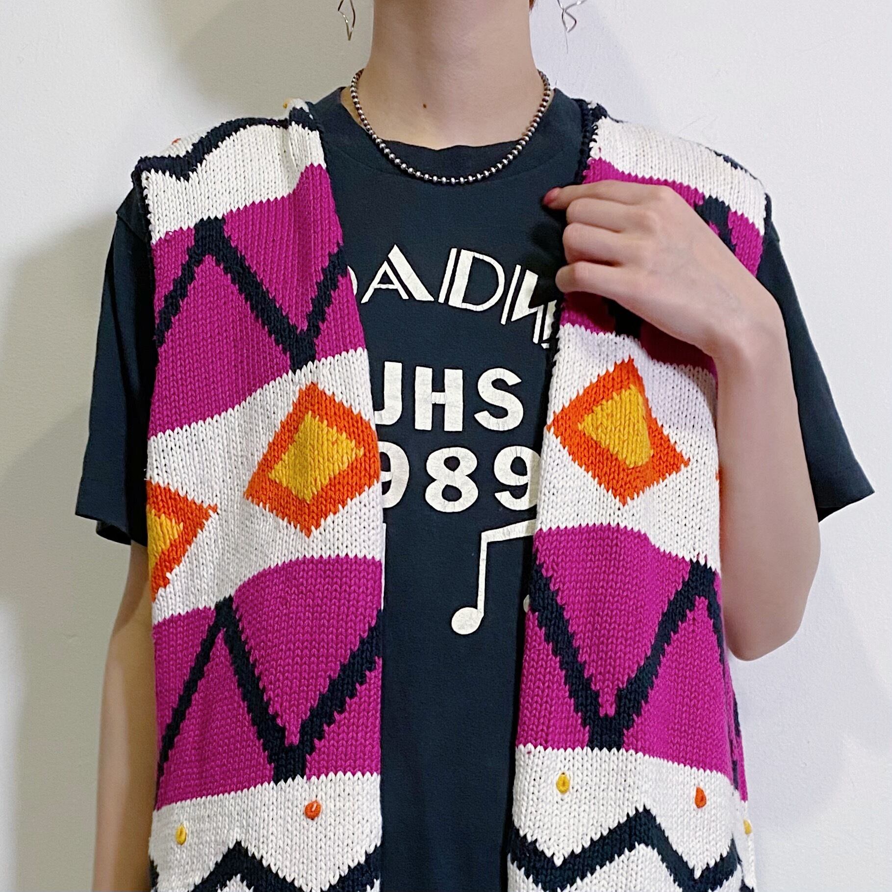 カラフルな色合いのいろんな編みが楽しい、80年代のベストです。