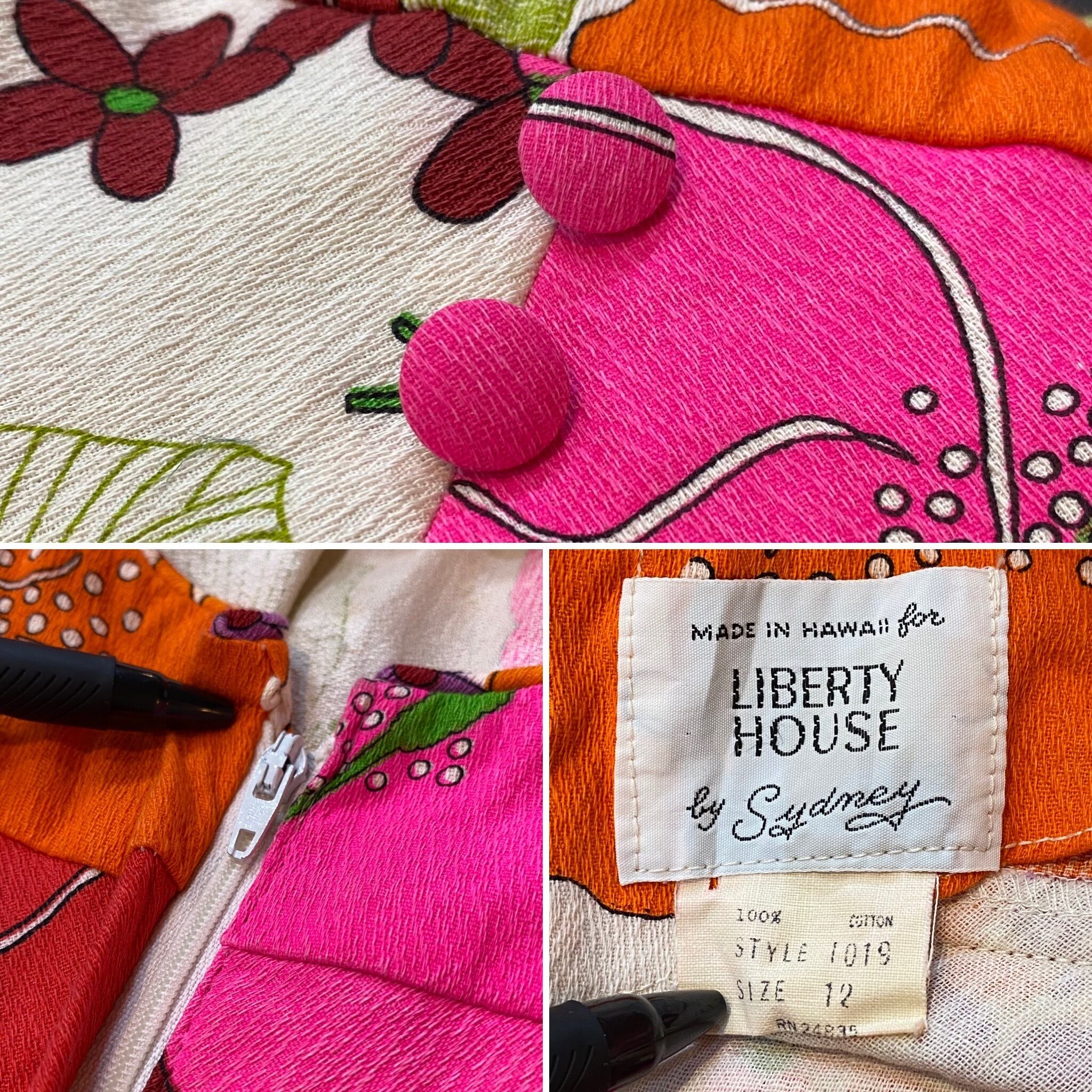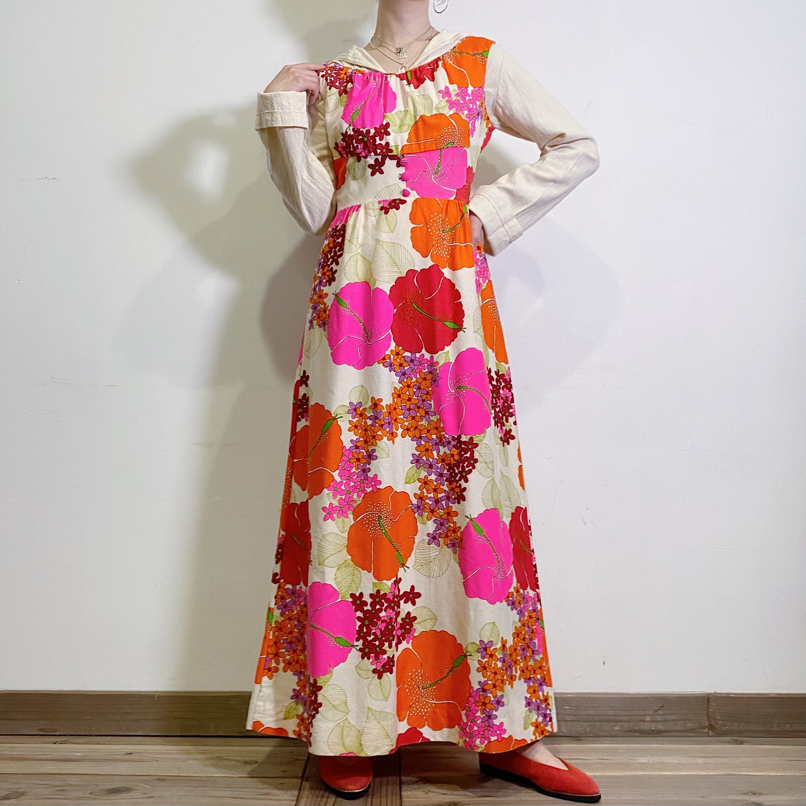 パッと華やかなオレンジ・ピンク・レッドのお花柄が可愛い、60~70年代のロングワンピースです。