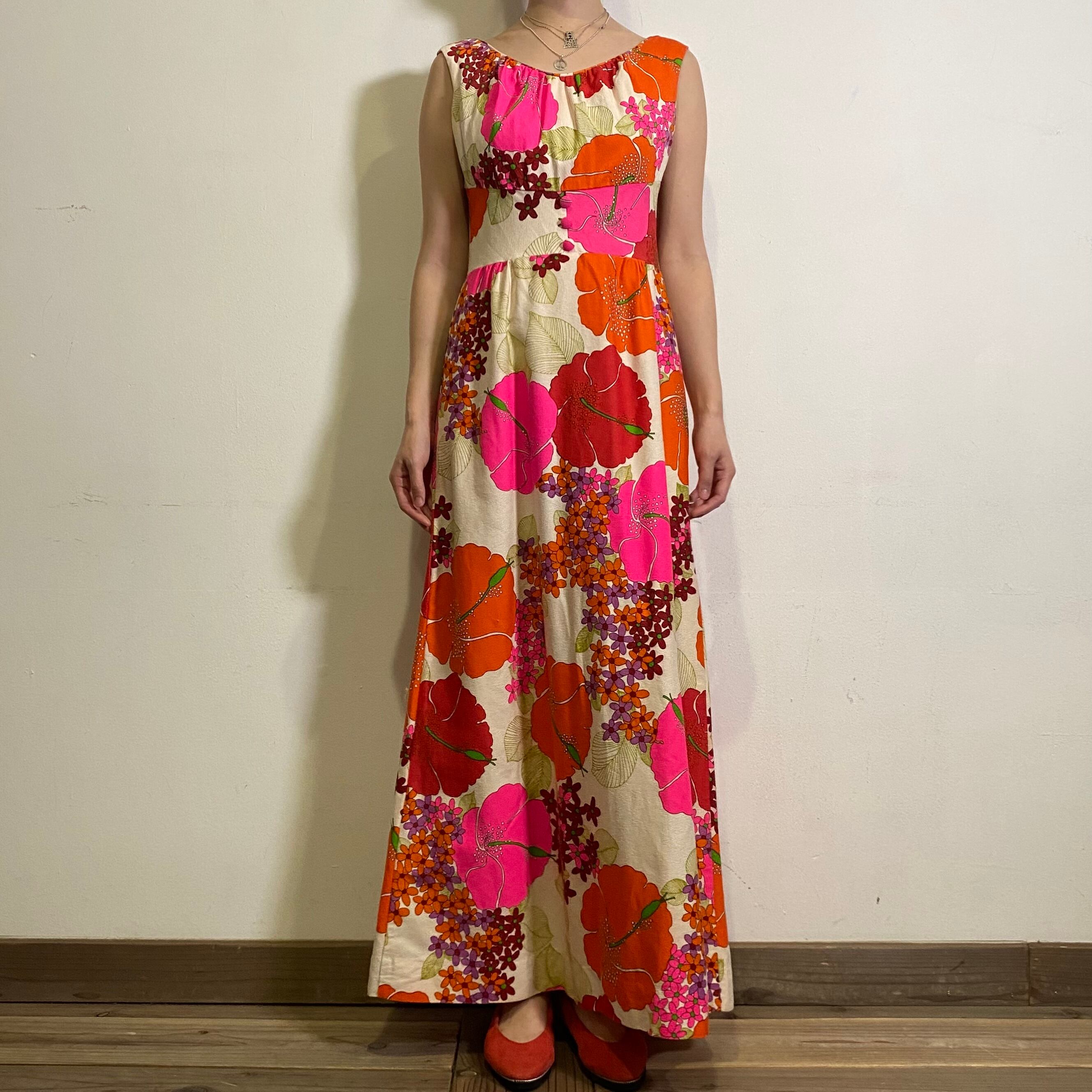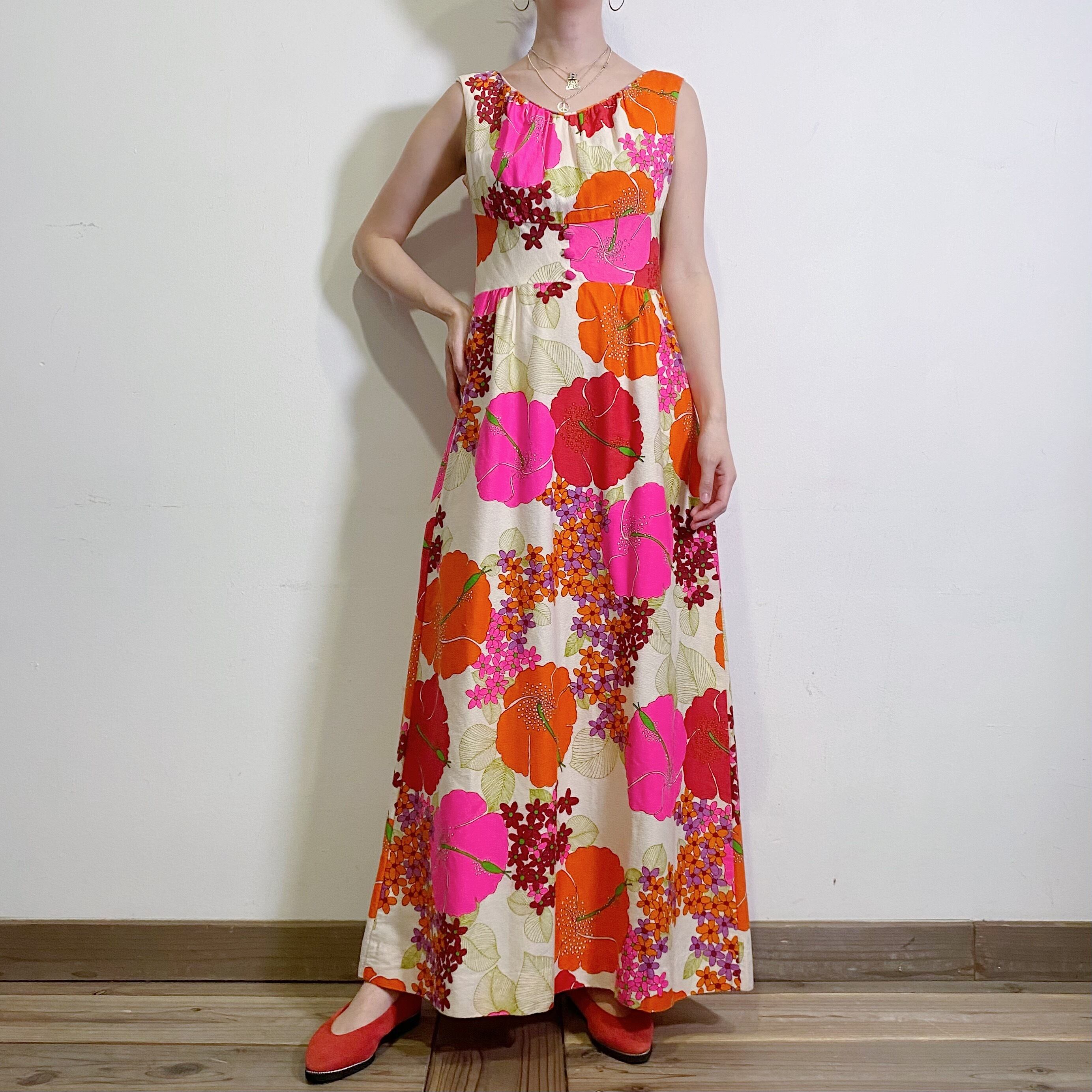 60-70s Hawaiian flower printed sleeveless long dress