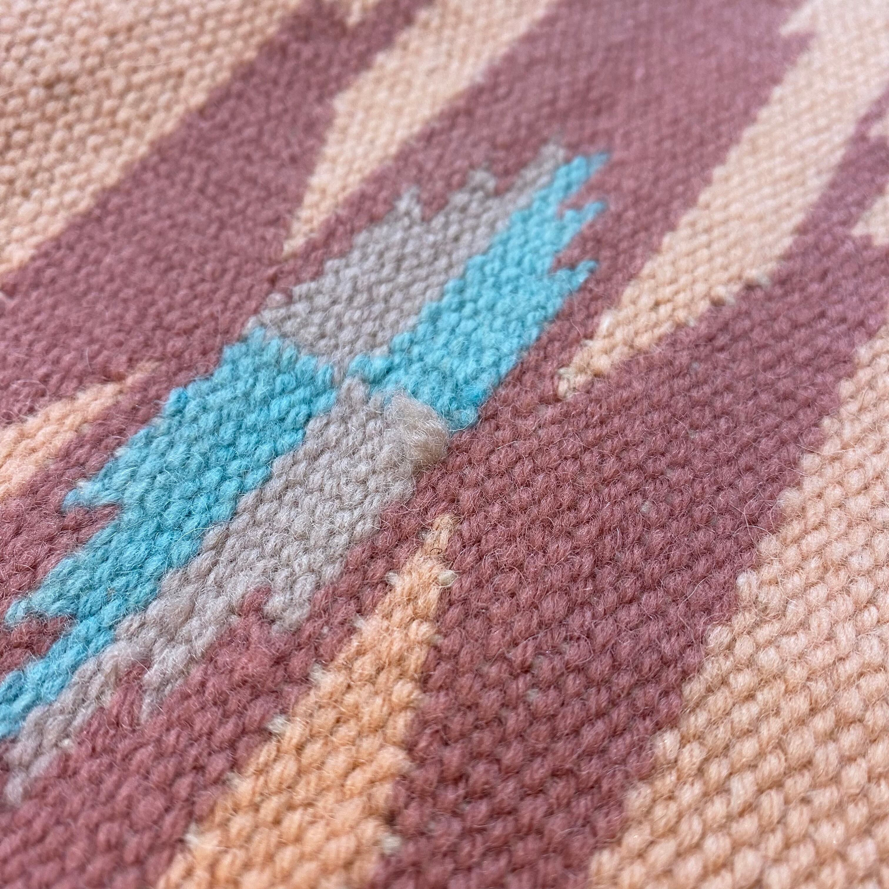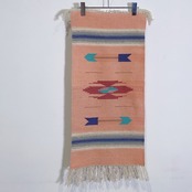 サーモンピンクのような色合いにネイティブ柄が可愛い、70年代のラグです。