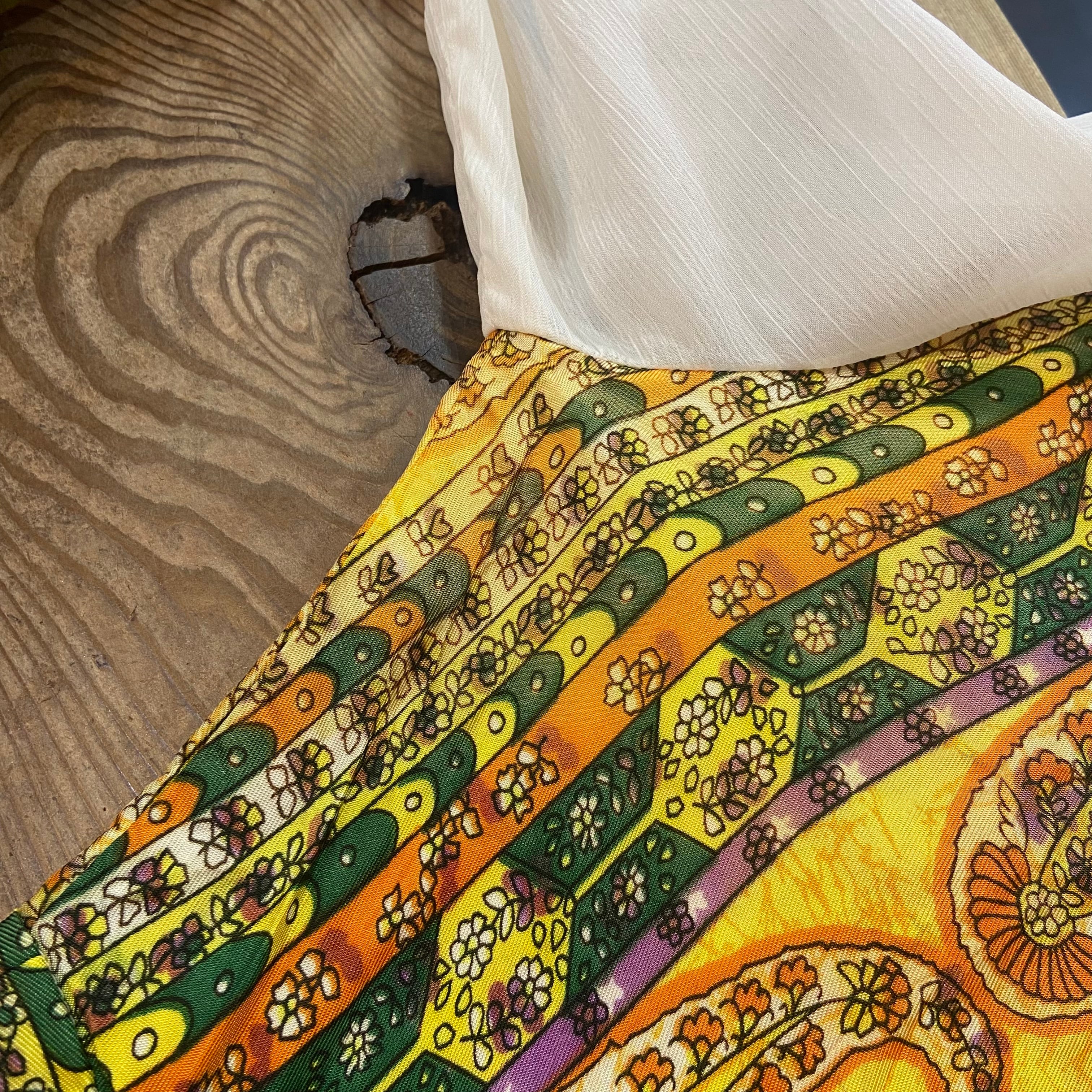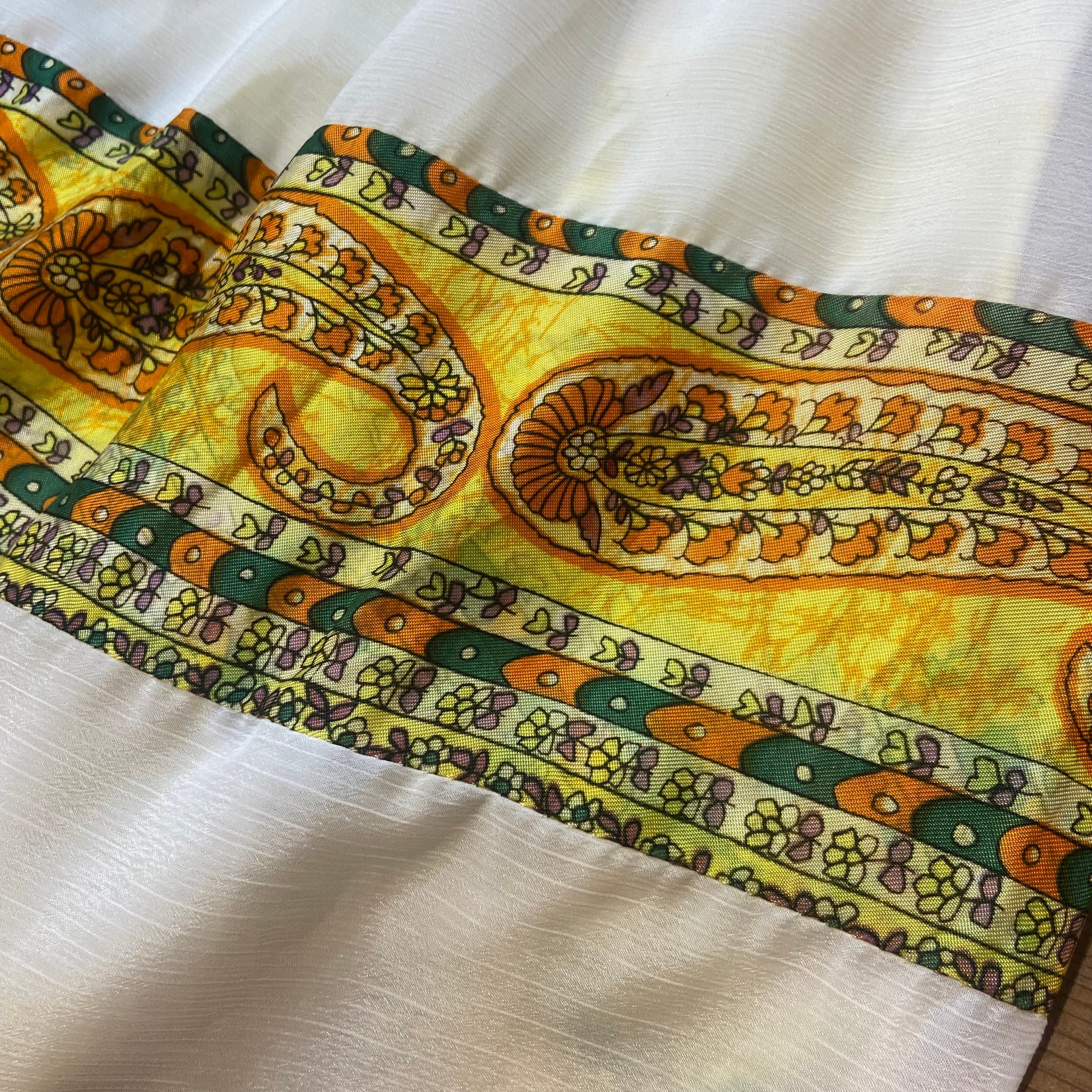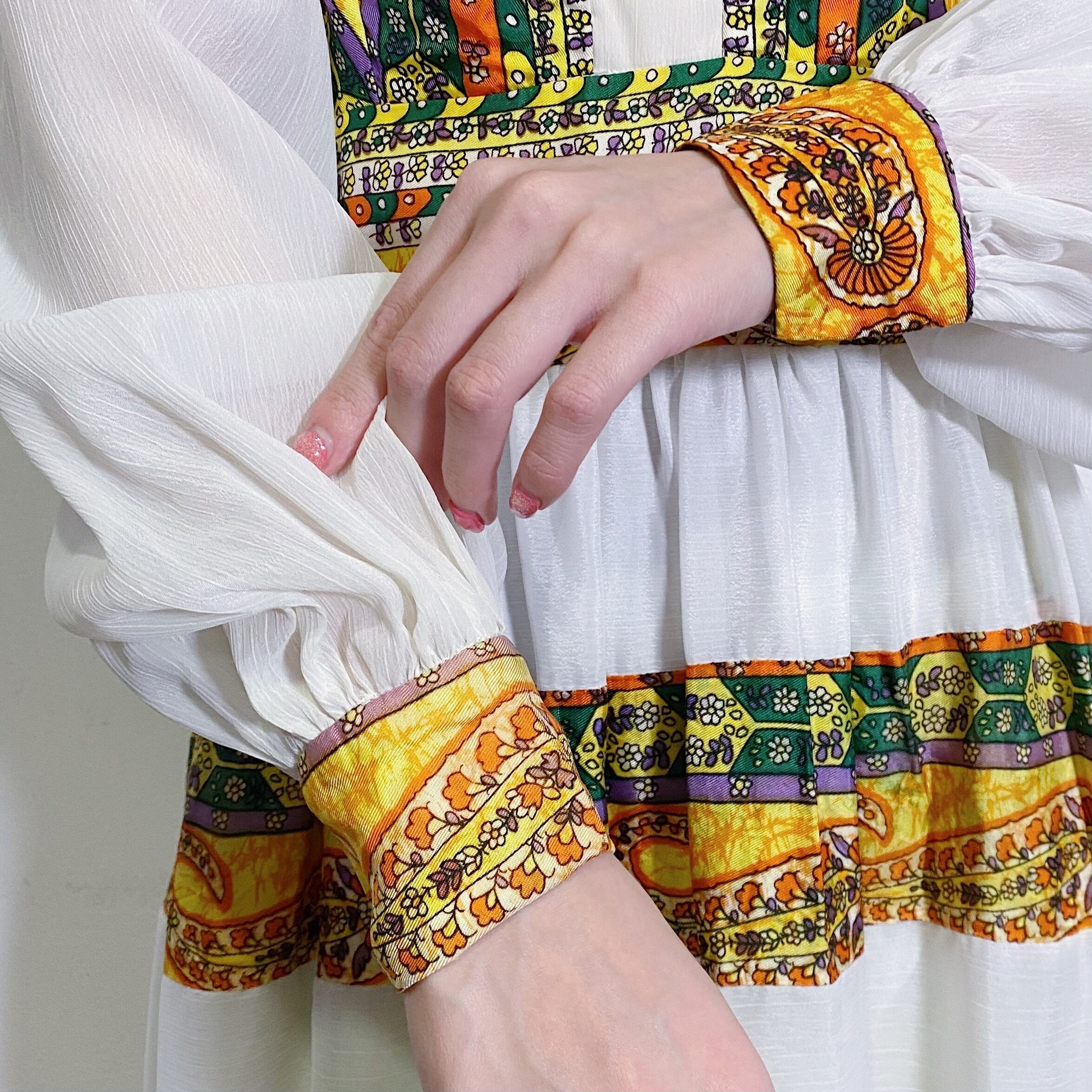 白と黄色の色合いにペイズリー柄が可愛い、60年代頃のロングワンピースです。