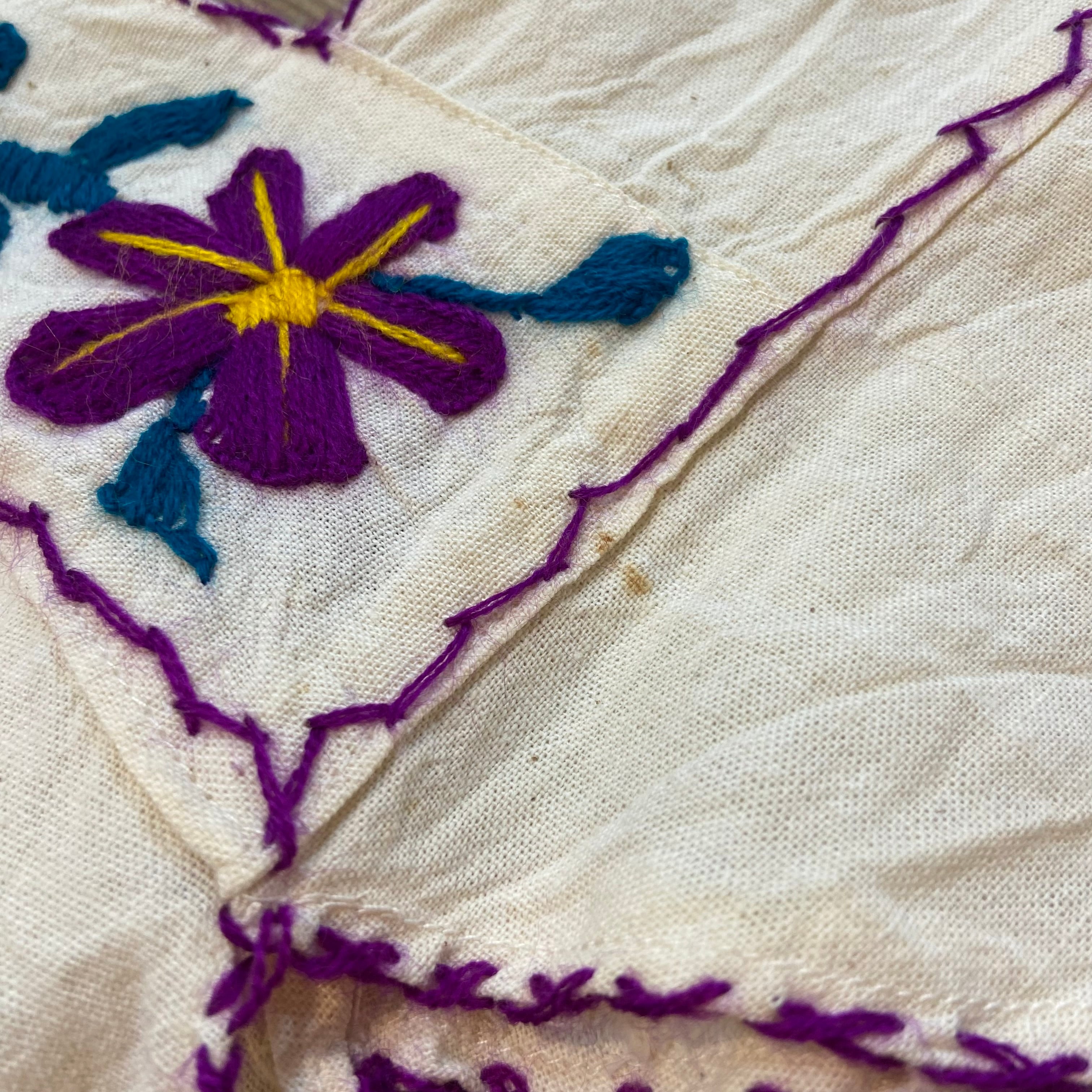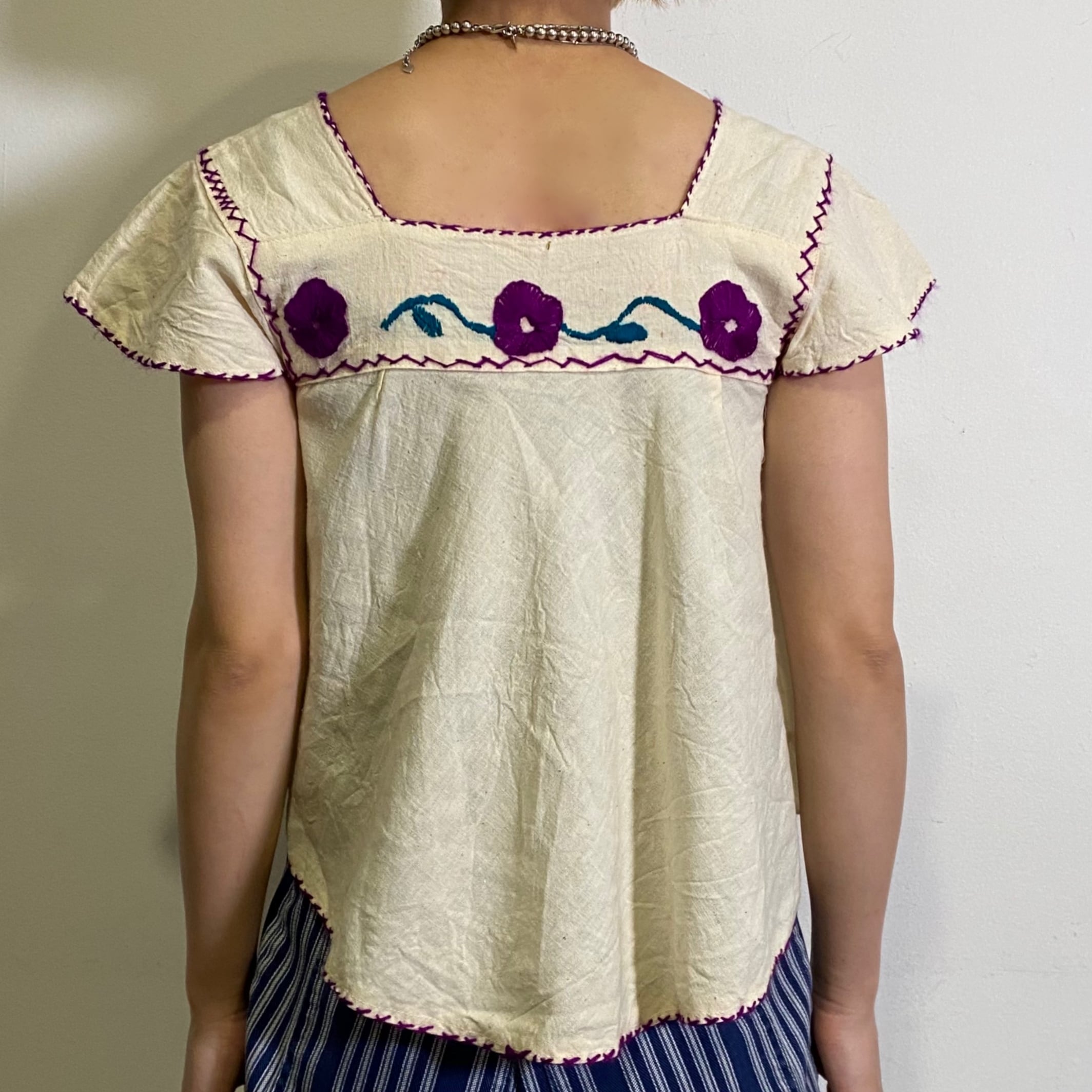 フロントに並んだパープルの手刺繍のお花が可愛い、メキシコの70年代のトップスです。