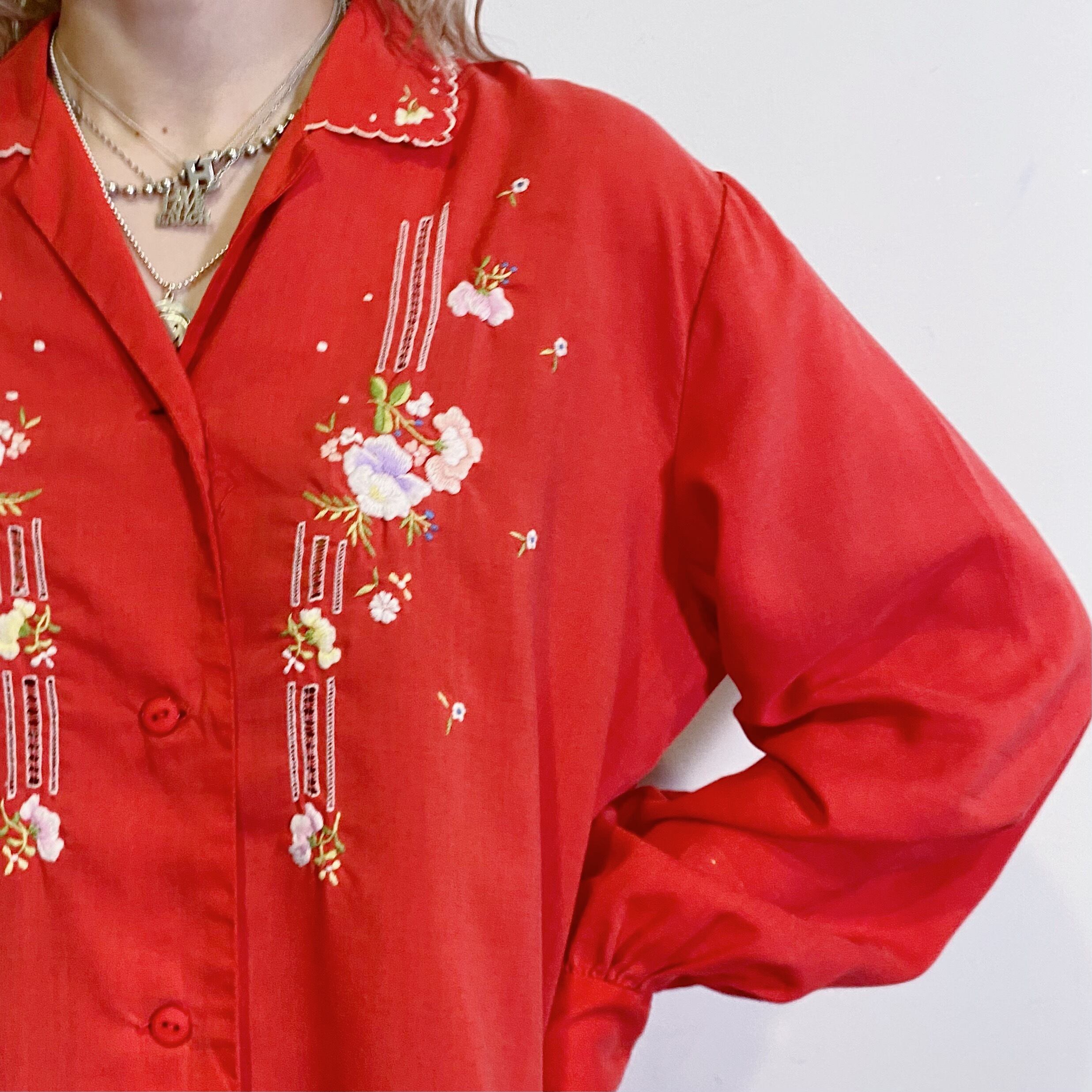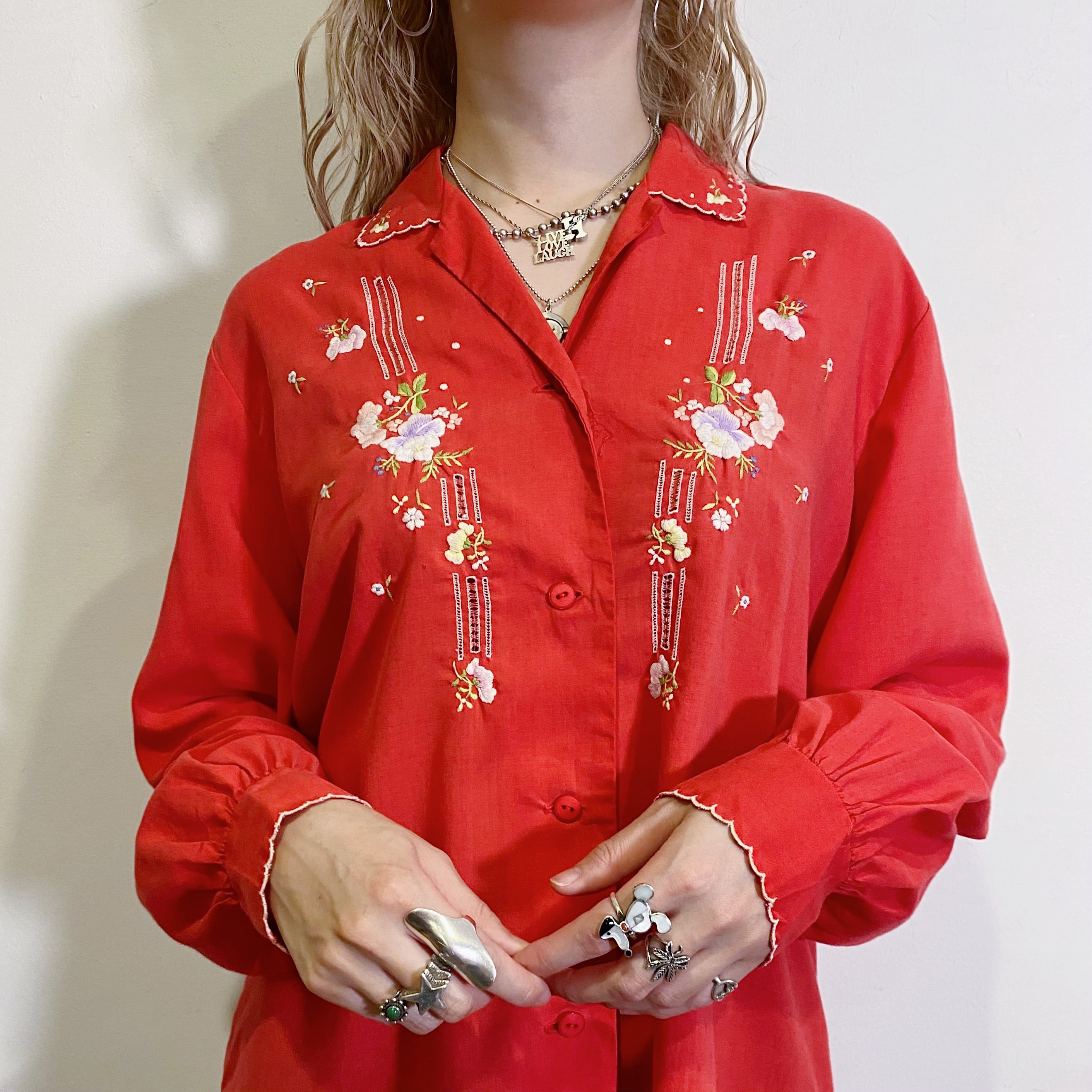 お花の刺繍や透かしデザインが可愛い、70年代のチャイナシャツです。