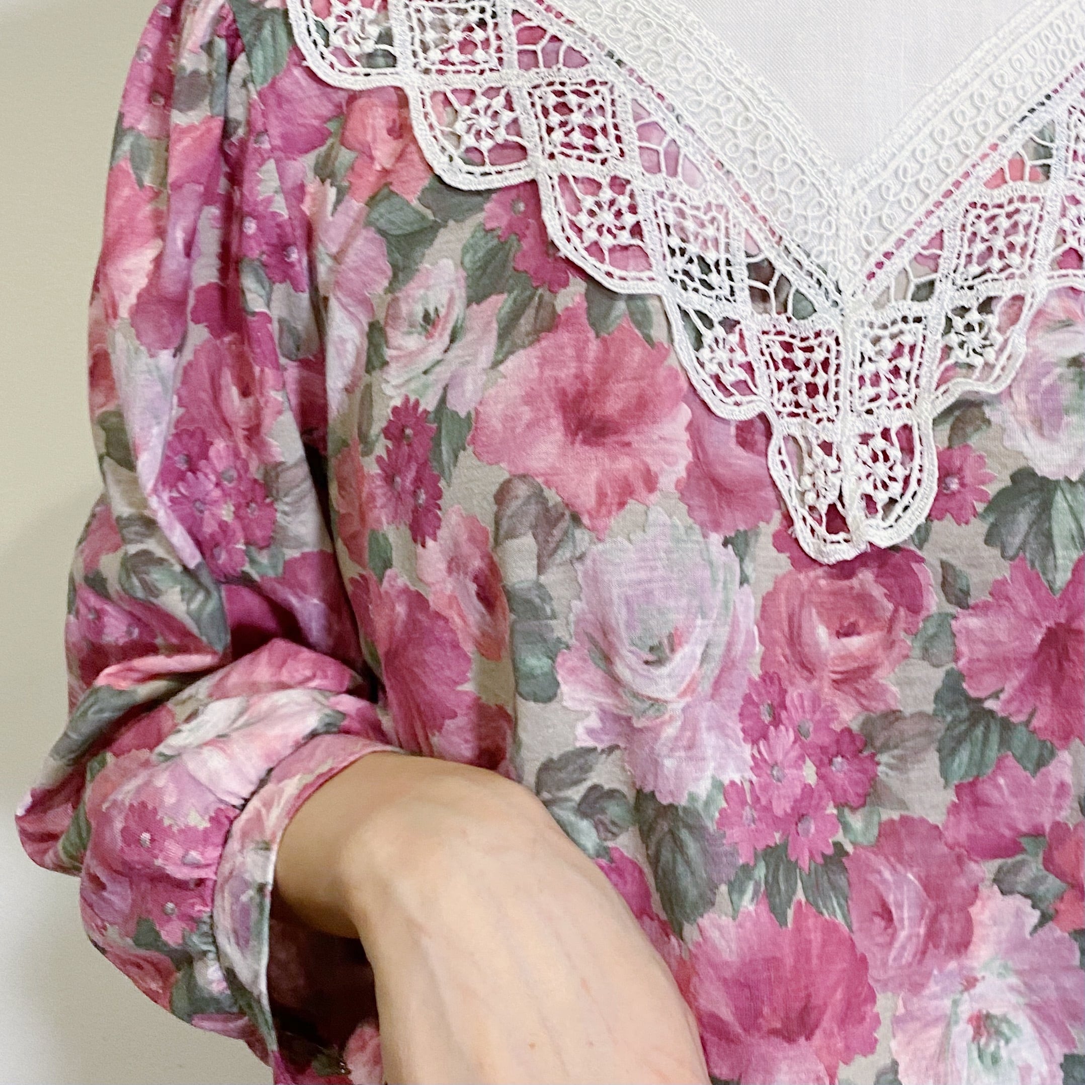 ピンクカラーの水彩画タッチのお花柄が可愛い、80年代のトップスです。