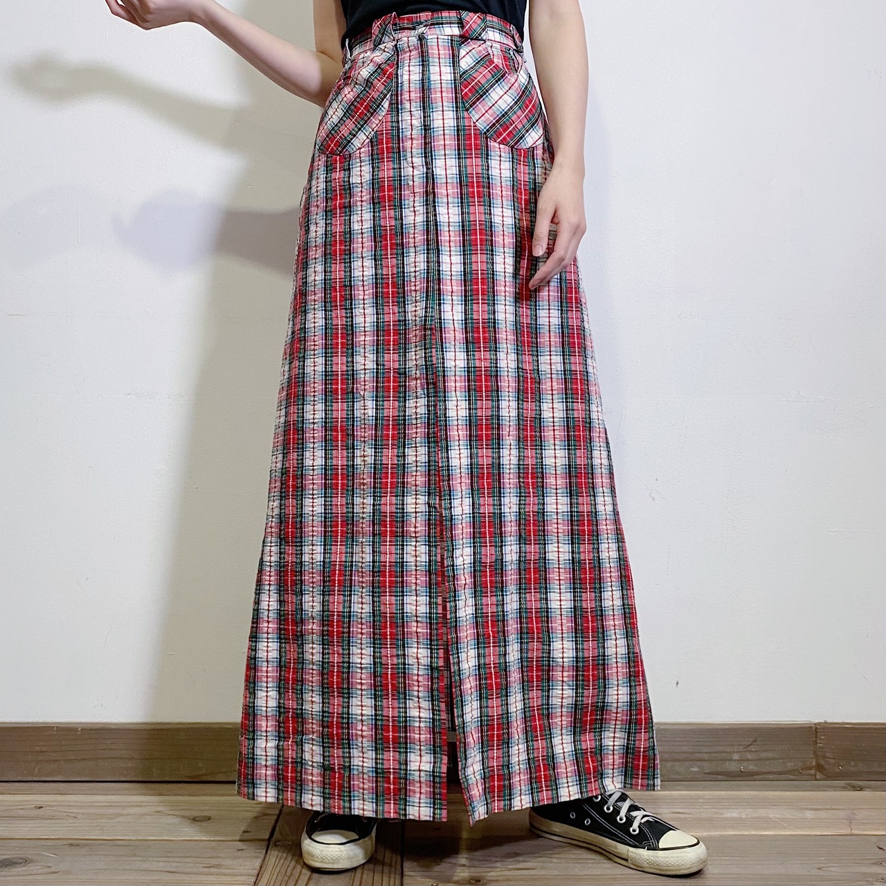 赤や白のチェックが可愛い、70年代のロングスカートです。