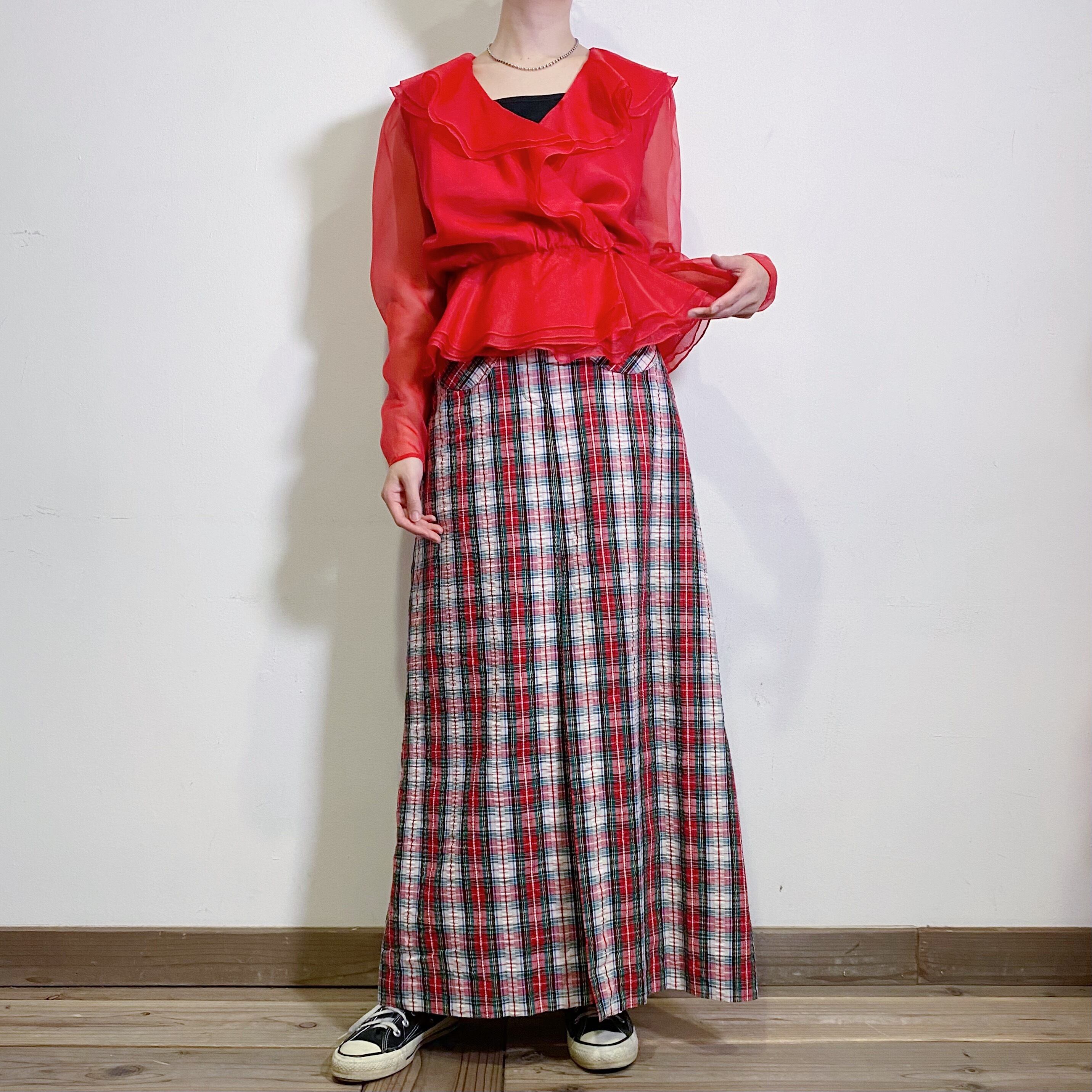 鮮やかなレッドカラーにフリフリとした襟が可愛い、80年代のブラウスです。