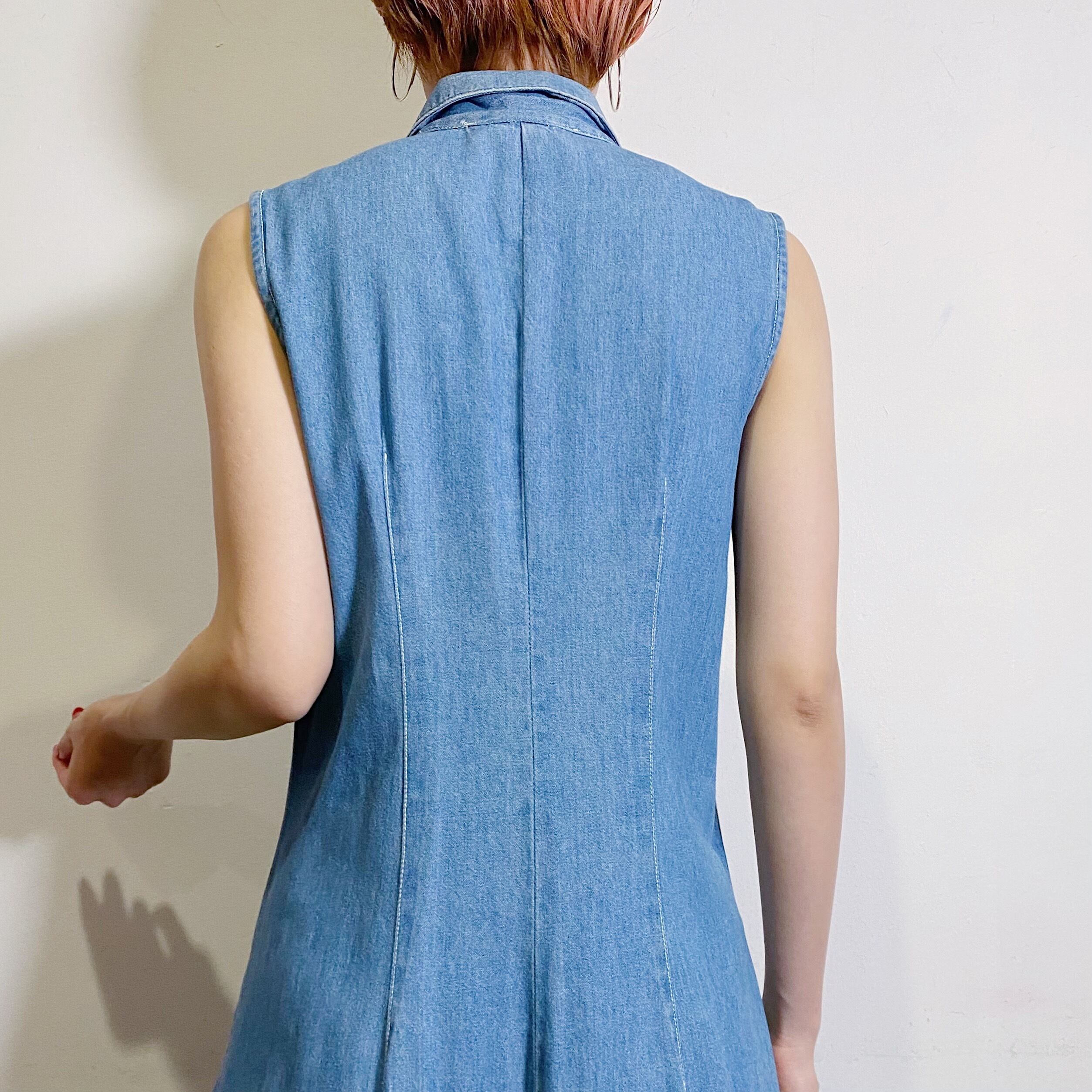 綺麗なAラインのフレアシルエットが魅力的な、デニム地のノースリーブワンピースです。