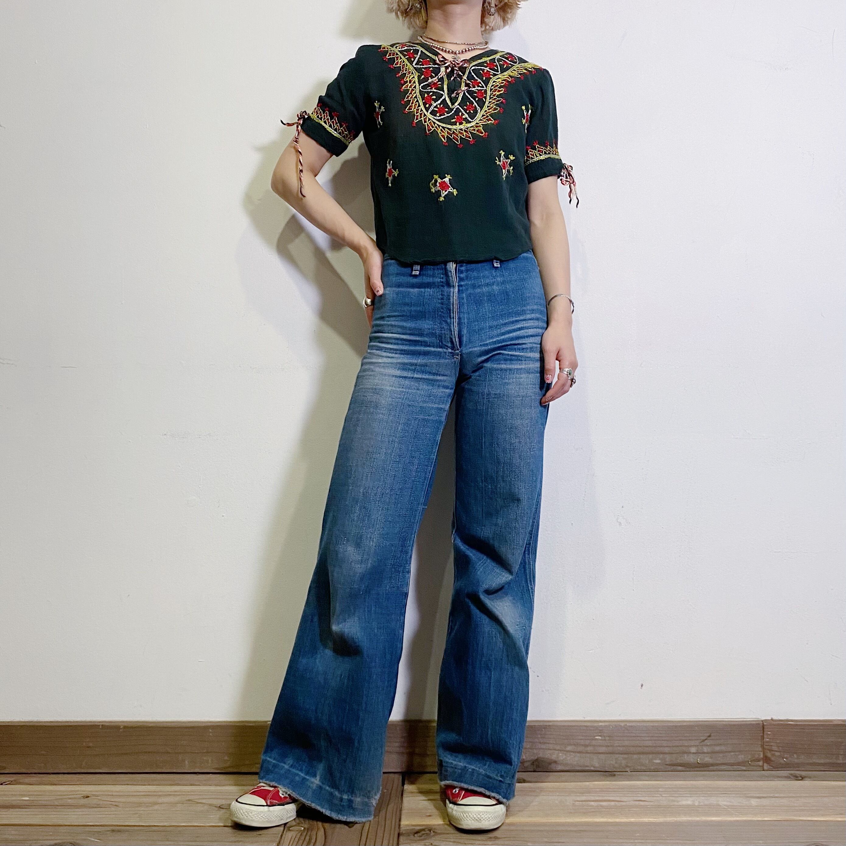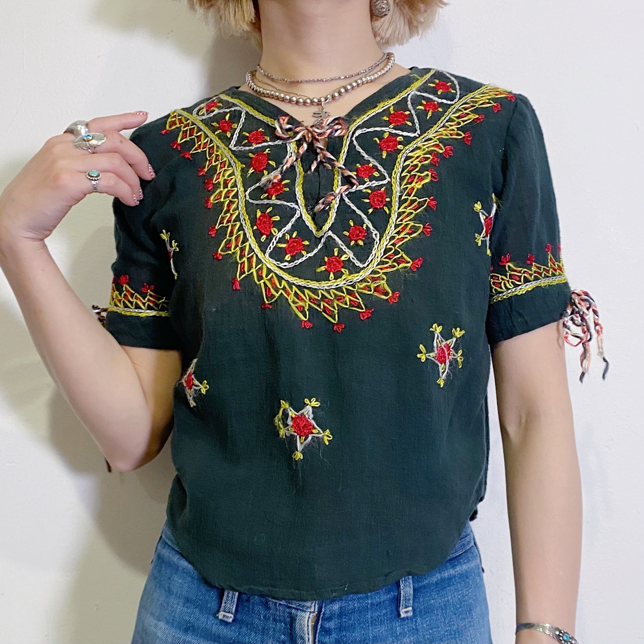 ブラックベースに赤と黄色の刺繍が映える、70年代の半袖トップスです。