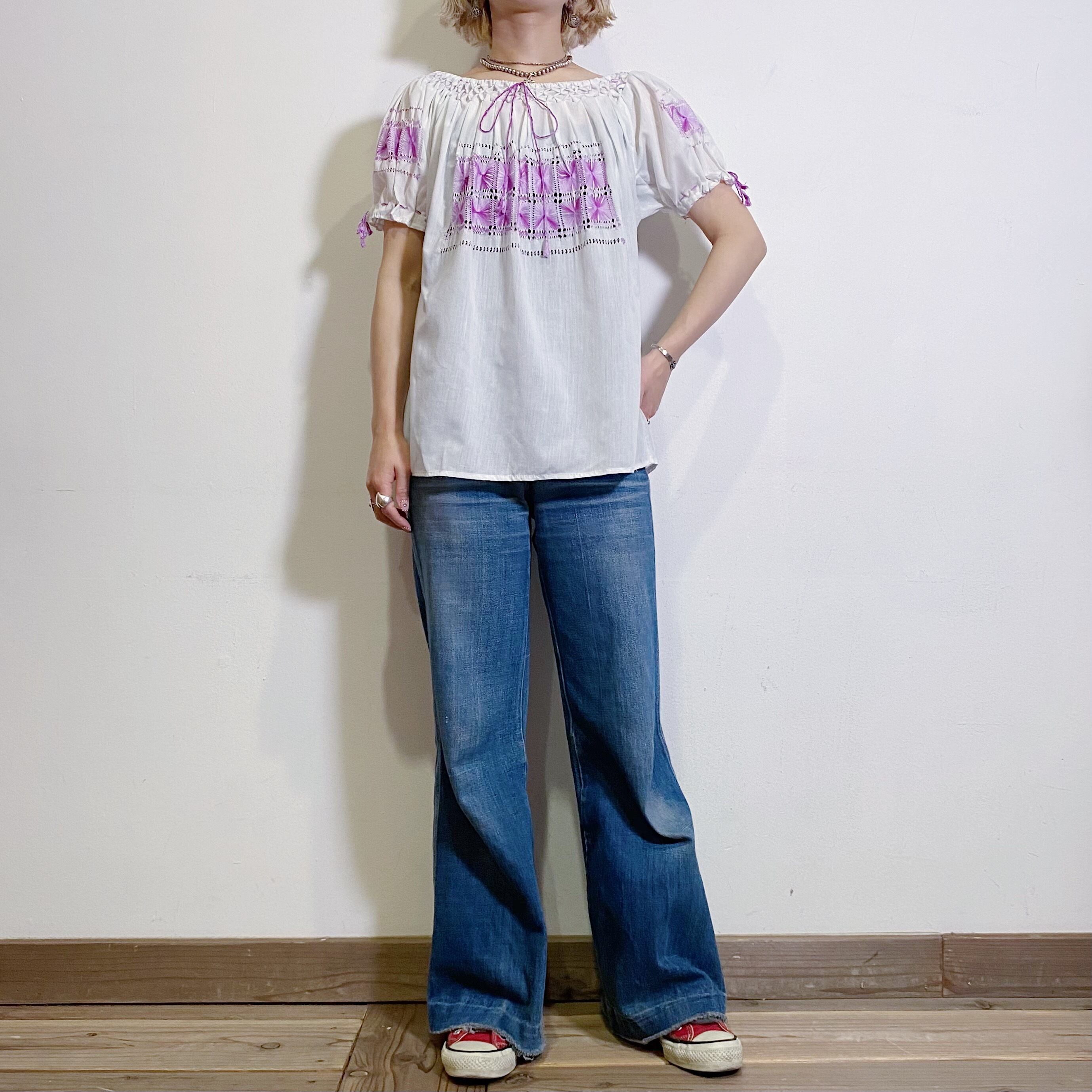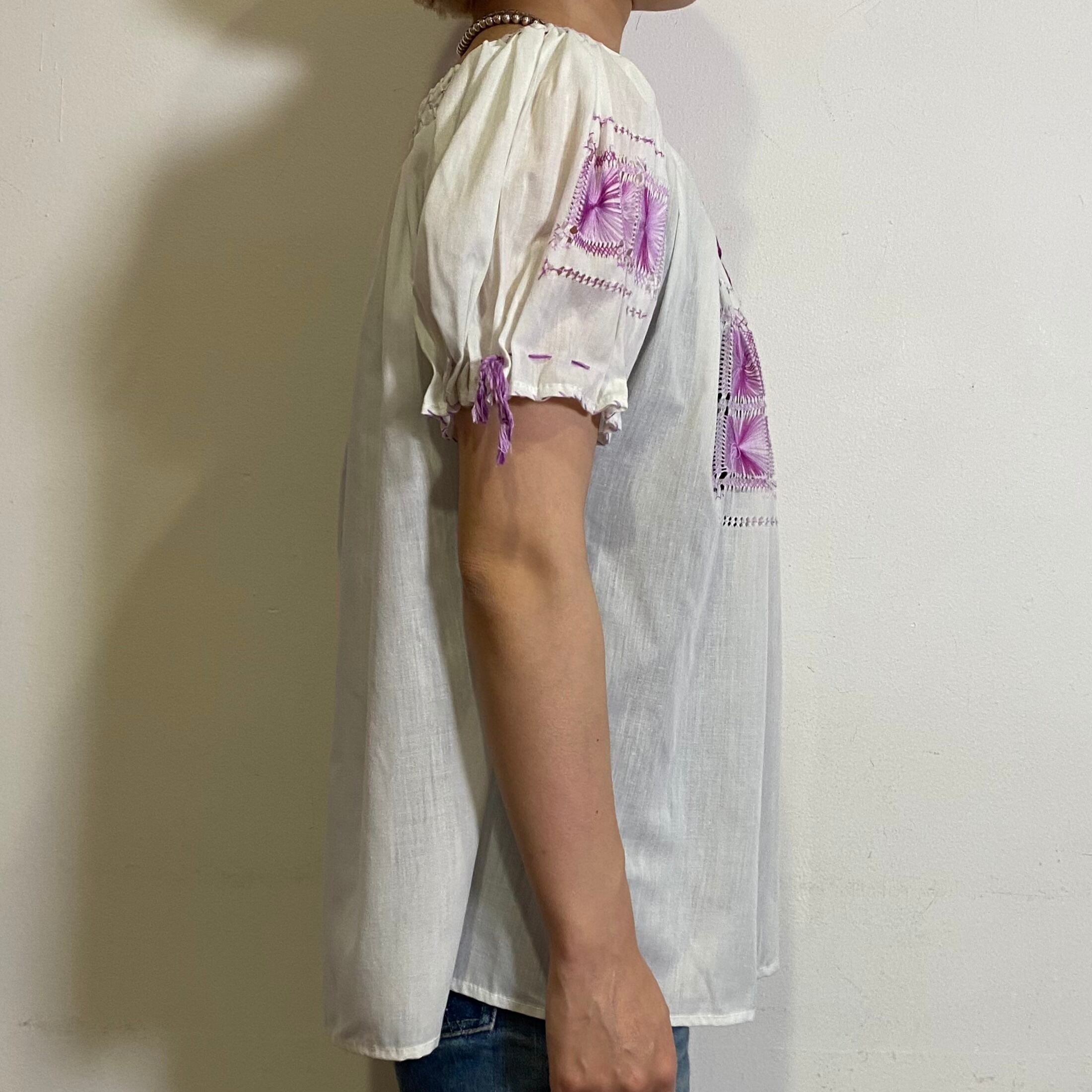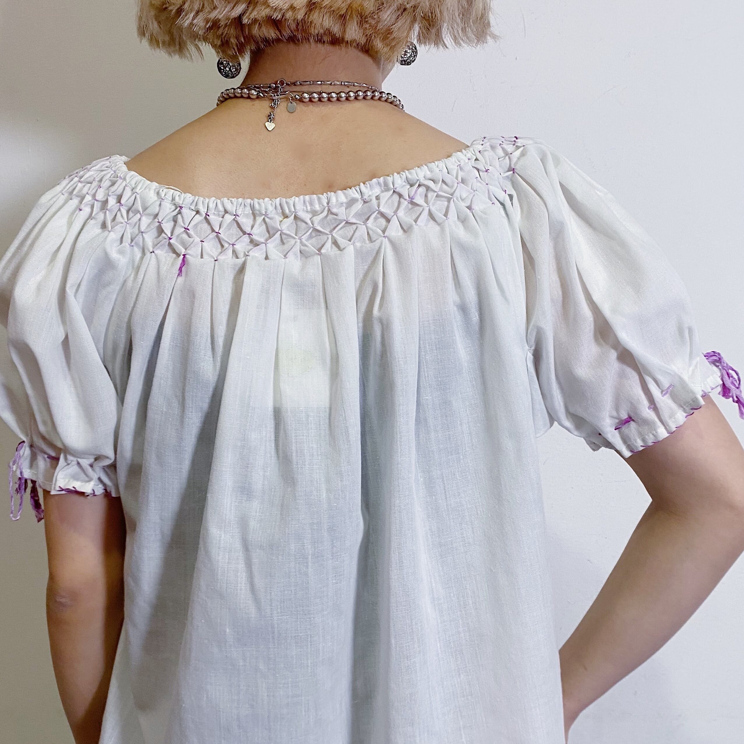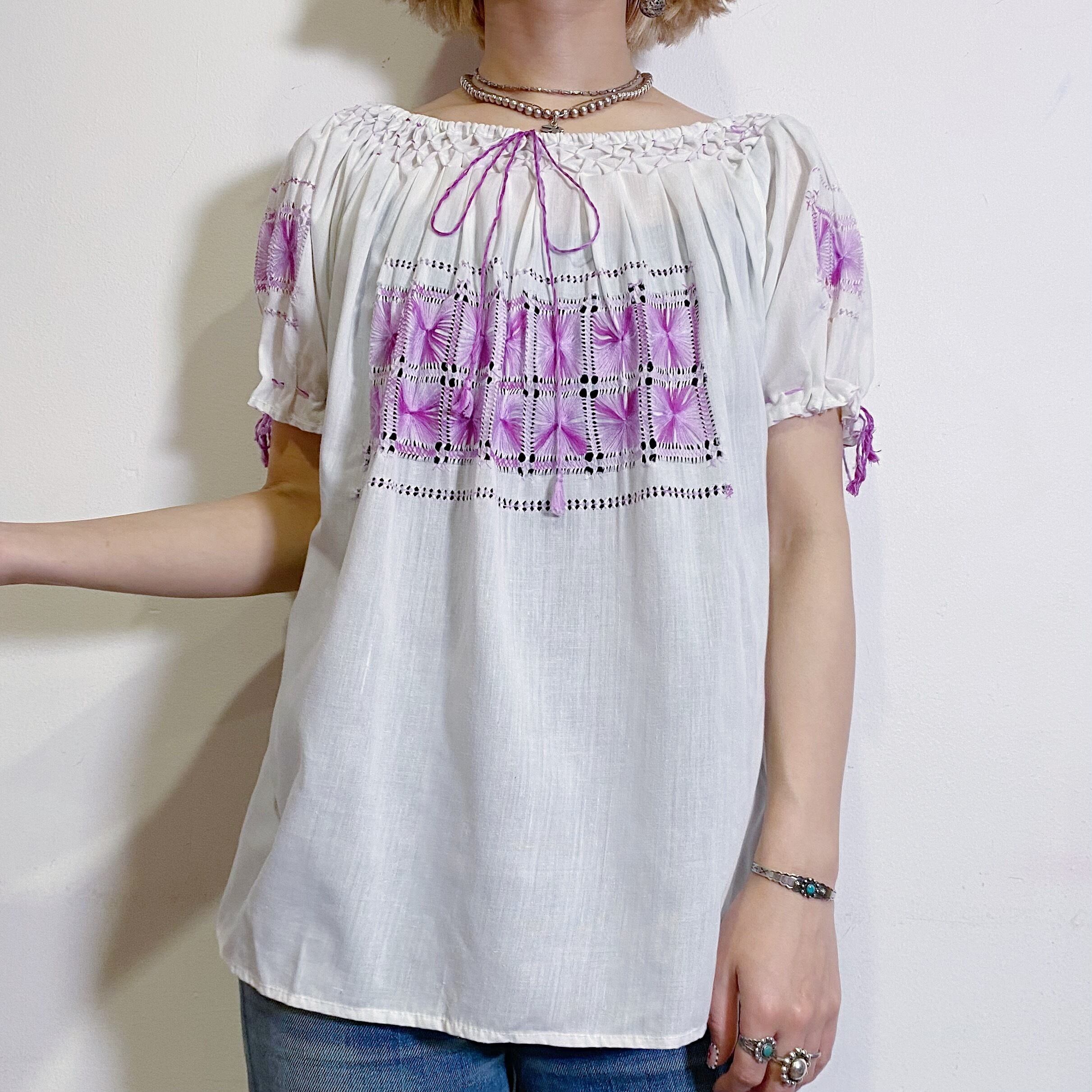 パープルのグラデーションの絞りのような、とても細かな手刺繍が素敵な70年代のチュニックです。