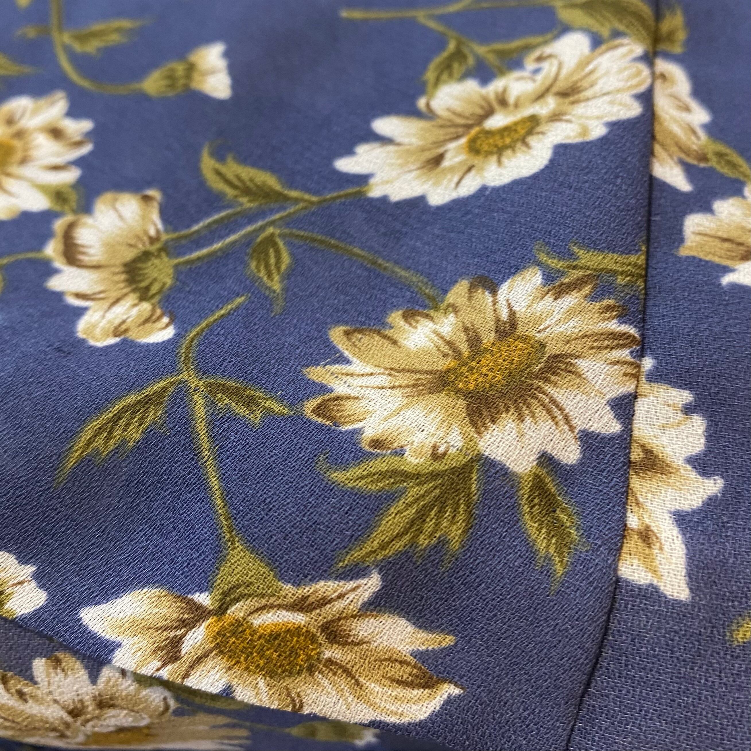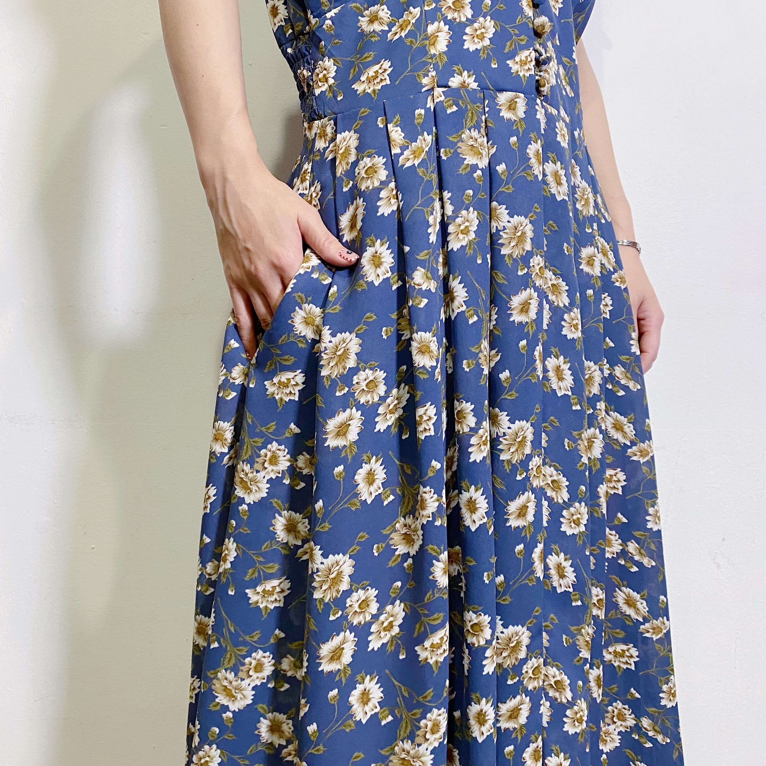 くすみブルーの色合いが可愛い、花柄ワンピースです。