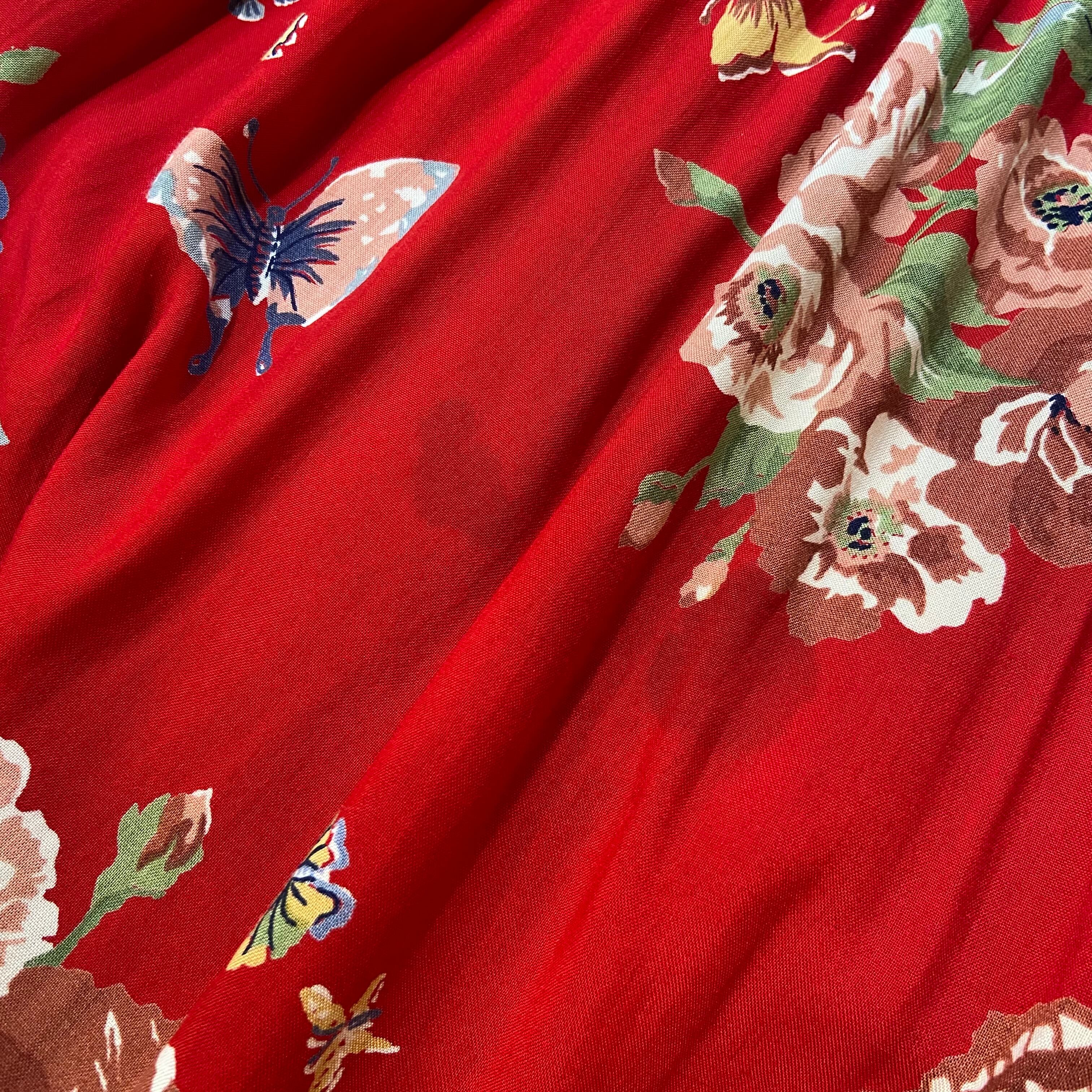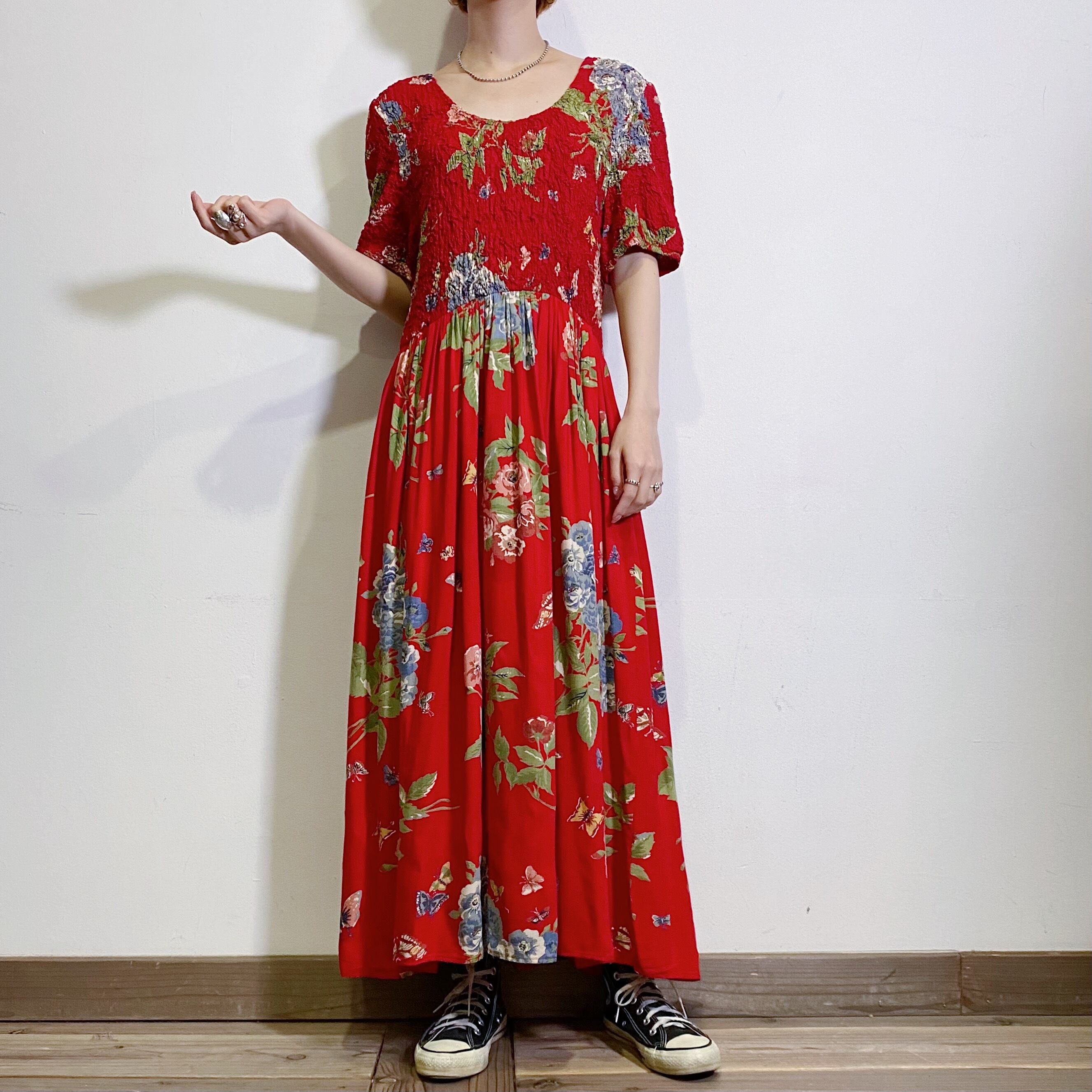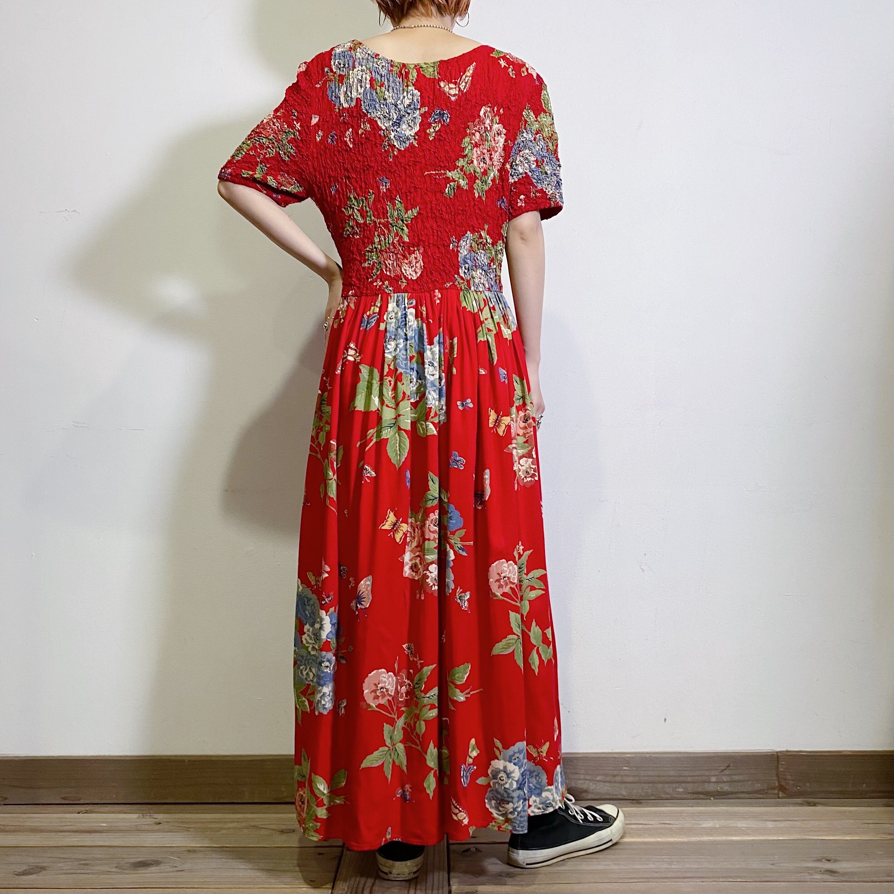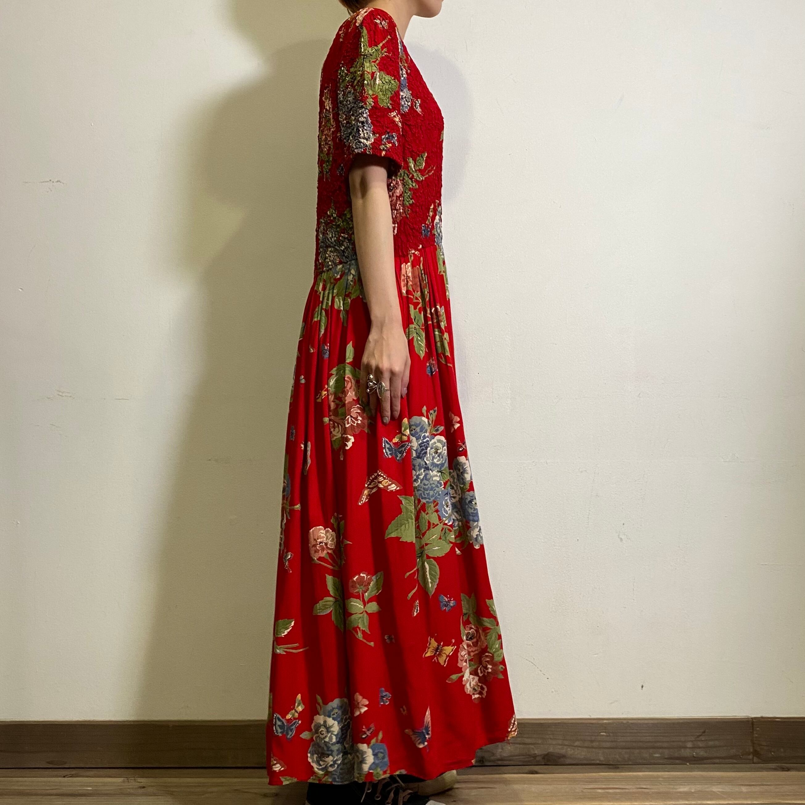 お花と蝶々のプリントが可愛い、80年代のロングワンピースです。