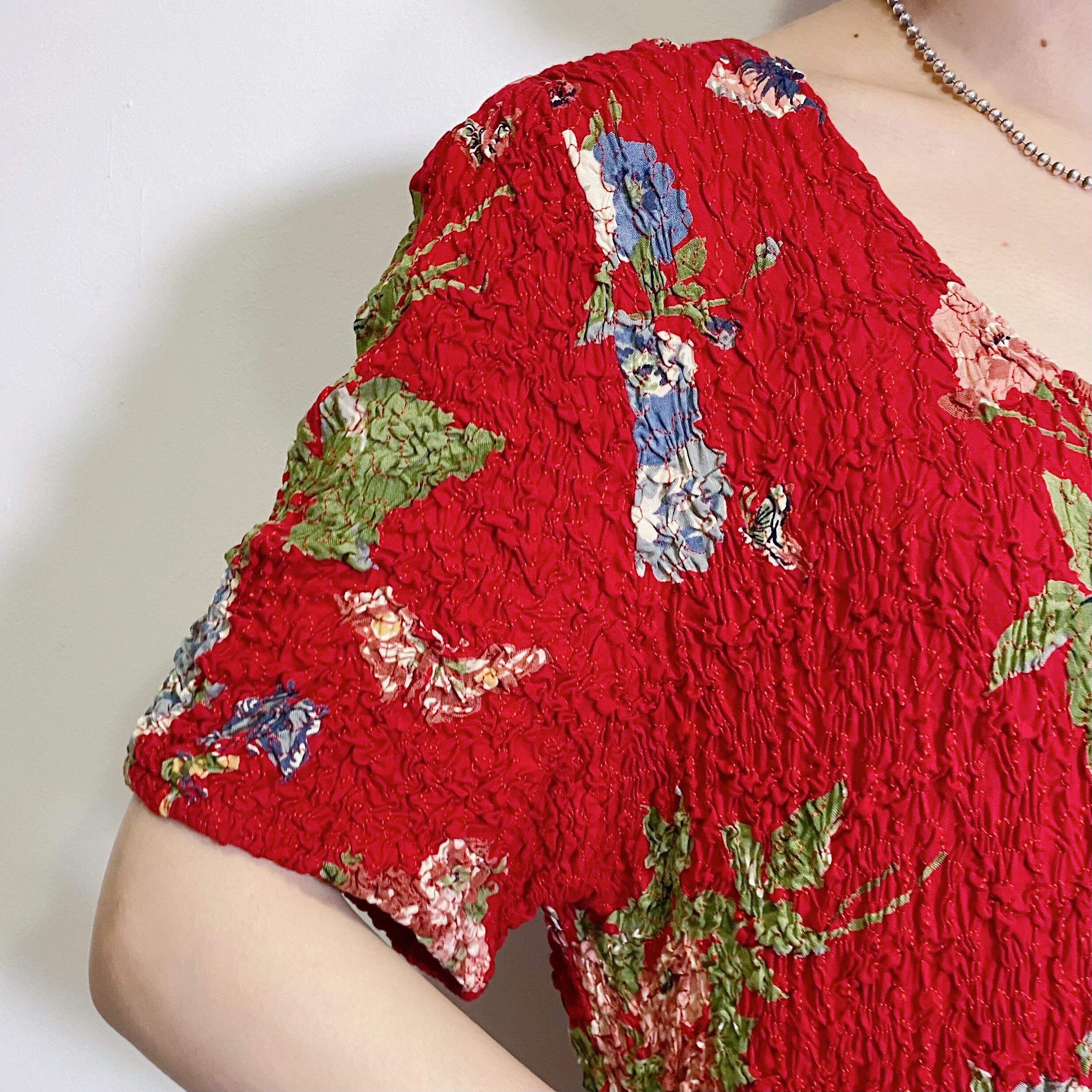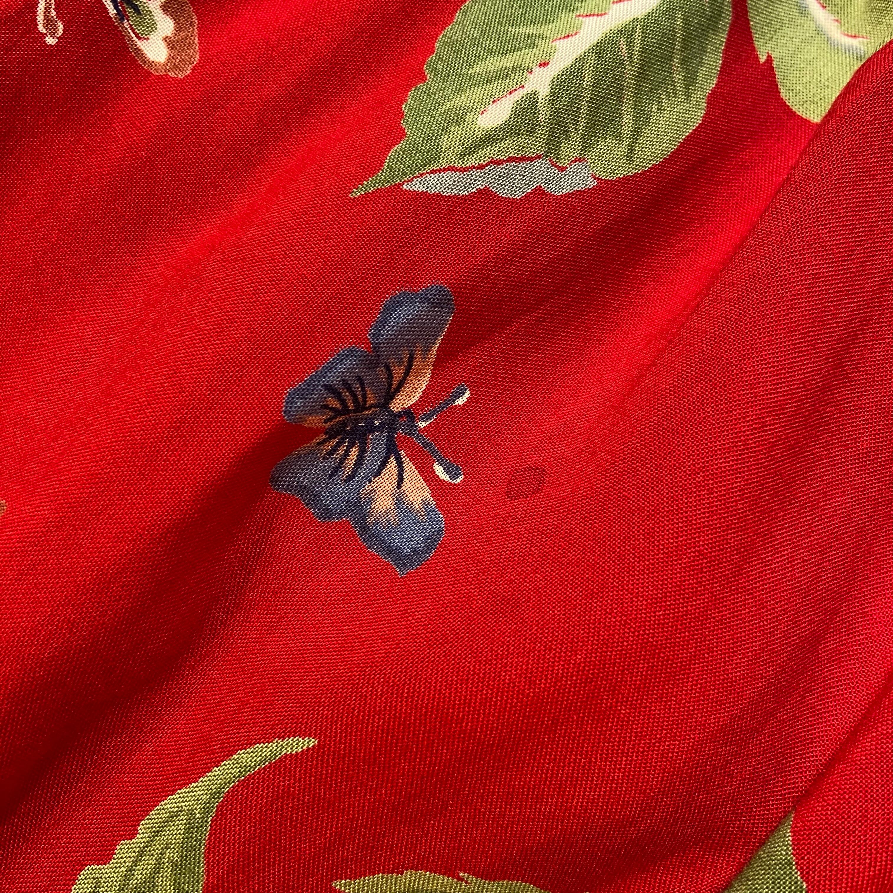 レッドベースにカラフルながらも淡い色味も魅力的です。