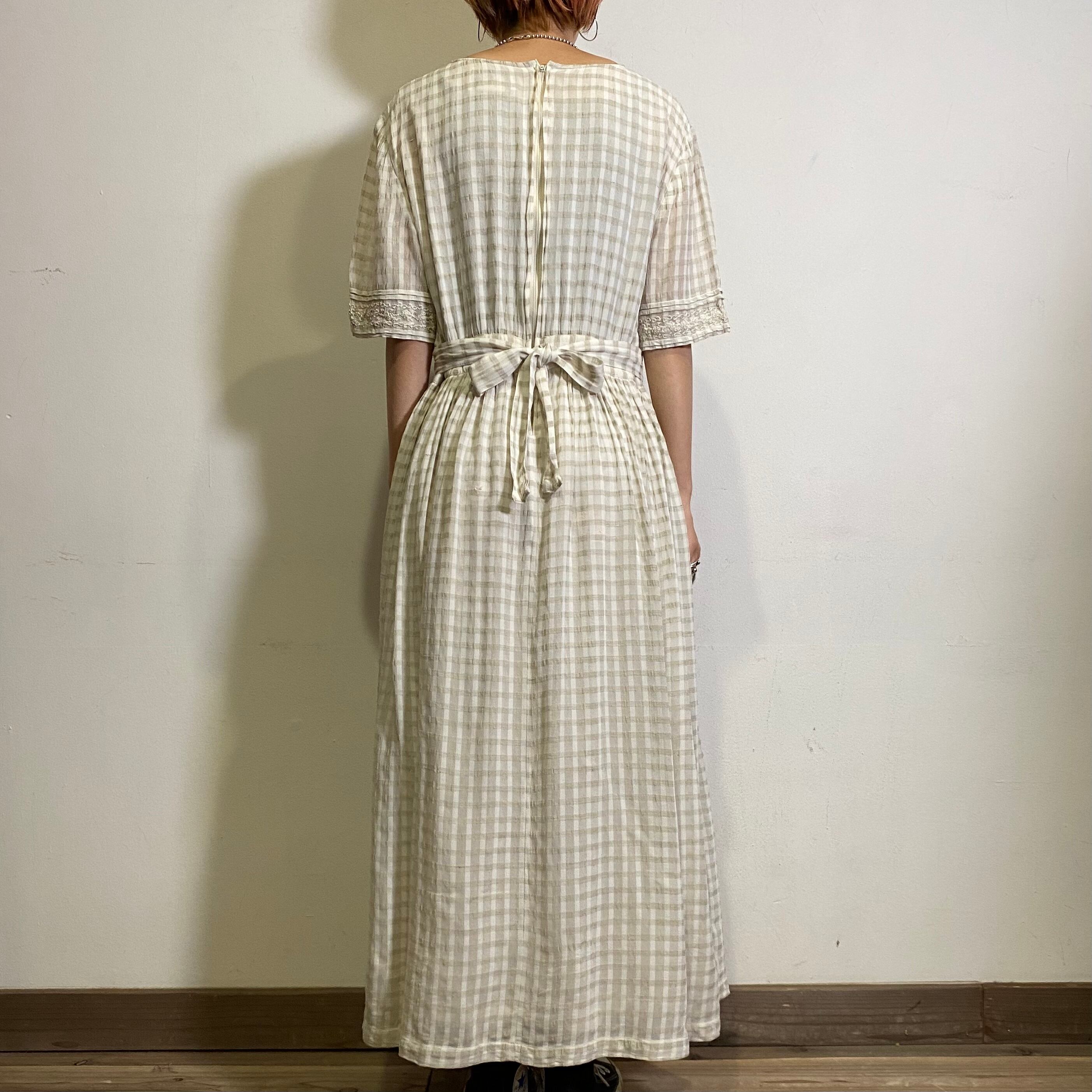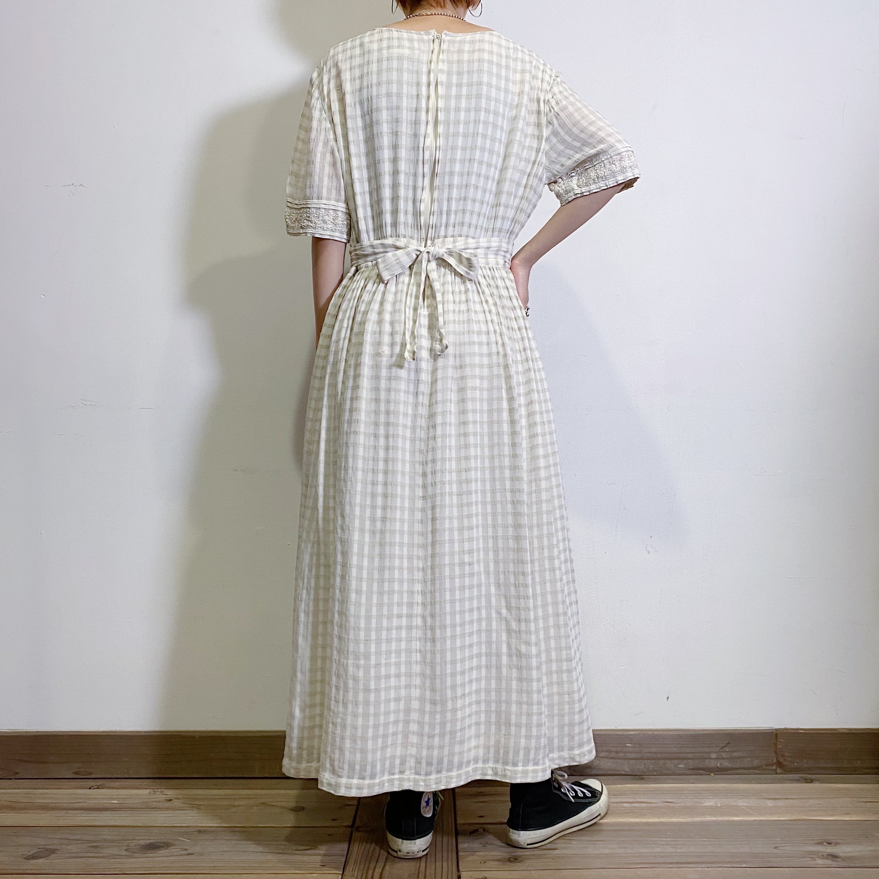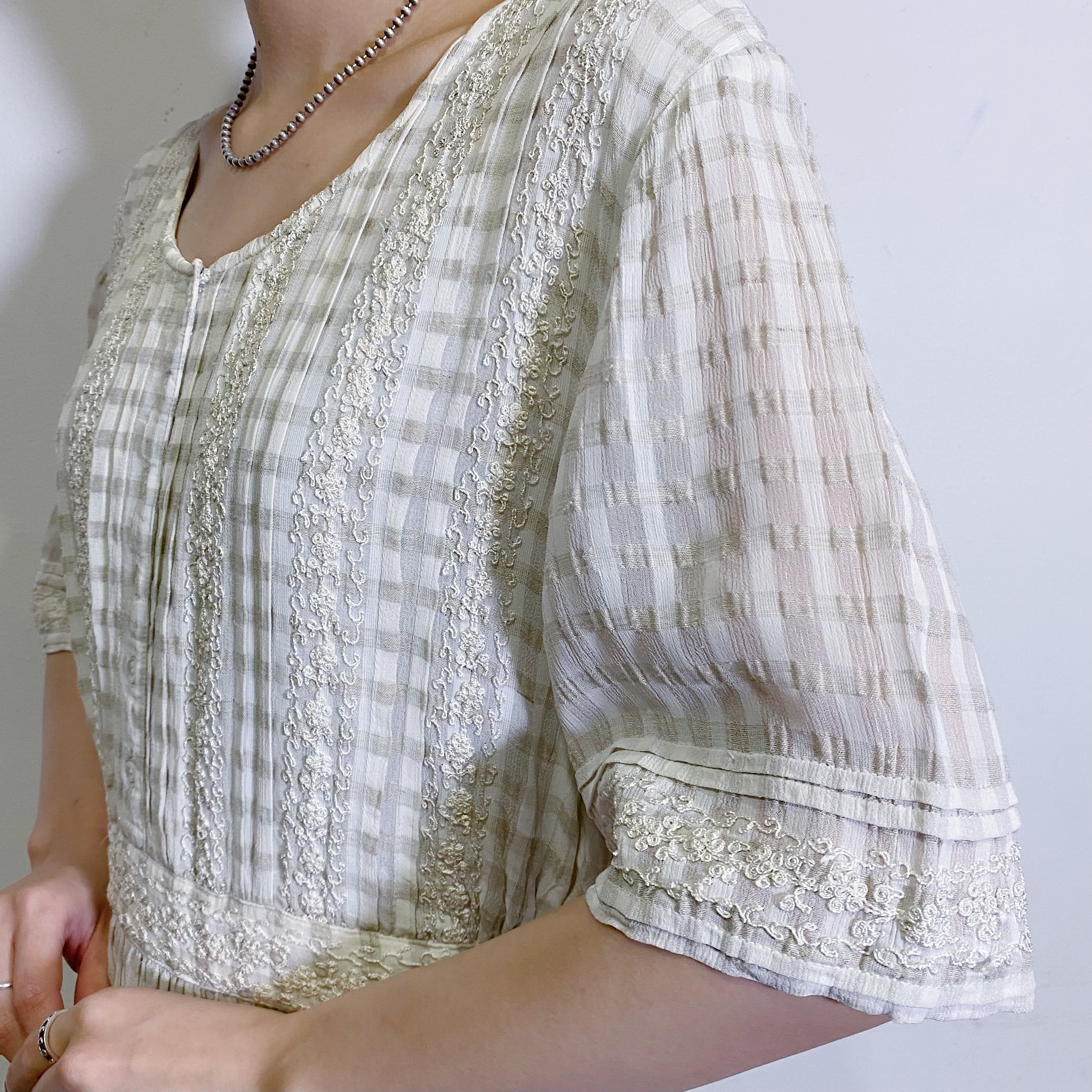 ギンガムチェックに胸元や袖口に施された刺繍が可愛い、レーヨン素材のワンピースです。