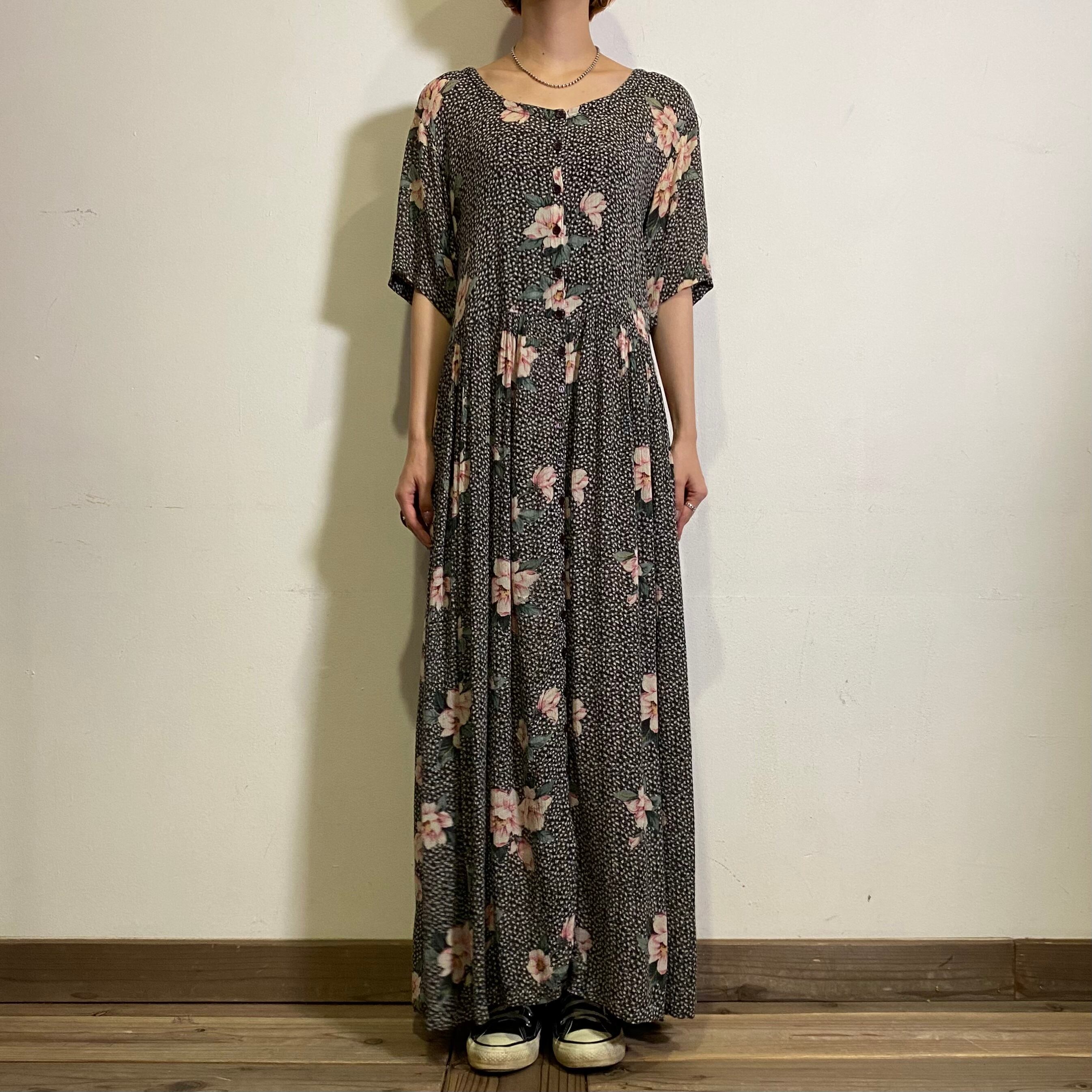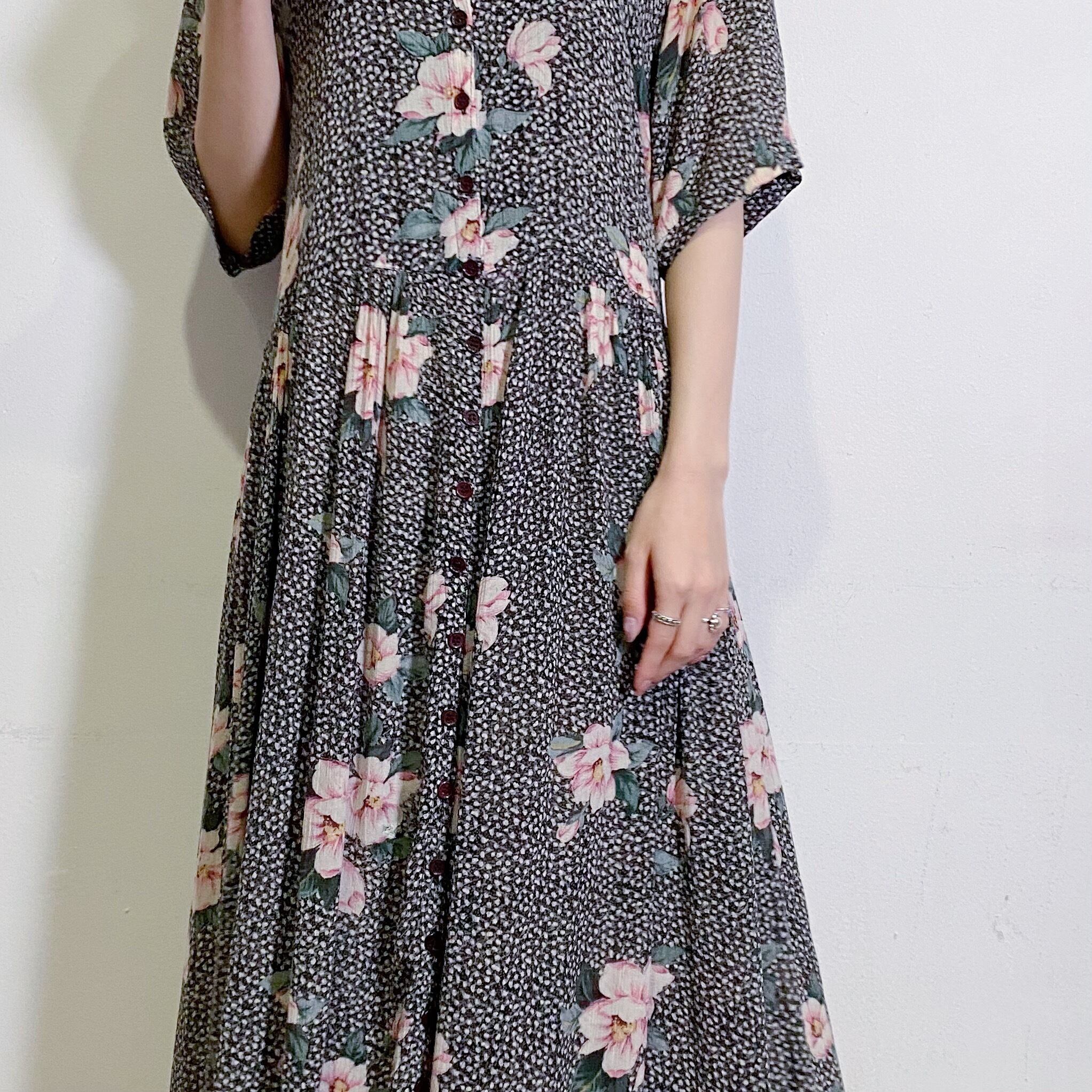 ドットのような柄にピンクのお花が可愛い、レーヨン素材のワンピースです。