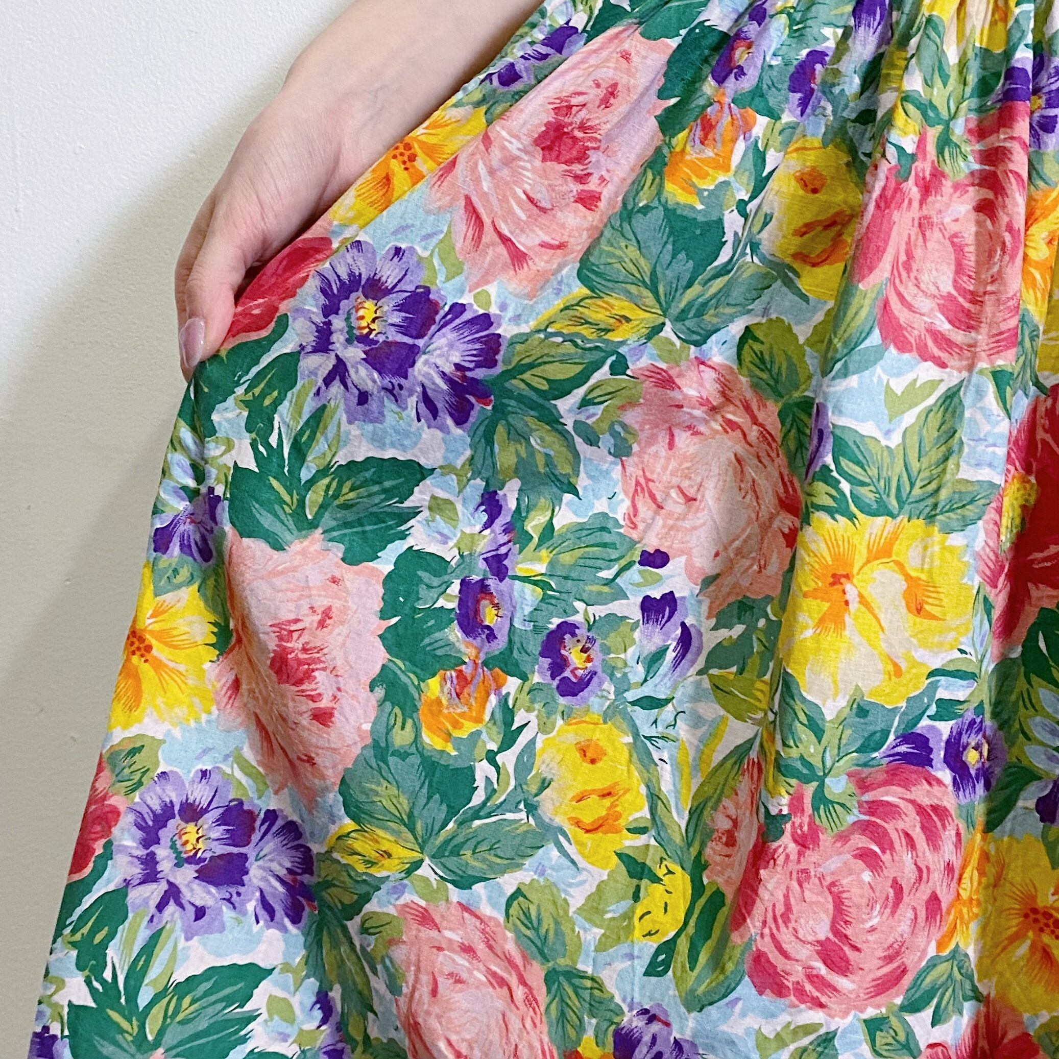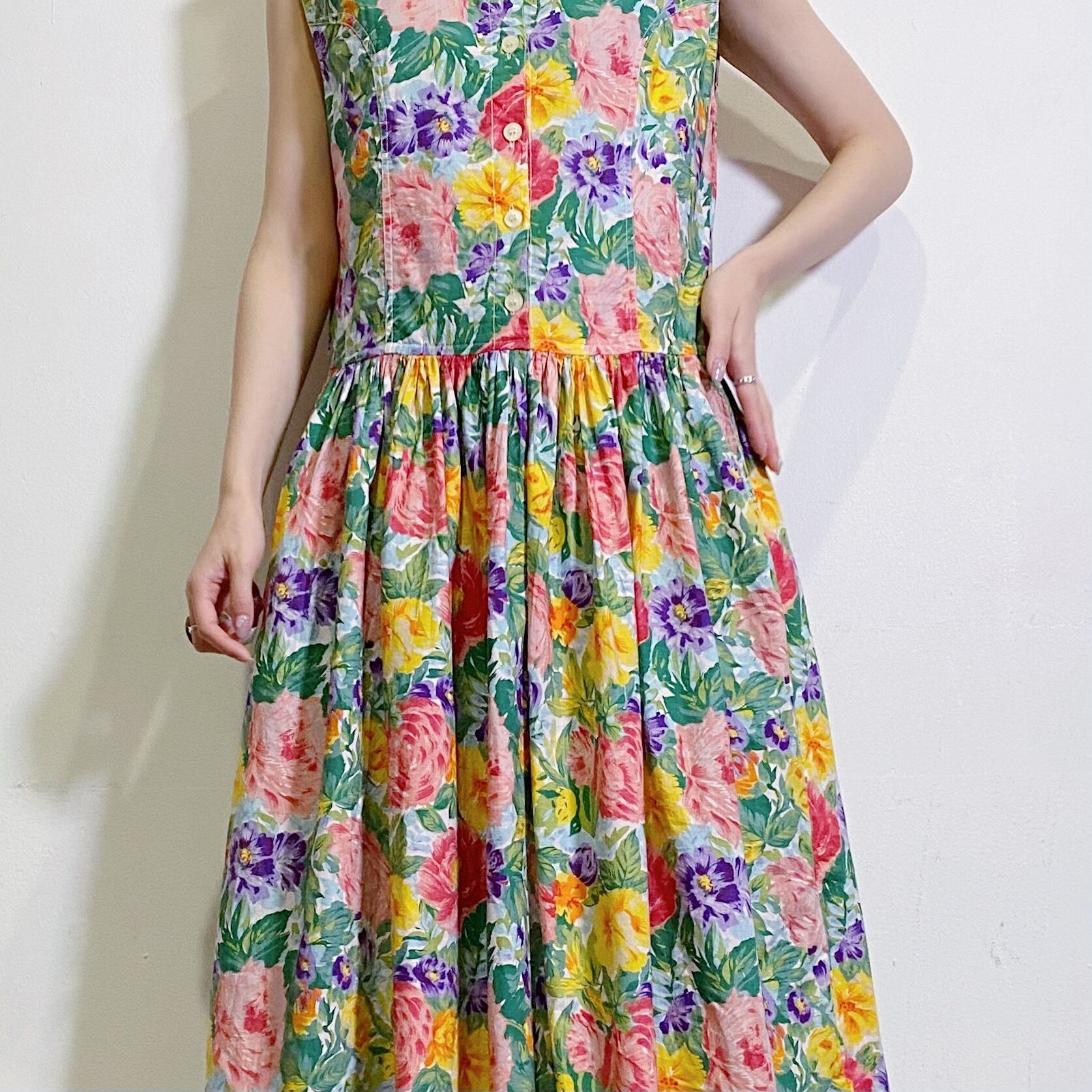 カラフルなお花がびっしりとプリントされた、80年代のワンピースです。