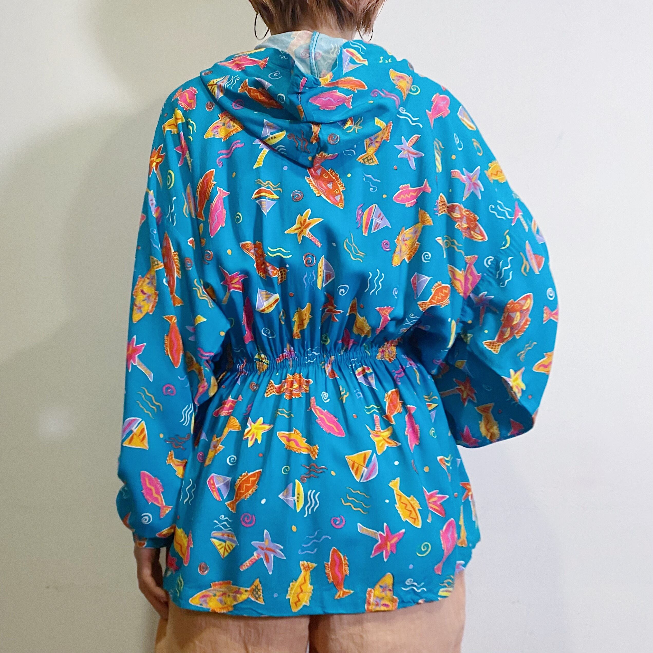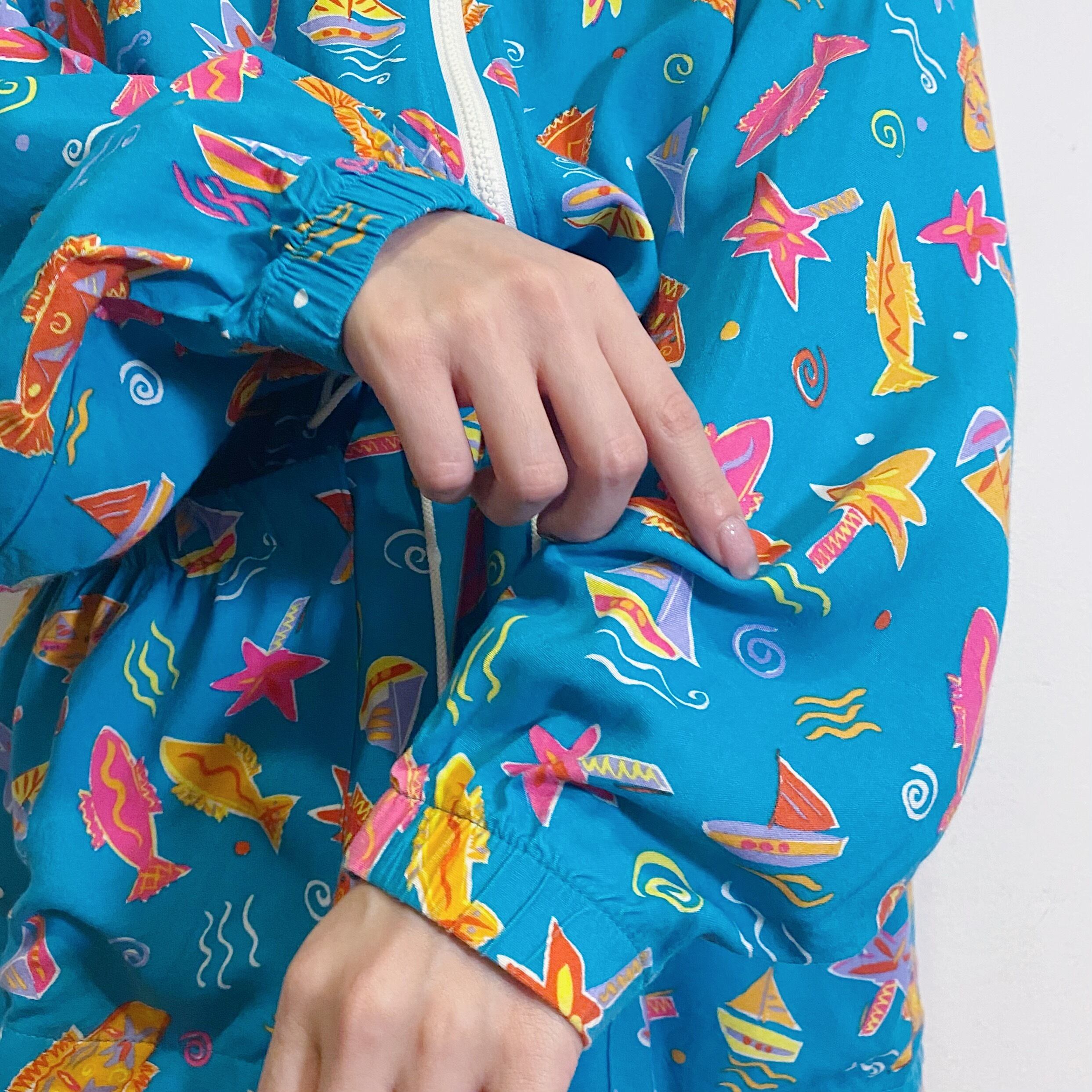 魚やヤシの木・ヨットなどのポップで楽しい柄がキュートな、80年代頃のジャンパーです。