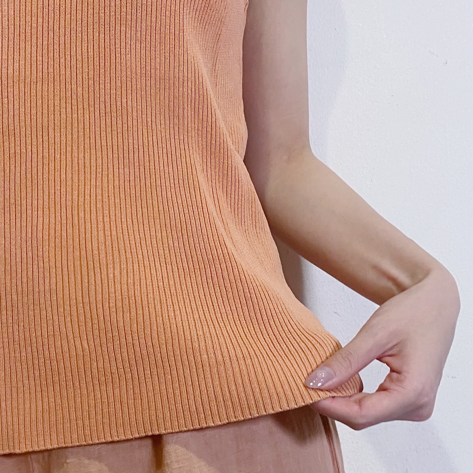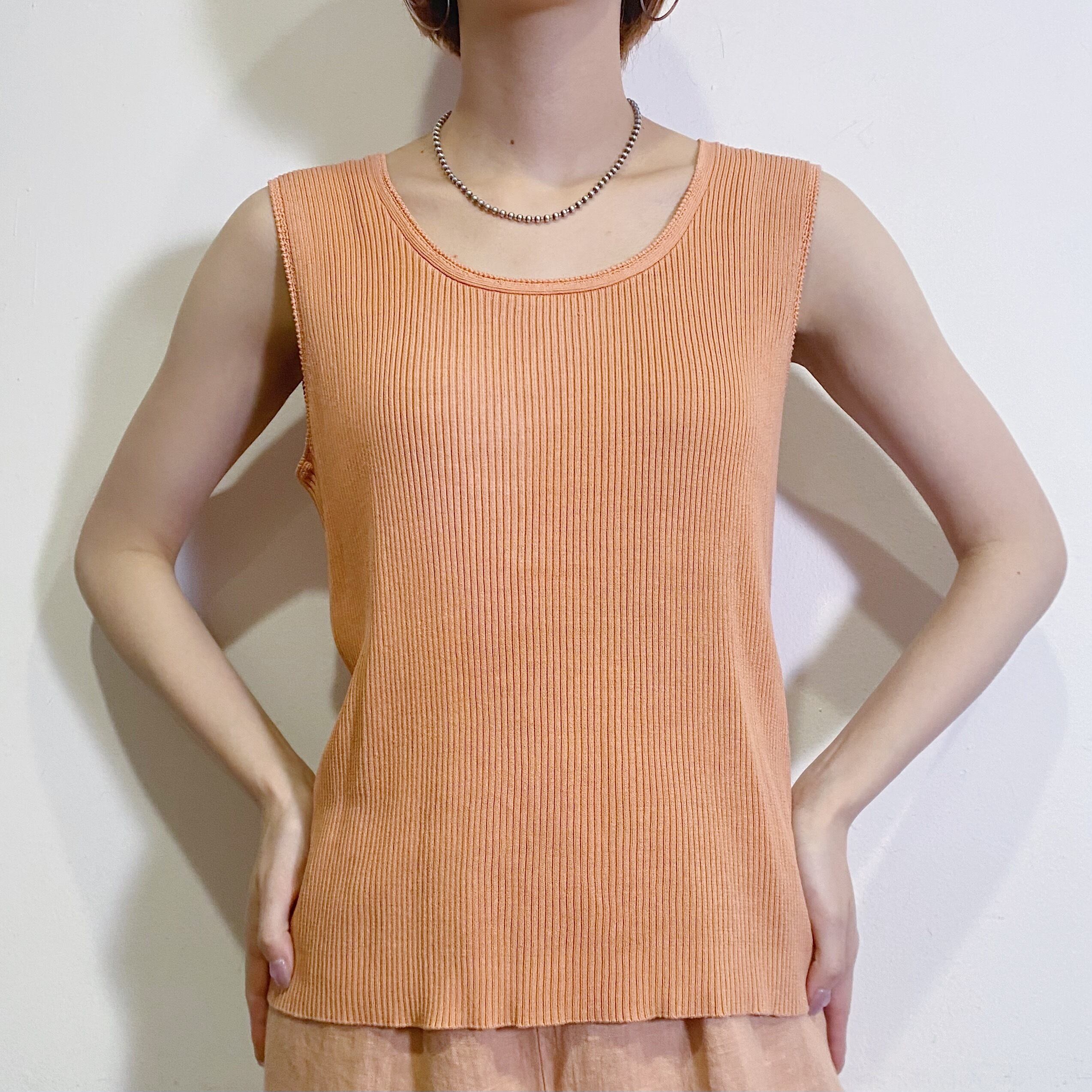 オレンジのようなサーモンピンクのようなカラーが素敵な、ノースリーブトップスです。