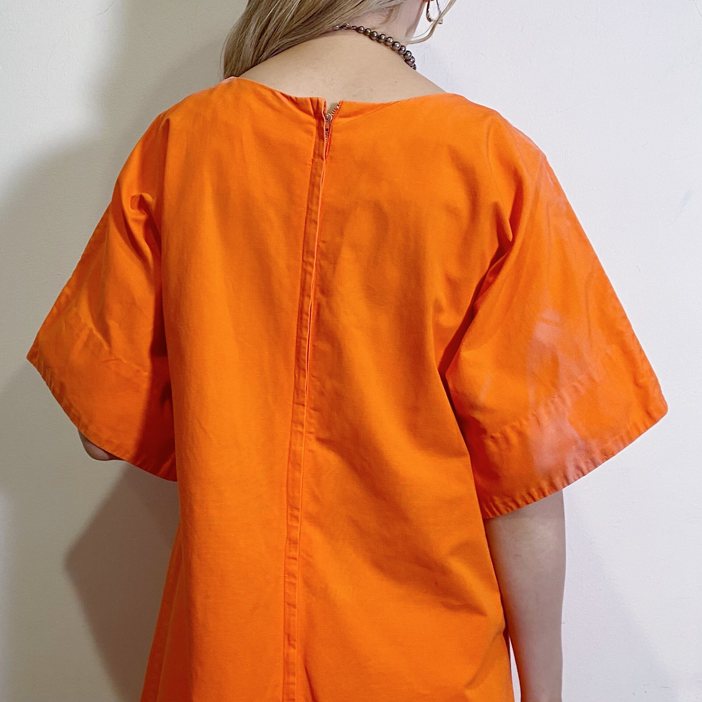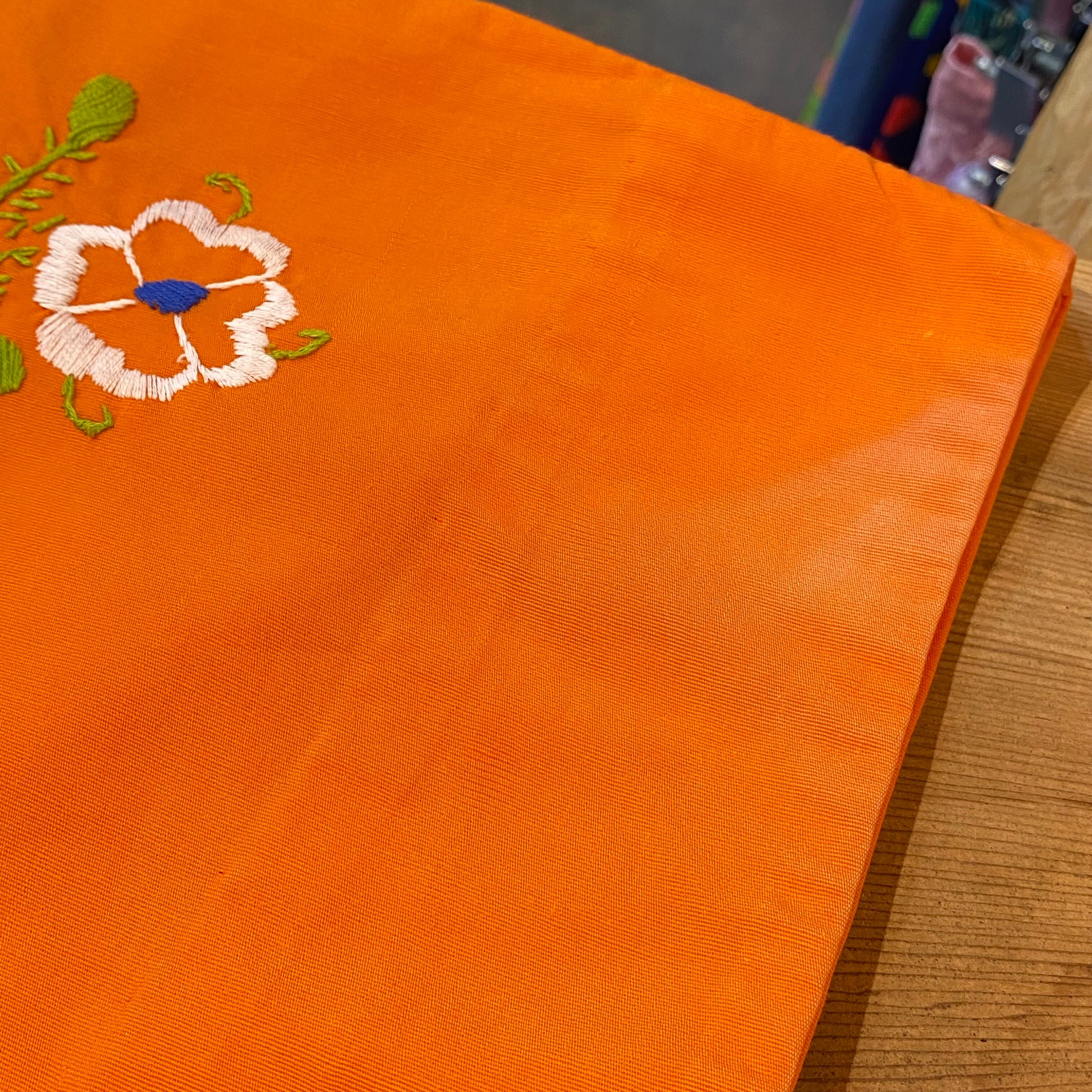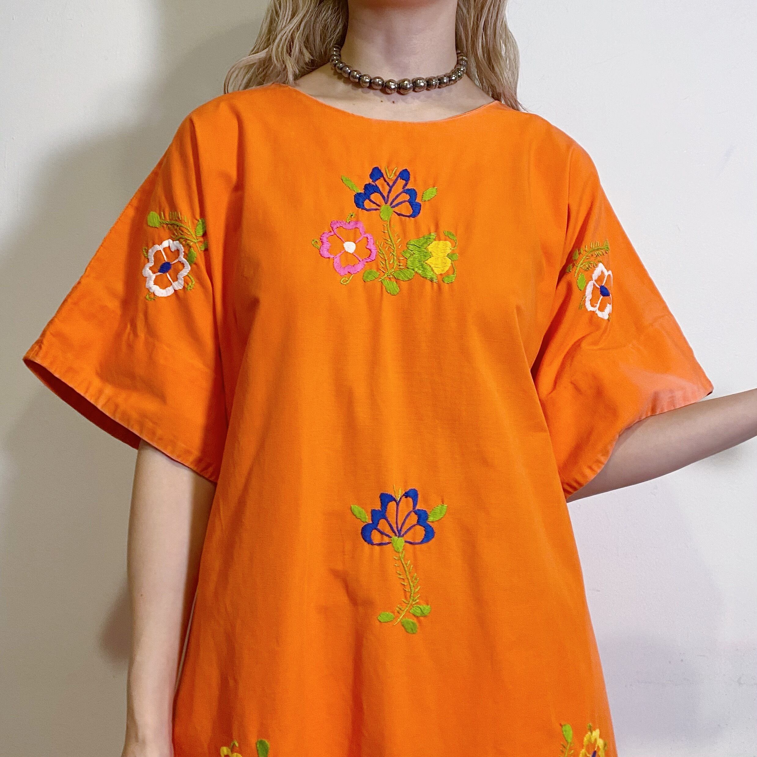 鮮やかなオレンジベースにカラフルなお花の刺繍が可愛い、60年代のワンピースです。
