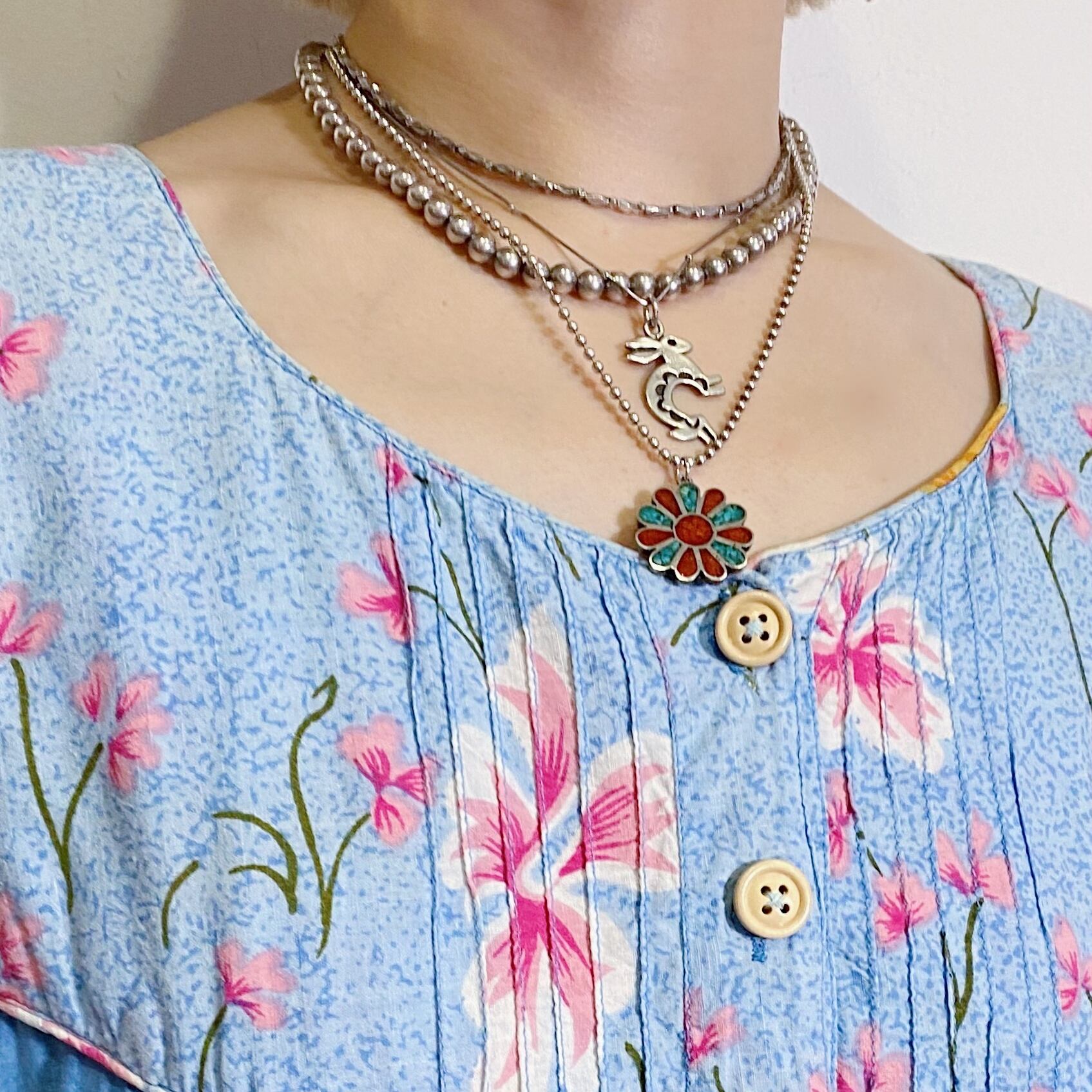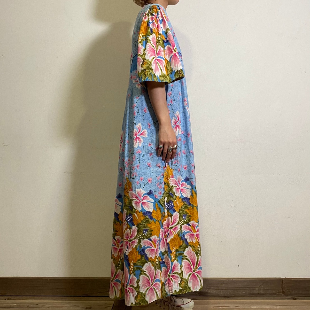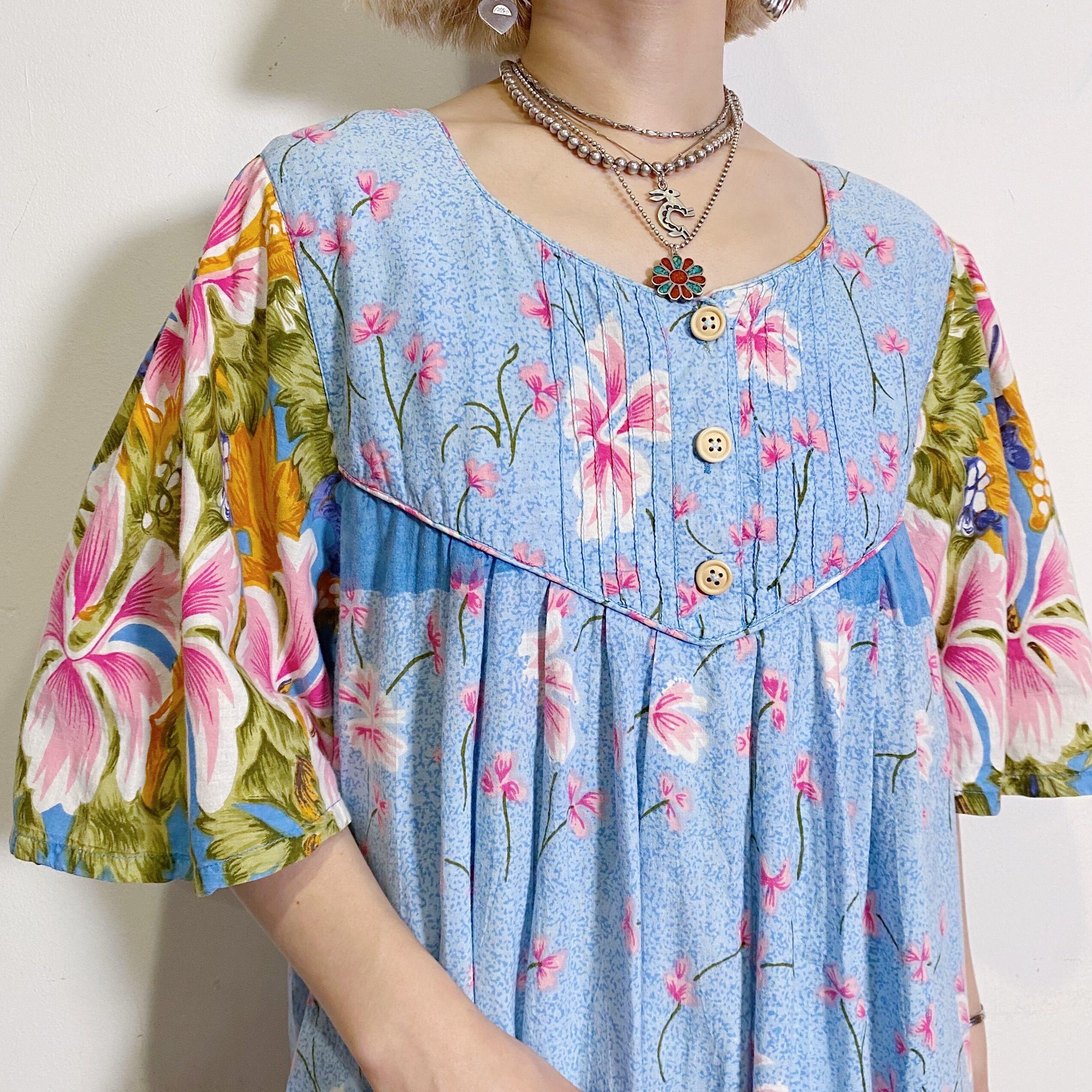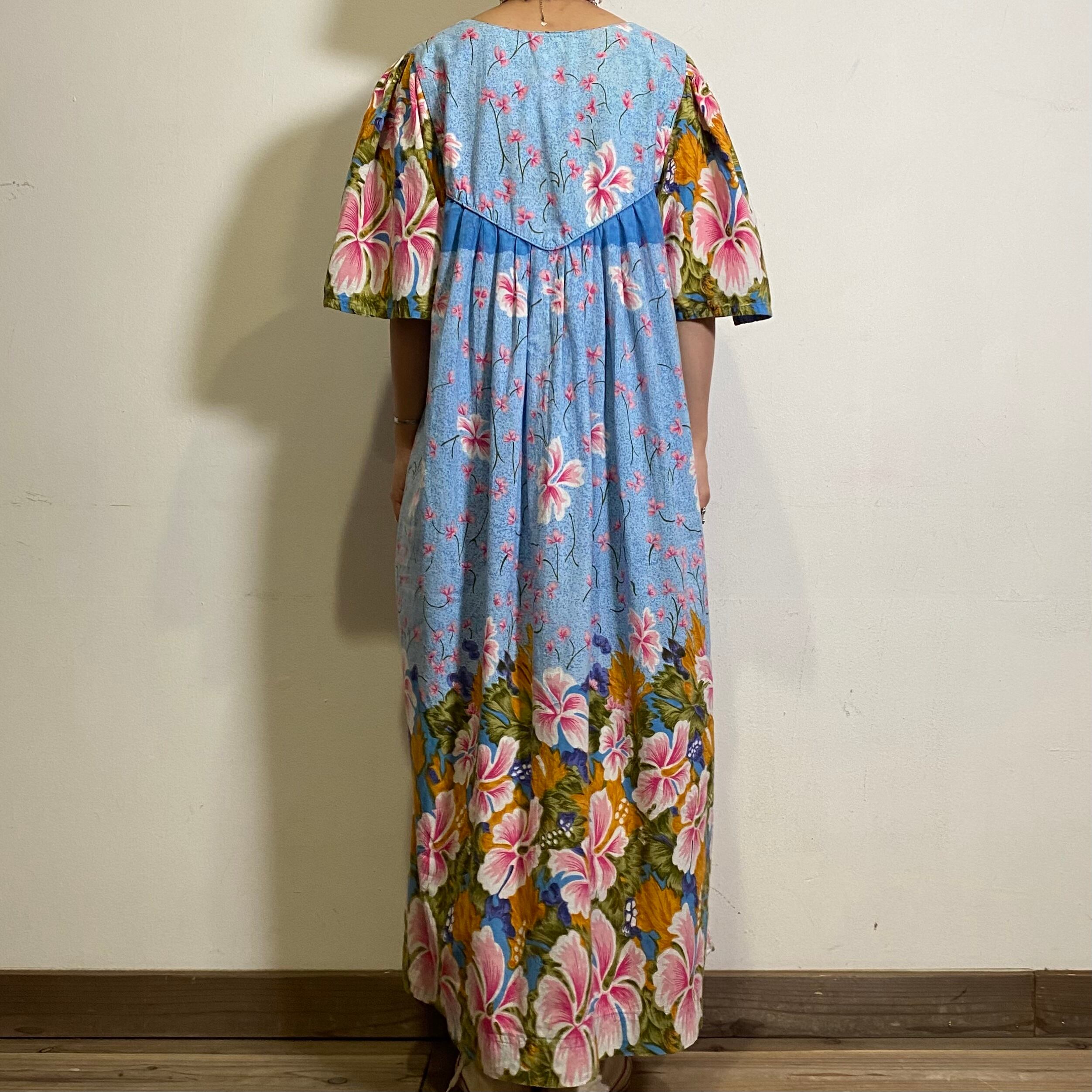 爽やかなサックスブルーベースの花柄が可愛い、90年代のワンピースです。