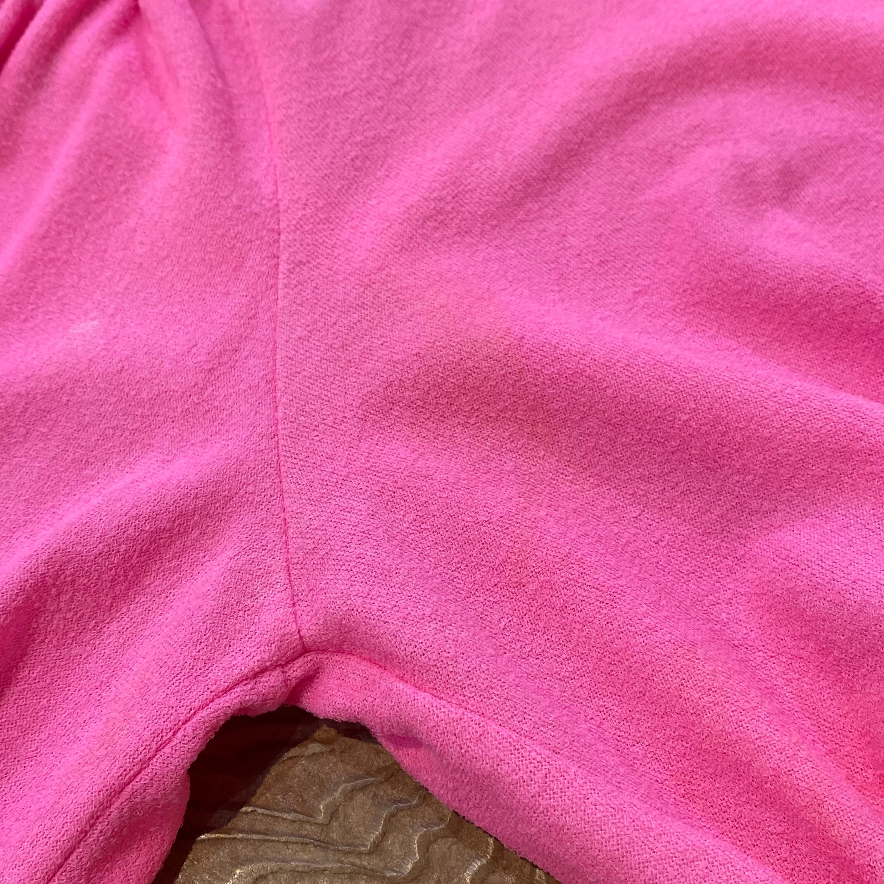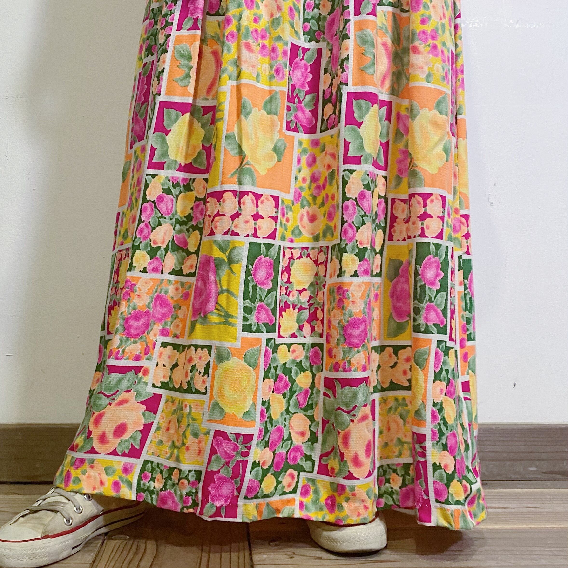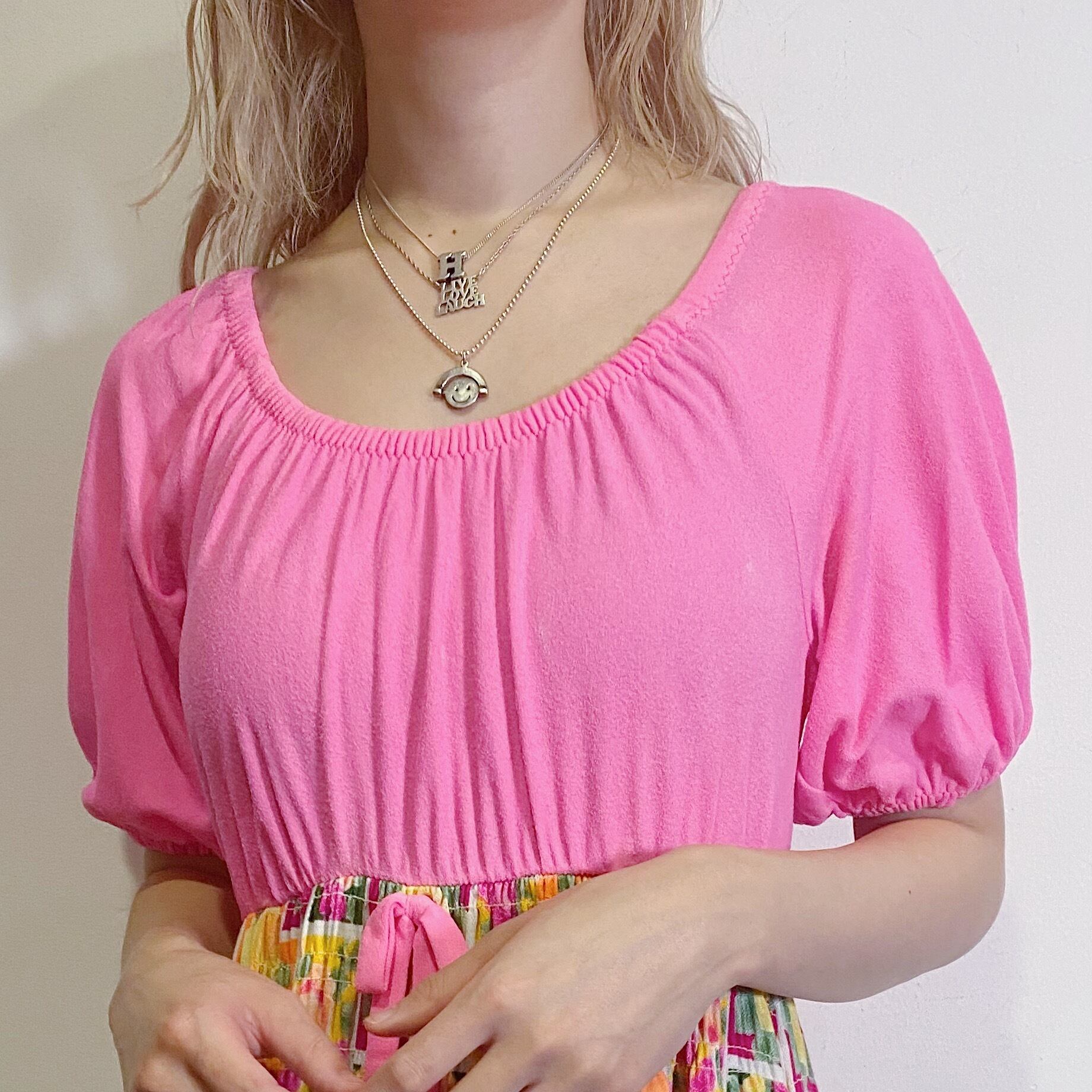 鮮やかなピンクと花柄の切り替えが可愛い、70年代のワンピースです。